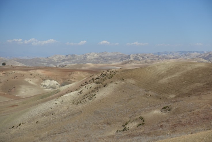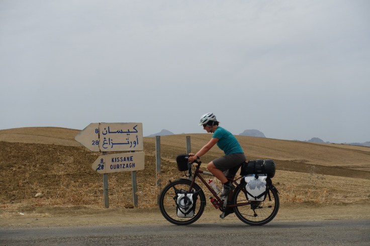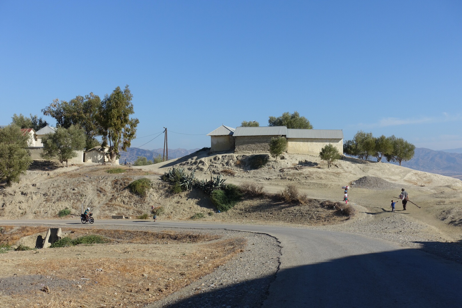 Les réactions des gens au bord de la route ne cessent de nous surprendre, souvent en bien, parfois un peu moins… Les enfants surtout sont une source intarissable de surprises. Ils y a ceux qui nous saluent avec un énorme sourire, ceux qui nous tapent dans la main en guise de bonjour, ceux qui nous courent après sur plusieurs hectomètres ou roulent avec nous avec leurs vélos, ceux plus timides qui n’osent à peine bouger ou nous regarder… Et sinon il y a aussi cette fillette de 7-8 ans qui court comme une folle (mais avec une belle foulée) devant nous (ça monte, on ne roule pas vite) en se retournant de temps à autre avec un regard affolé, jusqu’à ce qu’elle tombe sur un villageois qui lui explique que les touristes ne sont pas des monstres, tout en nous saluant chaleureusement… Ou celui au regard triste qui pousse son vélo roulant à même les jantes… Et enfin les plus voyous qui exigent de l’argent et qui nous insultent en arabe lorsque nous continuons notre chemin ou celui qui prit Sarah en cible avec un caillou… M’enfin ces derniers restent rares et se font bien vite remettre à l’ordre par les adultes! Les adultes justement, ils nous encouragent régulièrement, nous offrent parfois de l’eau ou des légumes!