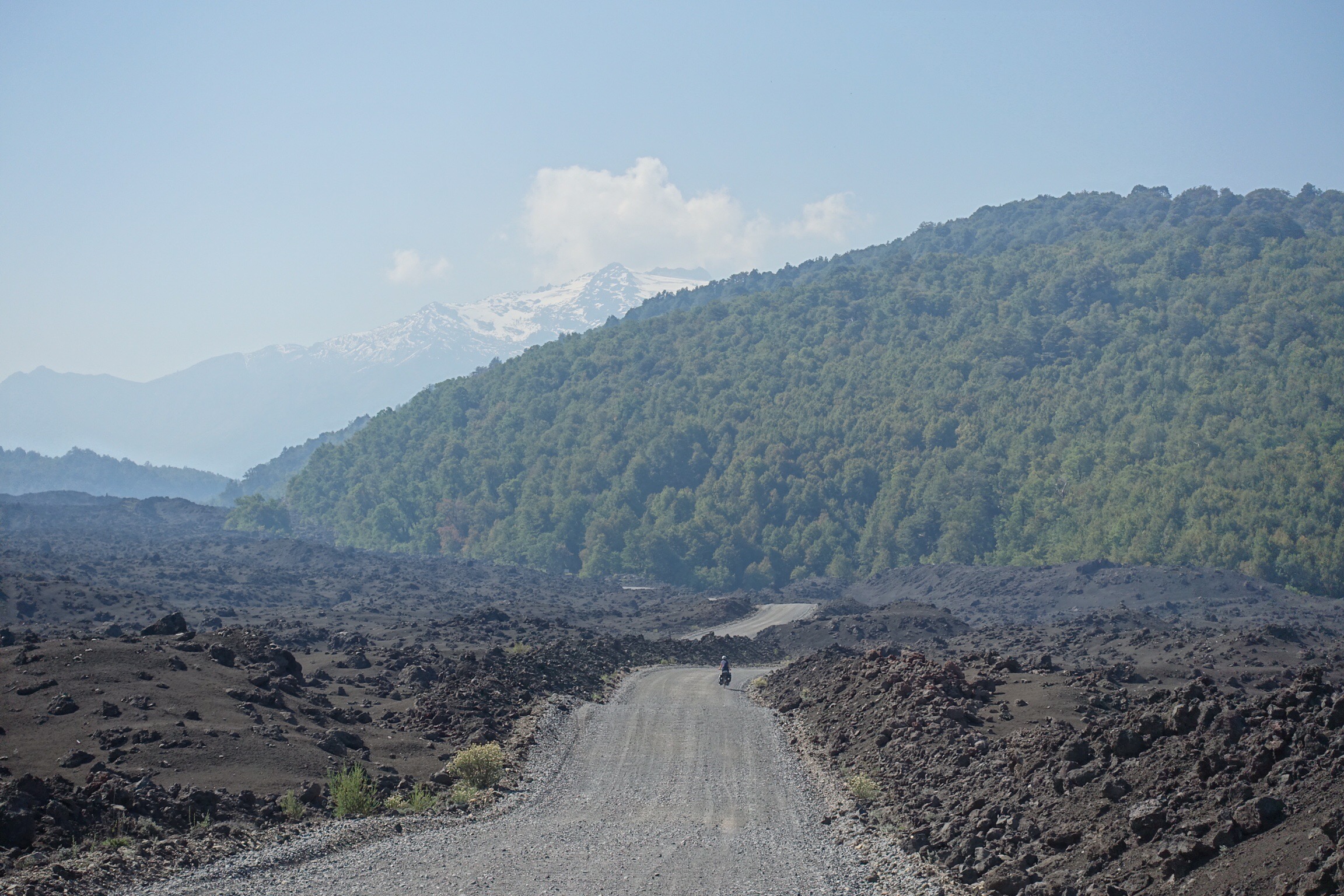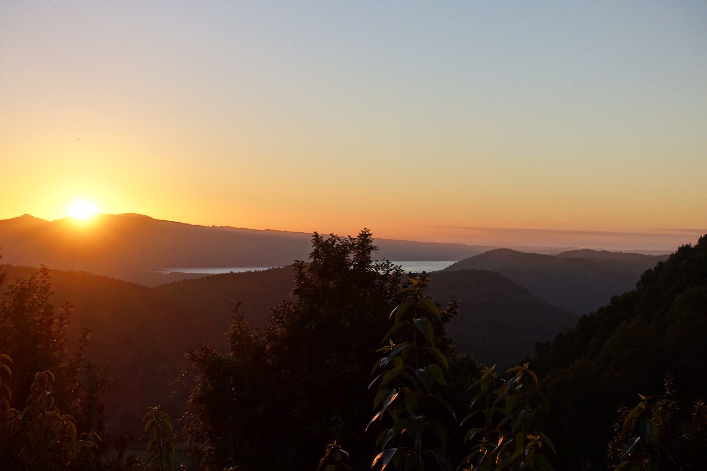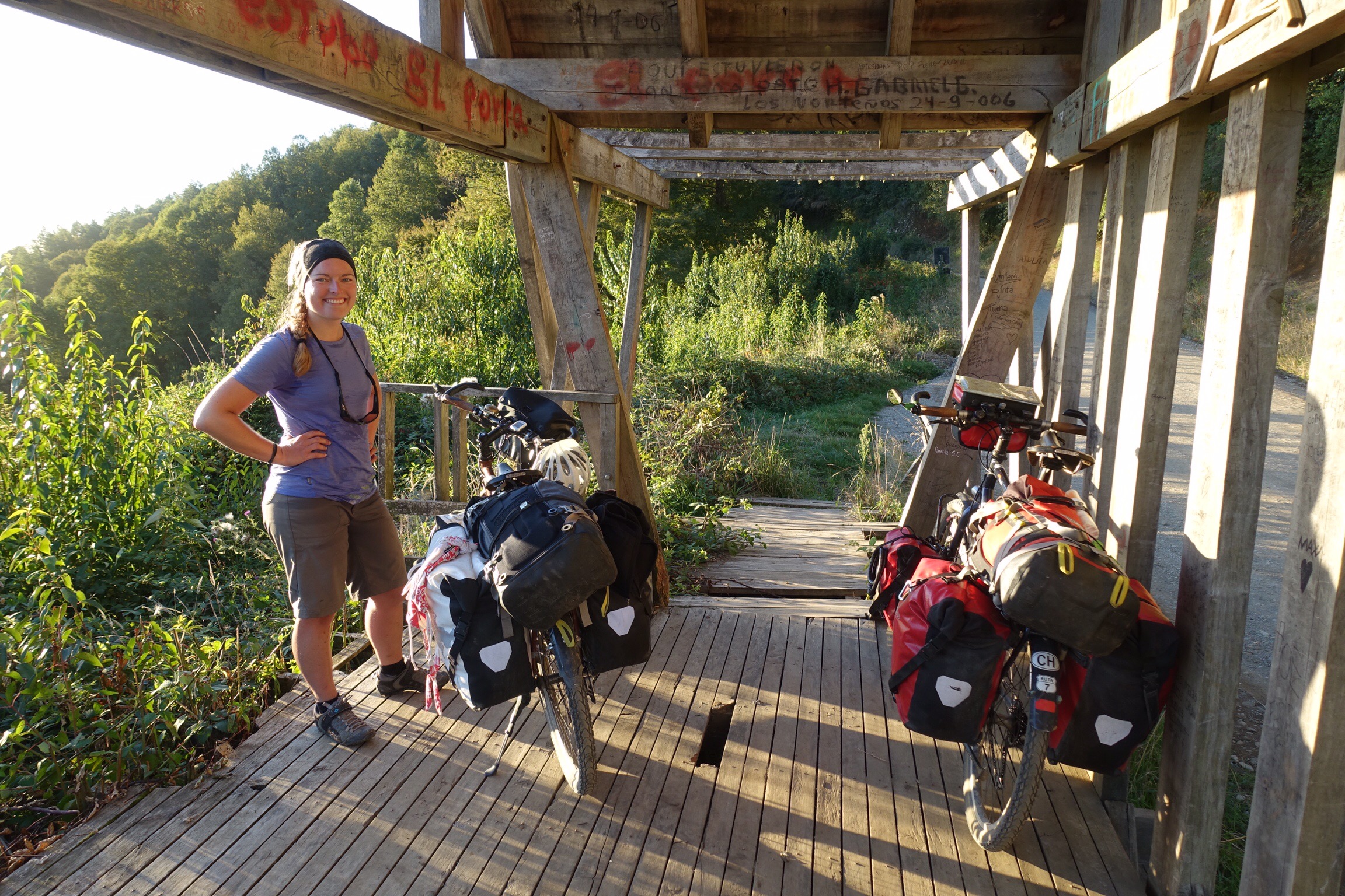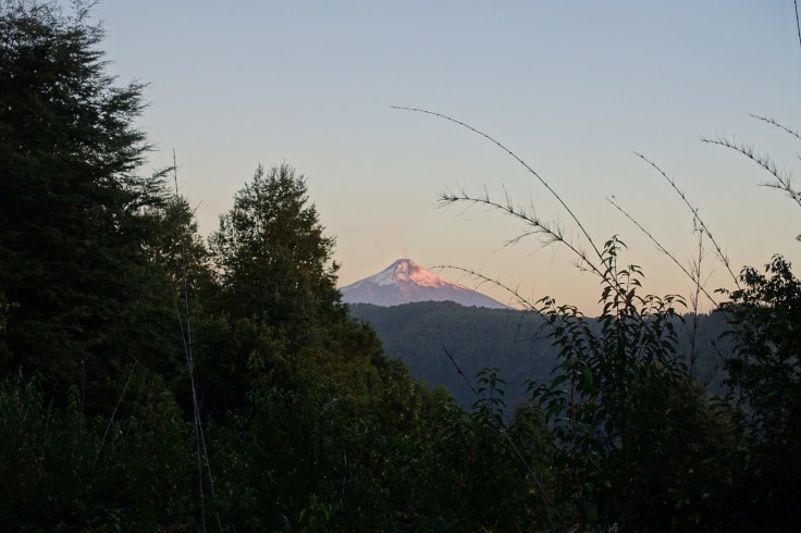 Le deuxième jour, toujours sous un soleil resplendissant, nous passons la frontière et entrons pour la 5ème fois au Chili. Nous connaissons donc la chanson: « il est interdit d’importer des produits frais au Chili! » et mangeons donc tout ce que nous pouvons. Seul un oignon et quelques fruits secs pourraient être incriminés… Je cache le premier dans une chaussure et Arthur prend les raisins dans ses poches. Un peu plus loin, le poste frontière est flambant neuf. Deux douaniers et deux agents du service de l’agriculture attendent que quelqu’un veuille bien passer. Nous remplissons les formalités d’usage et recevons l’ordre d’ouvrir toutes nos sacoches… Toutes?! Ça sent le roussi! Mon oignon pourrait coûter cher. Arthur qui n’a rien à se reprocher, s’empresse d’ouvrir ses sacoches, qui vont être littéralement passées au peigne fin. Chaque sac d’habits, chaque boîte à outils sont contrôlés. Ils iront jusqu’à « googler » tous nos médicaments un à un… Dans les mains d’un douanier beaucoup moins consciencieux, mes sacoches sont à peine ouvertes… La prochaine fois nous ne prendrons pas de risque pour un oignon! Avec tout ça, nous ne sommes pas en avance sur le programme de la journée et la mauvaise piste chilienne ne rend pas la descente tellement aisée. Arthur, dans un crissement de rayons inquiétant, perd même une sacoche avant. Après contrôle, nous voilà rassurés, les rayons n’ont rien, seule une pièce d’adaptation du crochet de la sacoche reste introuvable. Nous la cherchons pendant plus d’une demie-heure sans succès, mais sans trop de conséquence non plus, puisque nous en avons une de rechange. A Liquiñe, la fatigue fait surface et la mention d’un camping thermal nous interpelle. La tentation est trop grande et nous nous arrêtons. Le petit bassin d’eau thermale est parfait pour ce que nous avons et ainsi terminer la journée sur une note positive. Fuyant de plus en plus les endroits très touristiques, nous ne prenons pas la peine de faire l’aller-retour jusqu’à Pucon, mais continuons directement au nord après une bonne pause au bord du lac Villarica. Dans iOverlander, une application interactive pour voyageurs avec des indications sur les spots de campings officiels comme sauvages, nous trouvons la mention d’un belvédère avec possibilité de s’installer pour la nuit. Situé à 32 km et 600 m de dénivelée, nous devrions y être sans problème pour le coucher du soleil. Au début tout va bien, nous voyons filer les kilomètres d’asphalte, puis plus lentement ceux de ripio sans prendre tellement d’altitude… et finissons par prendre peur! Il reste 3 km, 350m à monter et la piste est de plus en plus mauvaise! Nous finirons la journée poussant les vélos dans ces pentes bien raides. Un kilomètre avant le point de vue, nous craquons et ouvrons un paquet de biscuits! Il nous faudra bien ça pour arriver en haut… Mais la vue imprenable sur le Villarica et la vallée vaut son pesant d’or! Nous arrivons au dernier moment pour voir le soleil passer derrière l’horizon et assister au spectacle. Le Mirador du Lago Huilipilún est constitué d’une plateforme couverte, idéale pour camper. D’abord peu motivée par crainte des animaux, Arthur me convainc de laisser tomber la tente. J’accepte, puis me fais une sacrée frayeur. Alors que je soulage ma vessie avant la nuit, un pudu entre dans le faisceau de ma lampe frontale. Accroupie, il me semble être une bête énorme et je prends peur, avant de me rendre compte de l’erreur! Au final, il a dû être encore plus inquiété que moi. Nous rigolons donc un bon coup et nous couchons sous le beau ciel étoilé!