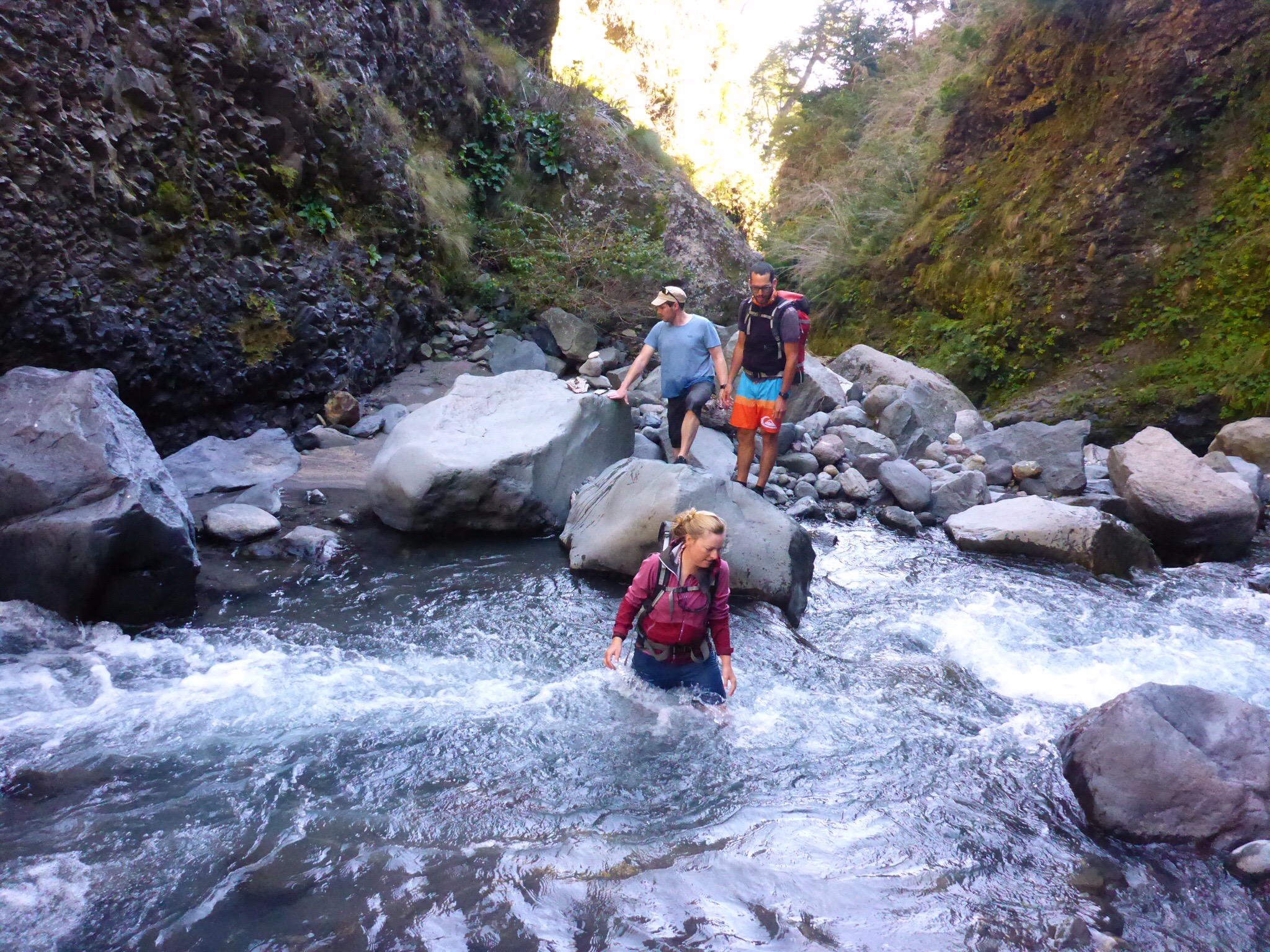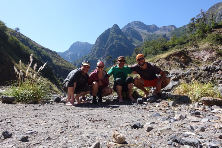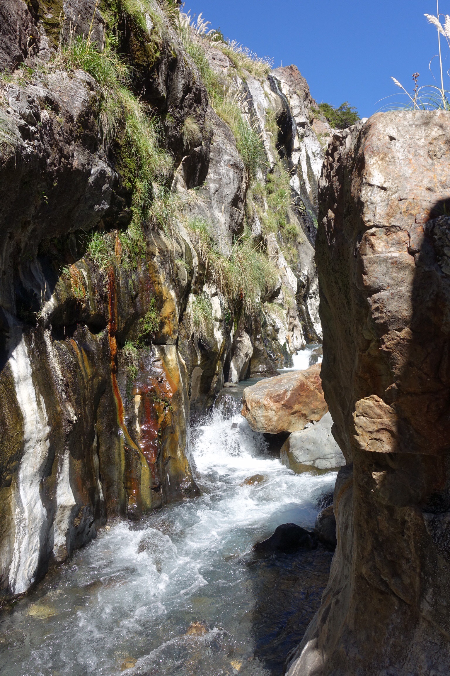A Melipeuco, le « CH » collé sur le pare-boue d’Arthur nous attire à nouveau de bonnes grâces. Nous sommes repérés par Michi et Edy et ainsi, commence l’aventure. Edy, de père suisse et mère argentine a décidé de s’installer au Chili avec son frère il y a 5 ans. Sur leur terrain de 120 hectares, ils ont déjà construit leur maison et un hangar pour les machines à la force du poignet. Petit à petit, d’autres idées pour l’exploitation voient le jour: planter des arbres à maqui ou à avellanas, noisettes chiliennes très prisées ici. Michi, un copain d’enfance, profite de ses vacances pour lui rendre visite. Ils se sont déplacés jusqu’ici pour remonter une rivière et atteindre la source d’eau chaude dite geyser de Alpehue. A les entendre: une expérience inoubliable! En attendant, ils nous prennent sous leurs ailes. Pas besoin de monter la tente ce soir, nous sommes invités à partager leur cabaña, petite maison louée dans les campings. Le lendemain, nous partons tous ensemble dans la bagnole d’Edy, une vieille Suzuki Samurai. Son frère, déjà venu il y a quelques temps, à donné des indications assez précises pour trouver le départ du chemin, ce qui ne nous empêchera pas de nous tromper une fois avant d’atteindre le point d’accès à la rivière. Très vite, il faut entrer dans l’eau, le chemin passant d’une rive à l’autre en permanence. Et là déjà, 7 km environ en aval de la source, la température de l’eau et très agréable ;-)! Le cheminement est facile à trouver tant il y a de cairns, mais nous avons tout de même l’impression d’être seuls au monde et nous prenons rapidement pour les explorateurs d’un nouvel univers. Les paysages sont grandioses, la roche fume de part et d’autre de la rivière et révèle des couleurs extraordinaires. Plus nous montons, plus l’eau se réchauffe, jusqu’à atteindre la source. Là, des sortes de bassins ont été aménagés à l’aide de cailloux, mais nous n’en profiterons pas beaucoup tant l’eau est brûlante. Edy est un peu pressé par le temps, organisation de l’asado (nom désignant les monstres grillades organisées au Chili comme en Argentine) du lendemain oblige… Mais, comme tout bon Argentin, accepte de boire encore un maté dans ce cadre idyllique, avant de redescendre. Une journée définitivement inoubliable!
