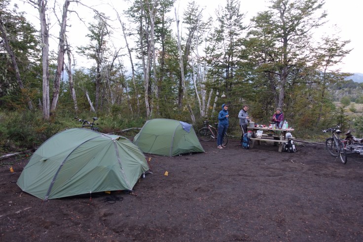 A Frutillar, nous tombons sur une charmante loueuse de vélos, qui nous indique une auberge à Puerto Octay, faisant office de camping pour les cyclovoyageurs. Et en effet sur la façade de l’auberge Triwe, la mention « bike friendly » écrit en grand, semble de bon augure pour la suite :-). Grand bien nous a pris de nous arrêter ici. Nous sommes accueillis avec beaucoup de bienveillance. Les chambres sont trop chères pour nous, mais les propriétaires autorisent les voyageurs à vélo (et uniquement à vélo) à s’installer dans leur jardin! Fernando, le patron, nous propose même de cuisiner à l’intérieur malgré la petite table prévue à l’extérieur à cet effet… A l’heure du souper, nous débarquons donc dans la cuisine, où Claudia s’affaire déjà. Elle ne semble pas au courant des propositions de son mari et peu encline à nous laisser son royaume… Mais bon, elle ne peut pas revenir sur une décision de son homme. Finalement, elle nous adopte et prend les choses en main! Elle récupère nos pâtes et notre sauce tomate, rajoute du crabe et des crevettes et cuisine pour nous quatre. Le tout agrémenté par une bonne bouteille de vin. Nous passons une excellente soirée! Le lendemain nous faisons partie de la famille… Claudia nous laisse libre accès à sa cuisine, nous met sa machine à laver à disposition et nous cuisine du saumon pour le dîner en échange d’accueillir deux Allemands à l’auberge, pendant qu’elle amène Fernando à l’aéroport! Ainsi nous passons deux jours très agréables à Puerto Octay et repartons totalement requinqués.