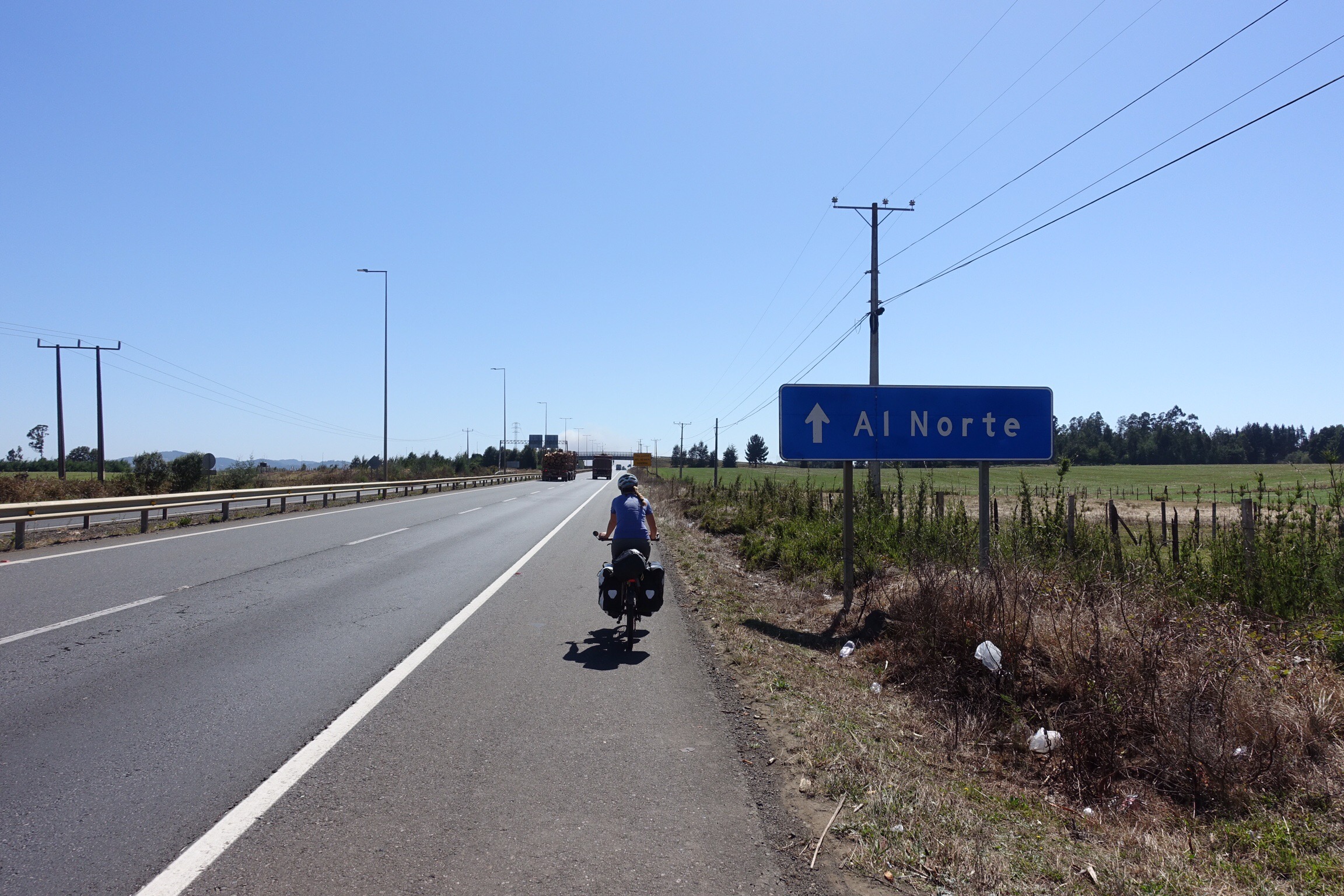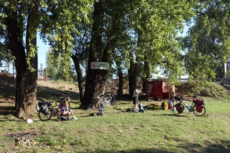 Conguillio sonne la fin de notre remontée à l’ouest de la route 5, autoroute traversant le Chili du Nord au Sud. Pour continuer notre progression vers le Nord, nous virons complètement de bord et traversons le pays jusqu’à Concepción et la côte pacifique. Cette région beaucoup moins touristique va nous compliquer un peu la tâche. Malgré leurs noms enchanteurs (comme la route du bois), les routes sont surchargées de camions et les bas-côtés sont en mauvais état ou tout simplement inexistants. Les campings aussi se sont raréfiés et il faut faire preuve d’inventivité pour trouver des endroits, où planter nos tentes. Ainsi, un soir, après avoir demandé à quatre reprises un coin de jardin, on nous indique une plage publique, au bord d’un cours d’eau traversant Angol. L’endroit n’a pas tellement de charme mais nous pouvons nous décrasser dans la rivière et passons une bonne soirée tous les quatre! La nuit, par contre ne fut pas de tout repos, un rodéo de bagnoles s’étant improvisé sur la route à proximité de nos tentes…