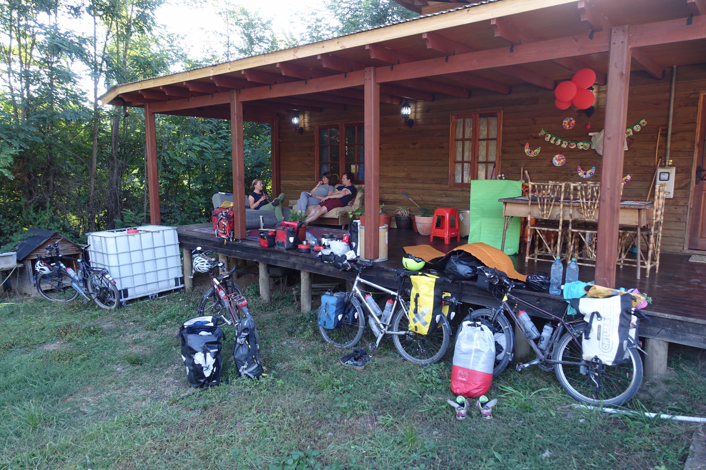 Le lendemain, l’heure de se poser approchant, nous cherchons une petite place pour nous installer. Il nous faut aussi de l’eau! Nous tentons d’abord notre chance dans une forêt aux abords d’un cimetière, pensant qu’il y aurait un peu d’eau courante pour un brin de toilette! Comme ce n’est pas le cas nous reprenons la route! Un peu plus loin une pancarte « hosteria » attire notre attention! La propriétaire nous explique qu’il n’y a pas de chambres ici mais que nous pouvons camper en contre-bas. Nous nous empressons d’aller voir. Il y aurait bien un peu de place, mais nous lorgnons quand même l’herbe de la voisine lorsque celle-ci sort de sa maison. Patricia est en fait la fille de la patronne de l’hosteria et nous propose tout naturellement de nous installer chez elle. Dans son jardin, se trouve même une piscine. Ça remplacera la douche! Elle la videra le weekend qui vient nous dit-elle. Pas de problème si nous rendons l’eau trouble! Pendant notre baignade, Patricia nous prépare encore des jus de myrtilles puis s’en va avec son fils, nous laissant sa maison à disposition. Finalement nous nous installons confortablement sous son avant-toit, sans tente, les quatre matelas côte à côte. Nous n’aurons pas eu beaucoup de temps pour discuter avec elle, mais aurons reçu une telle énergie positive qu’il sera facile d’arriver à Concepción.