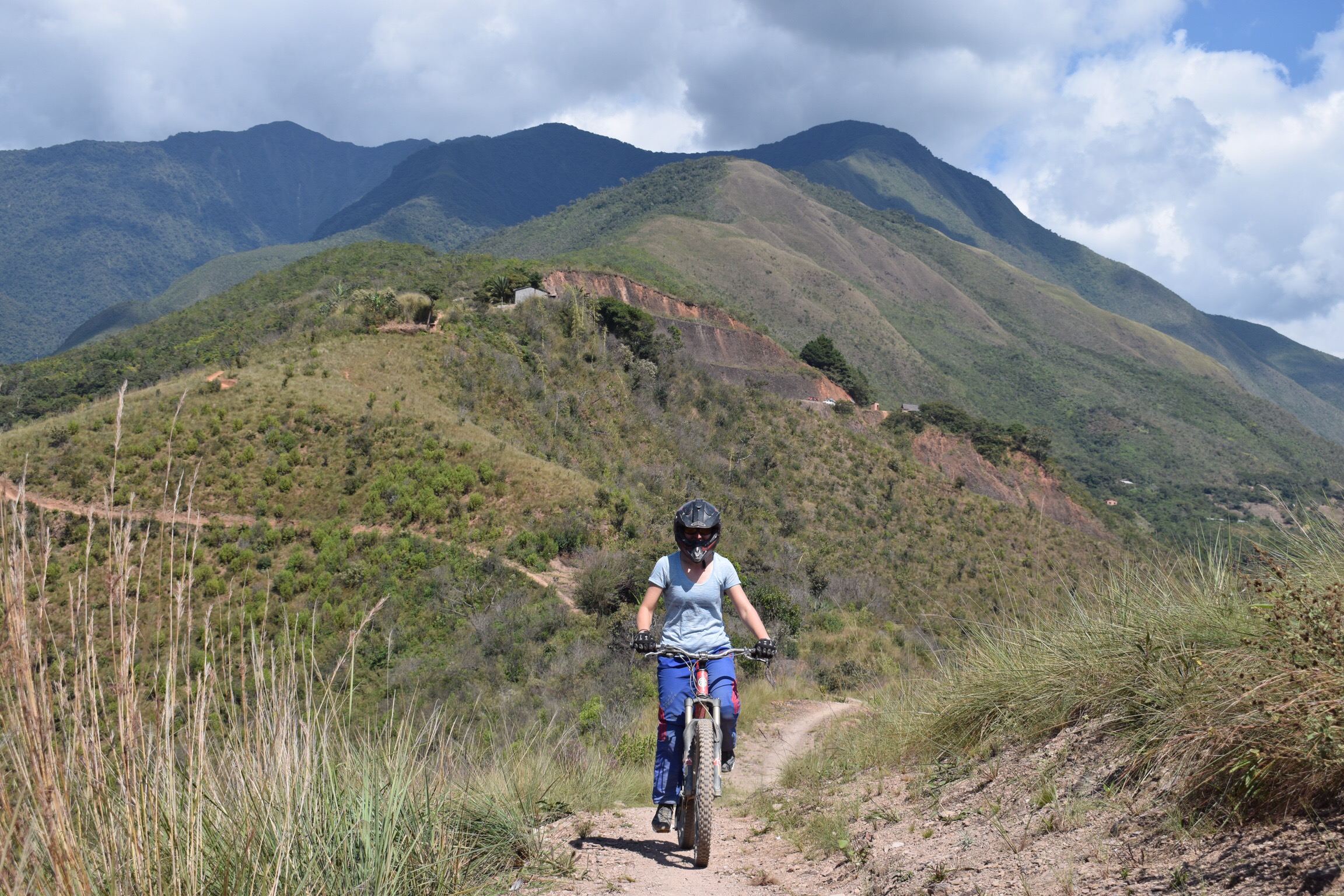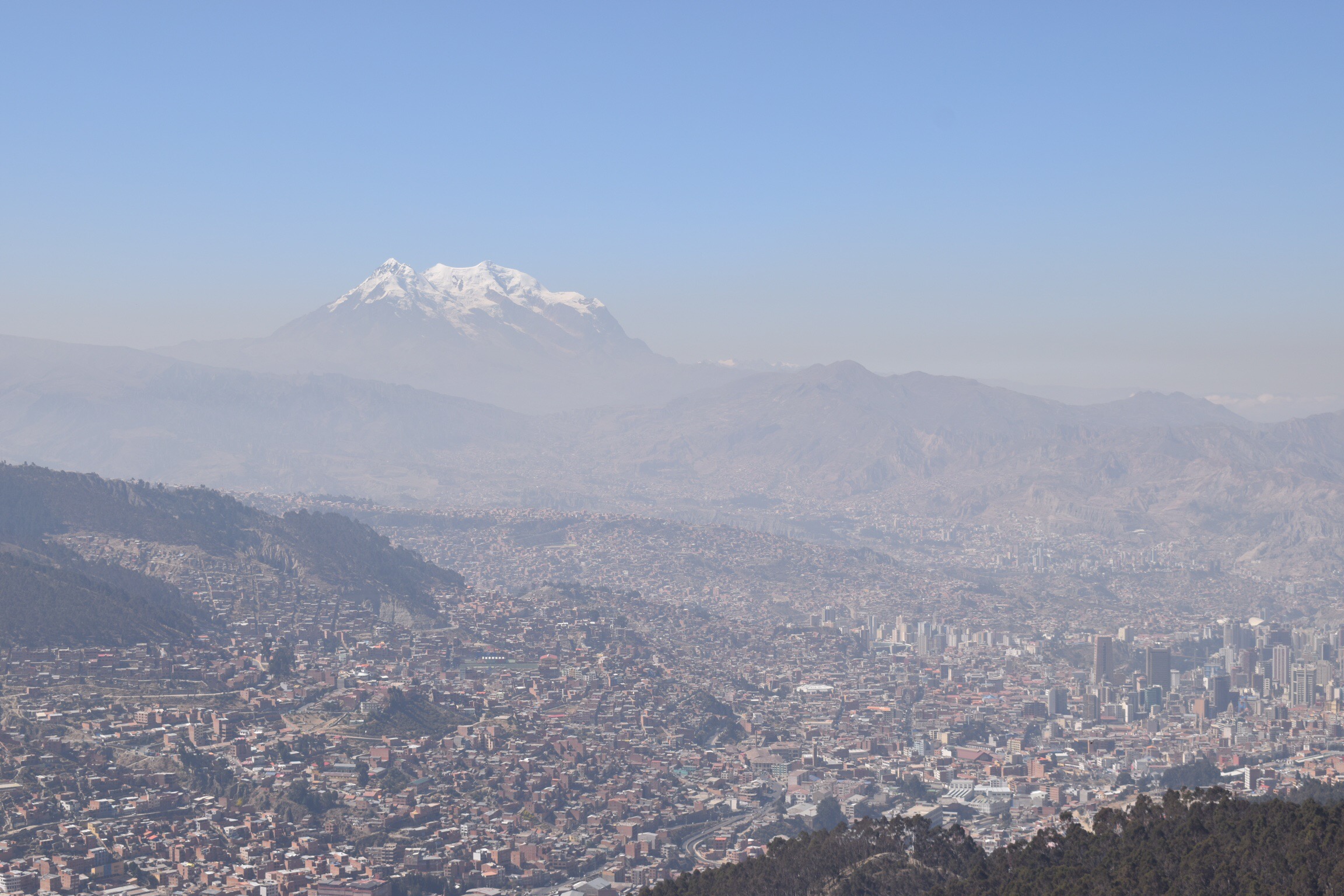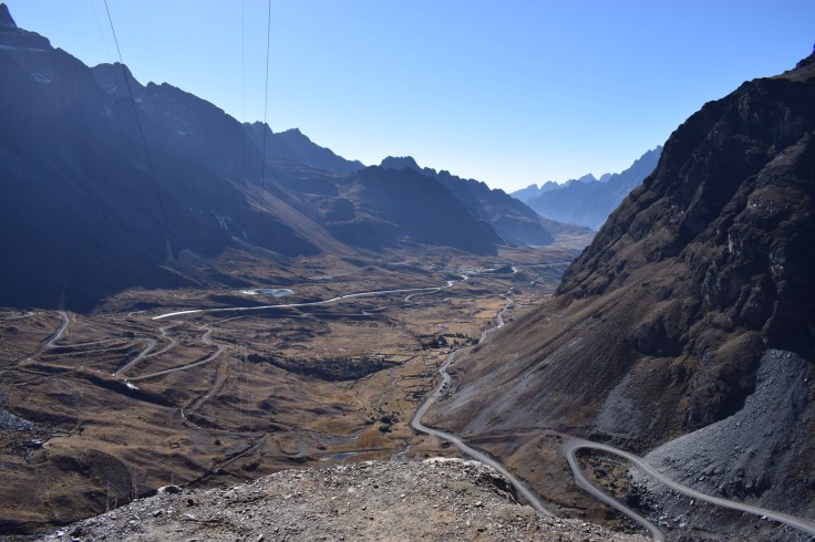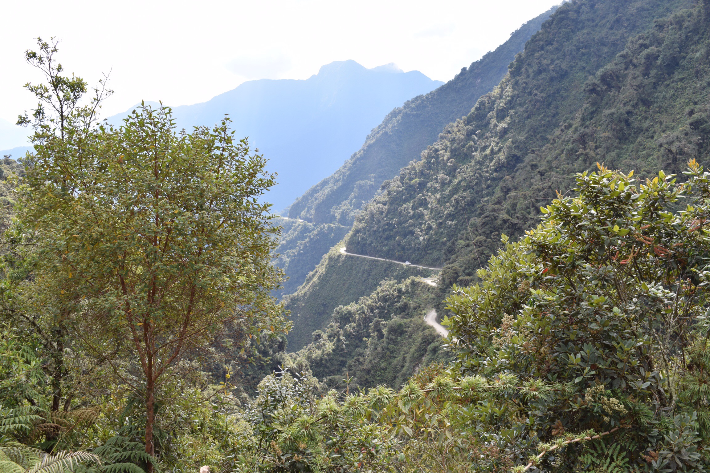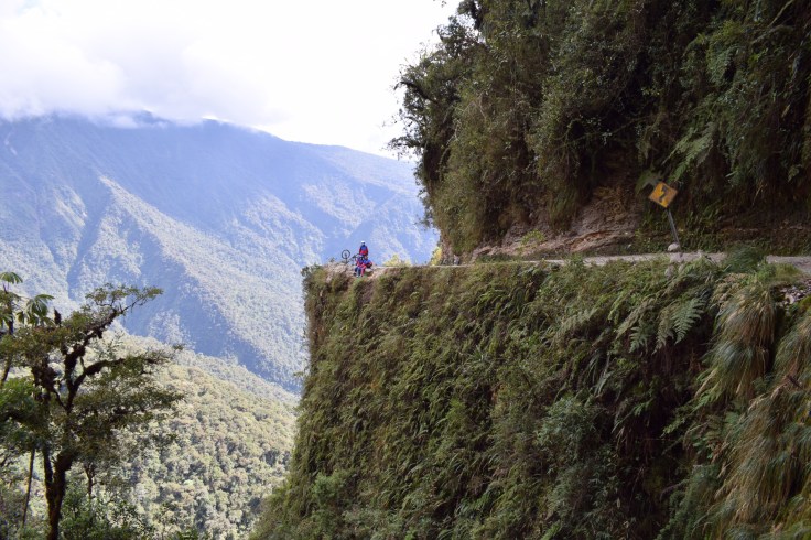 Pendant que Robin et Ivette s’en vont pour le Chachacomani, nous arpentons enfin la ville en touristes, découvrons la jolie place Murillo, les environs de la ruelle Jaen et l’architecture soignée de leurs bâtisses coloniales, prenons le téléphérique et profitons de la nourriture variée des cafés inventifs rencontrés sur notre passage. Influencés par les autres cyclistes de la casa nous prenons aussi rendez-vous avec la fameuse Death Road. Cette route à flanc de coteau part de la Cumbre (environ 4660 mètres), un col désertique au dessus de La Paz et descend sur 60 kilomètres jusqu’aux Yungas verdoyants à environ 1100 mètres. Pour une fois, nous laissons le soin de l’organisation à une agence et ainsi profitons d’un VTT tout suspendu pour cette longue descente. En petit groupe, puisque seul Paul-Samuel, un franco-américain, complète notre équipe, nous avançons rapidement, uniquement ralenti par les multiples photos de notre guide Albaro. Heureusement celui-ci se rend rapidement compte que les photos ne nous intéressent pas outre mesure. Nous, nous voulons descendre! C’est donc à toute allure que nous parcourons cette route escarpée construite durant la guerre du Chaco (années 30) par les prisonniers paraguayens. Bouquet final: nous prenons un raccourci en single trail sous l’œil ravi d’Albaro.