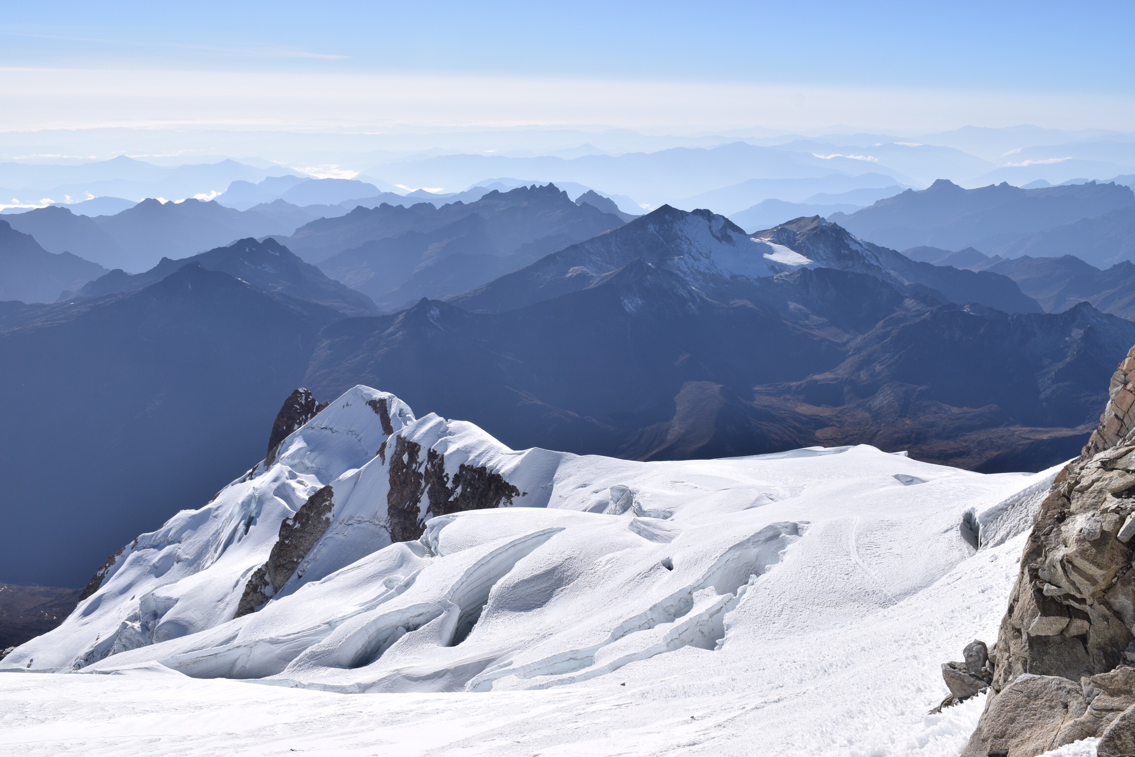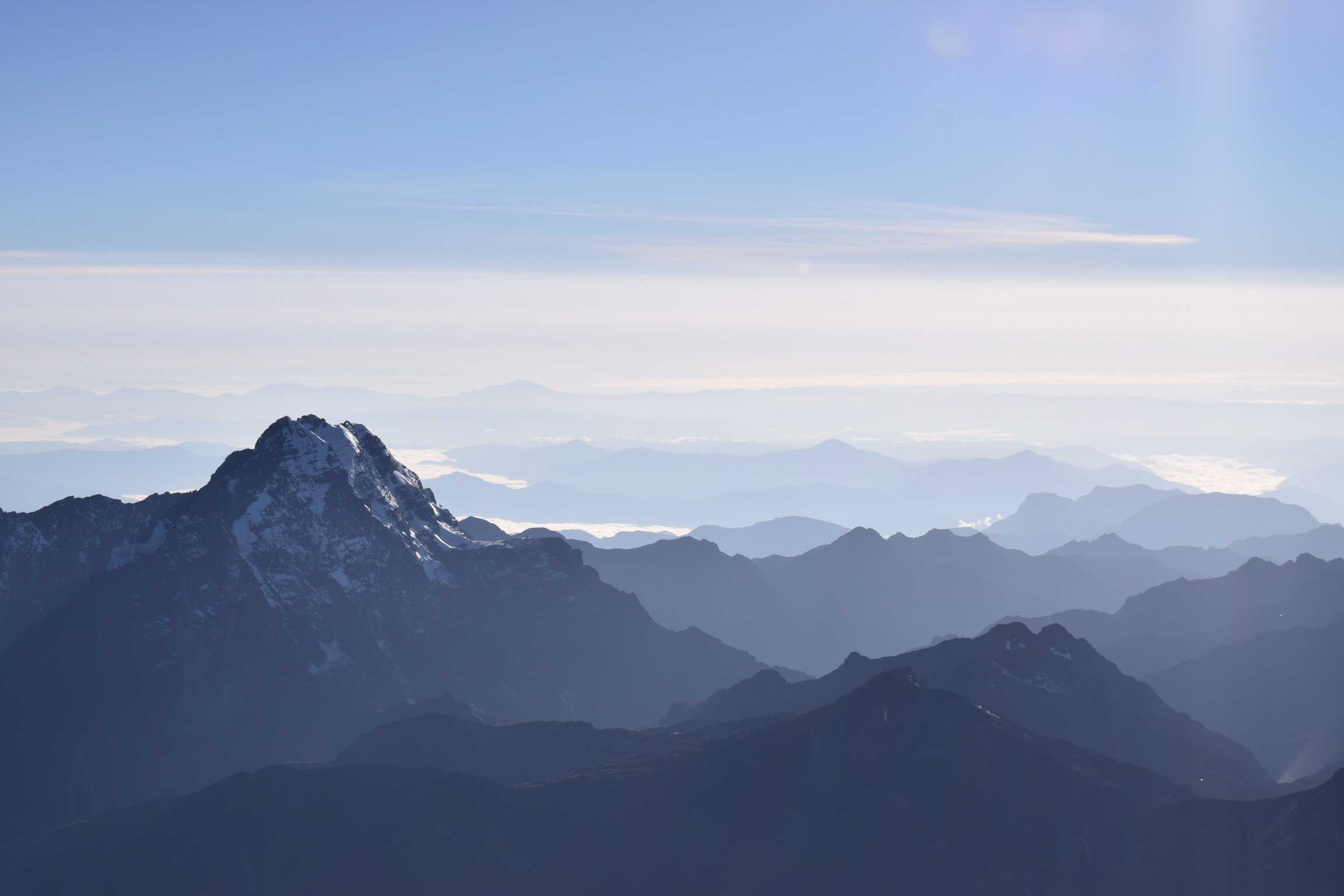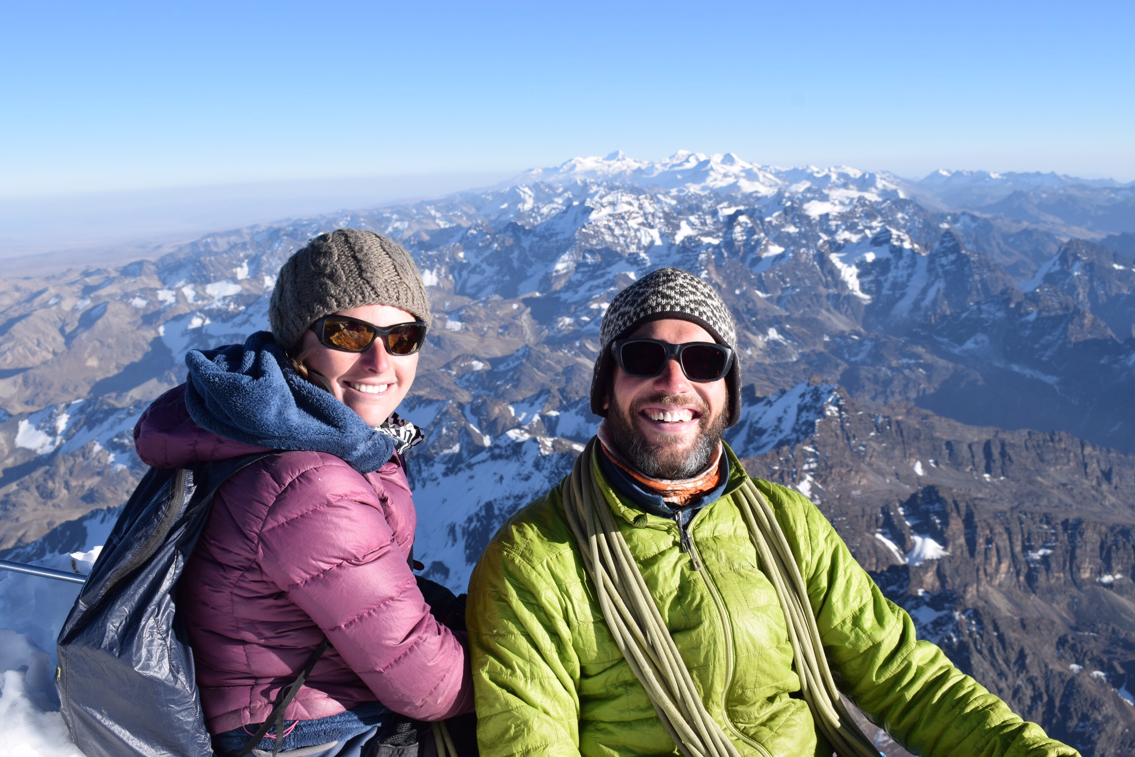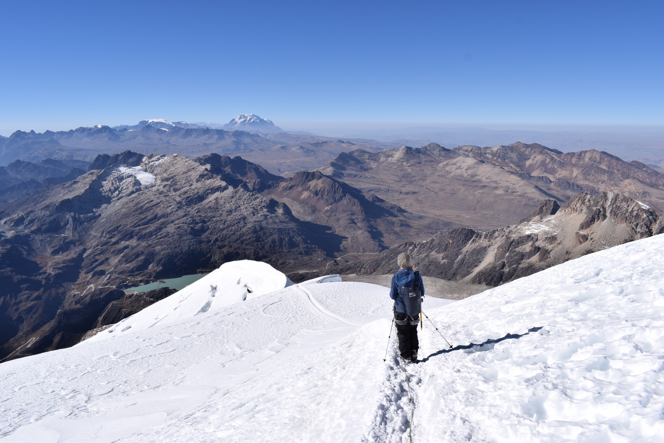 Quatre jours ont déjà passés et nous n’avons gravi aucune montagne, uniquement profité de quelques bons cafés. Il est grand temps de se bouger! Un tour au magasin du Grison Christian Menn, loueur de matériel préféré des guides de La Paz, et nous voilà fin prêts pour l’ascension du Huayna Potosi (6088m). Après une nuit d’âpres combats avec Morphée au refuge situé à 5250 mètres, nous laissons les nombreux groupes prendre de l’altitude avant de nous élancer à leur suite à 3h du matin. L’altitude se fait bien sentir mais nous avançons au rythme des escargots et arrivons bientôt au pied de l’arête sommitale. Les guides redescendent gentiment, encadrant leurs brebis souvent inexpérimentées, nous laissant en tête-à-tête avec le sommet et sa vue à 360 degrés s’étalant du lac Titicaca à El Alto, quartier de La Paz encore situé sur l’Altiplano en passant par les Yungas, derniers reliefs avant l’Amazonie. Grandiose!