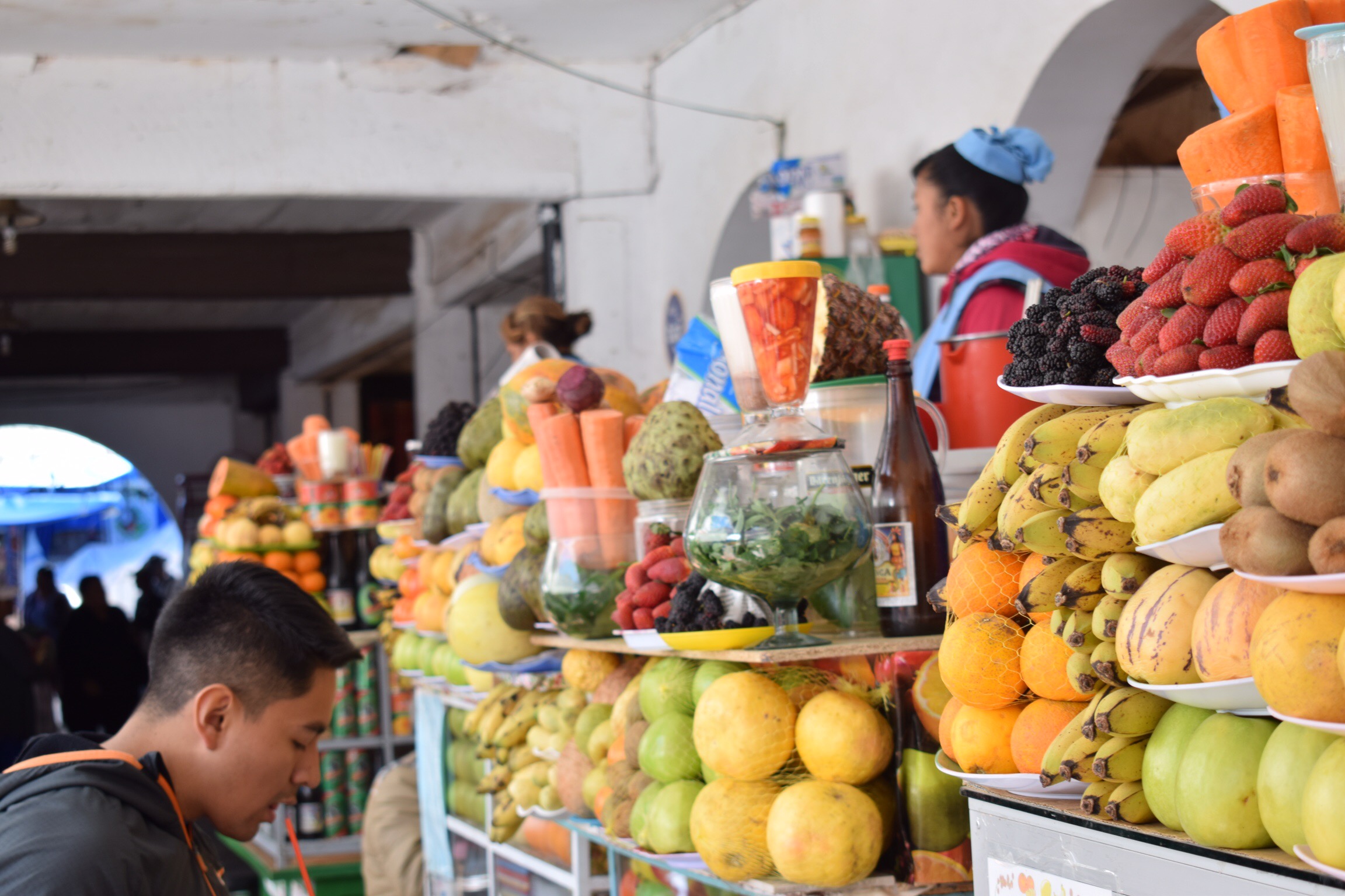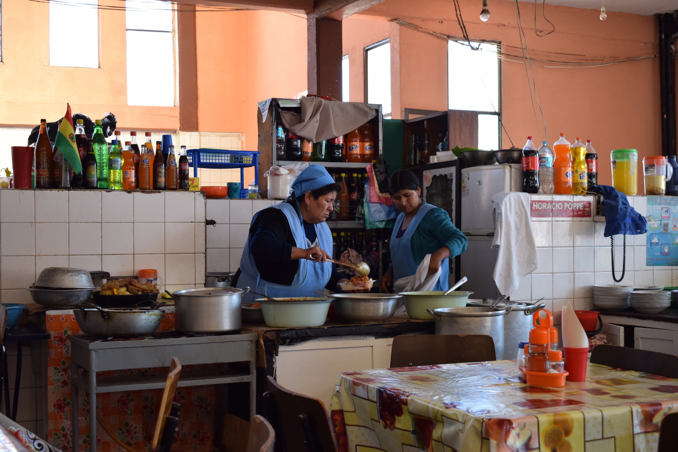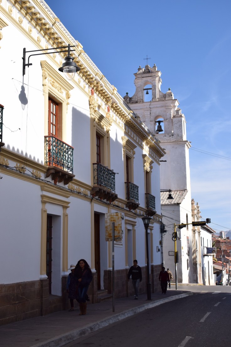 À Sucre, en plus d’apprécier la flânerie dans les charmantes ruelles coloniales de la ville, nous nous laissons aller aux plaisirs de la table. Pour bien commencer la journée, nous nous régalons de l’incroyable déjeuner du Kultur Berlin, auberge de jeunesse de très bon rapport qualité-prix, où nous nous payons le luxe de renier les dortoirs toussotants pour la modique somme de 10 CHF/pers. Puis nous arpentons les cantines et marchés afin de goûter à la cuisine locale et surtout aux jus de fruits savamment préparés par des femmes souriantes comme Silvia. Finalement en fin d’après-midi lorsqu’un petit creux se fait sentir, nous nous rendons à la boutique de chocolat Para Ti pour un délicieux chocolat chaud, voire froid. Vous l’aurez compris, nous prenons du bon temps. Il fait doux jusqu’au soir, les arbres ont repris leurs droits et les rues invitent à s’y perdre sans autres obligations que d’apprécier l’architecture et les murs blanchis à la chaux. Sucre est aussi le berceau de l’Indépendance bolivienne et les musées de qualité jouxtant la place principale nous en apprennent plus sur les parcours de Simón Bolívar et son ami Antonio de Sucre, libérateurs de l’Amérique du Sud.