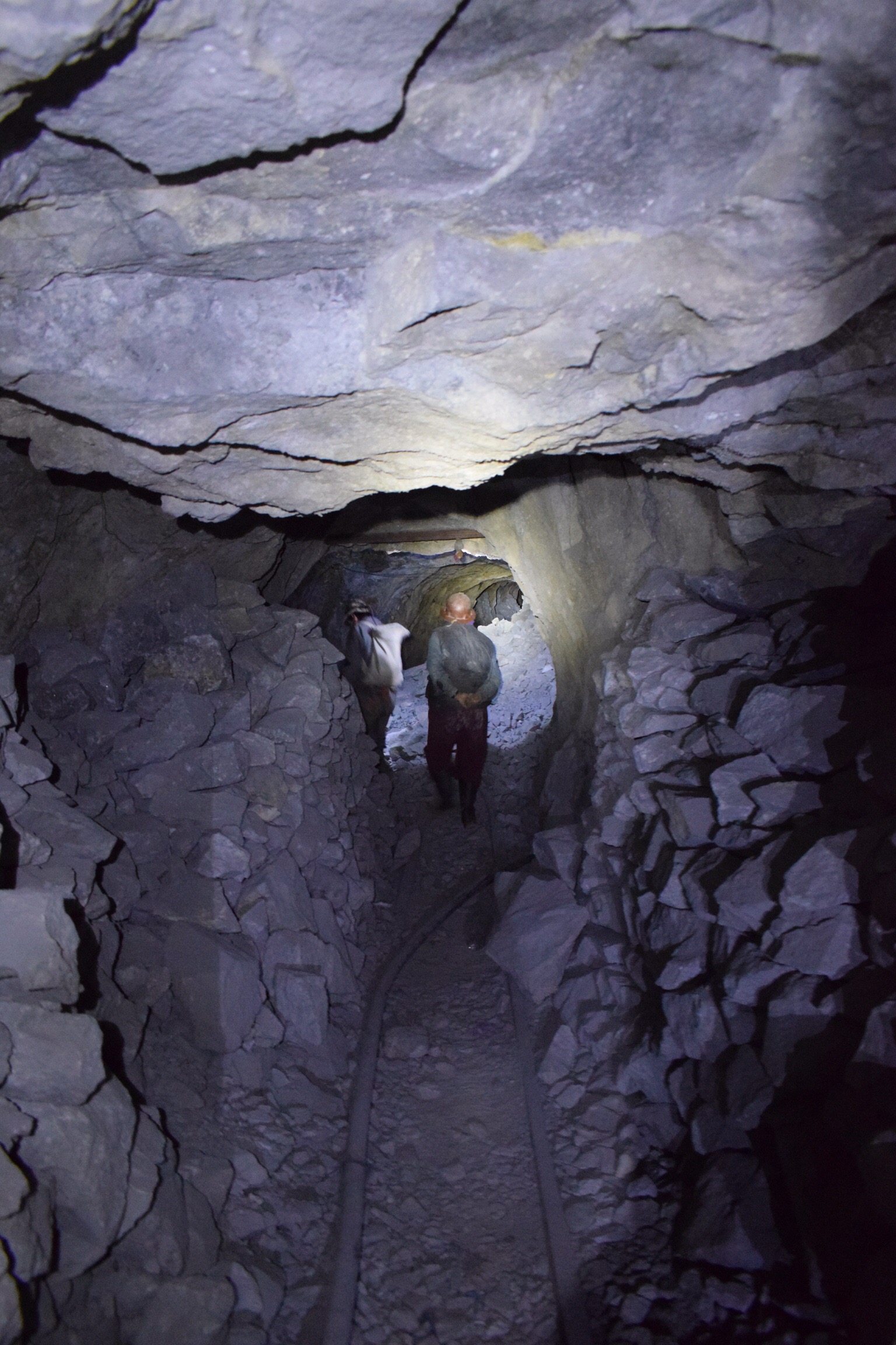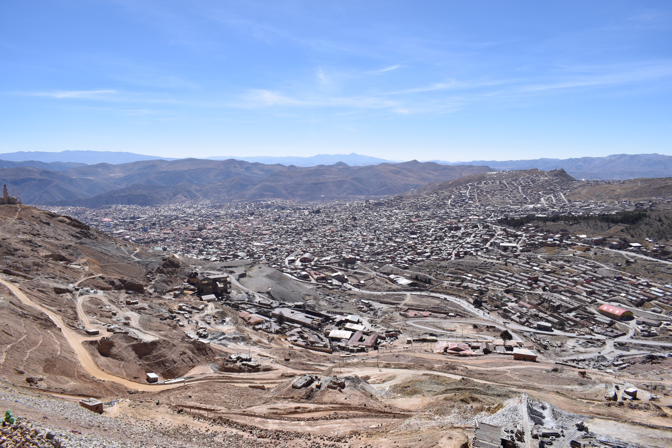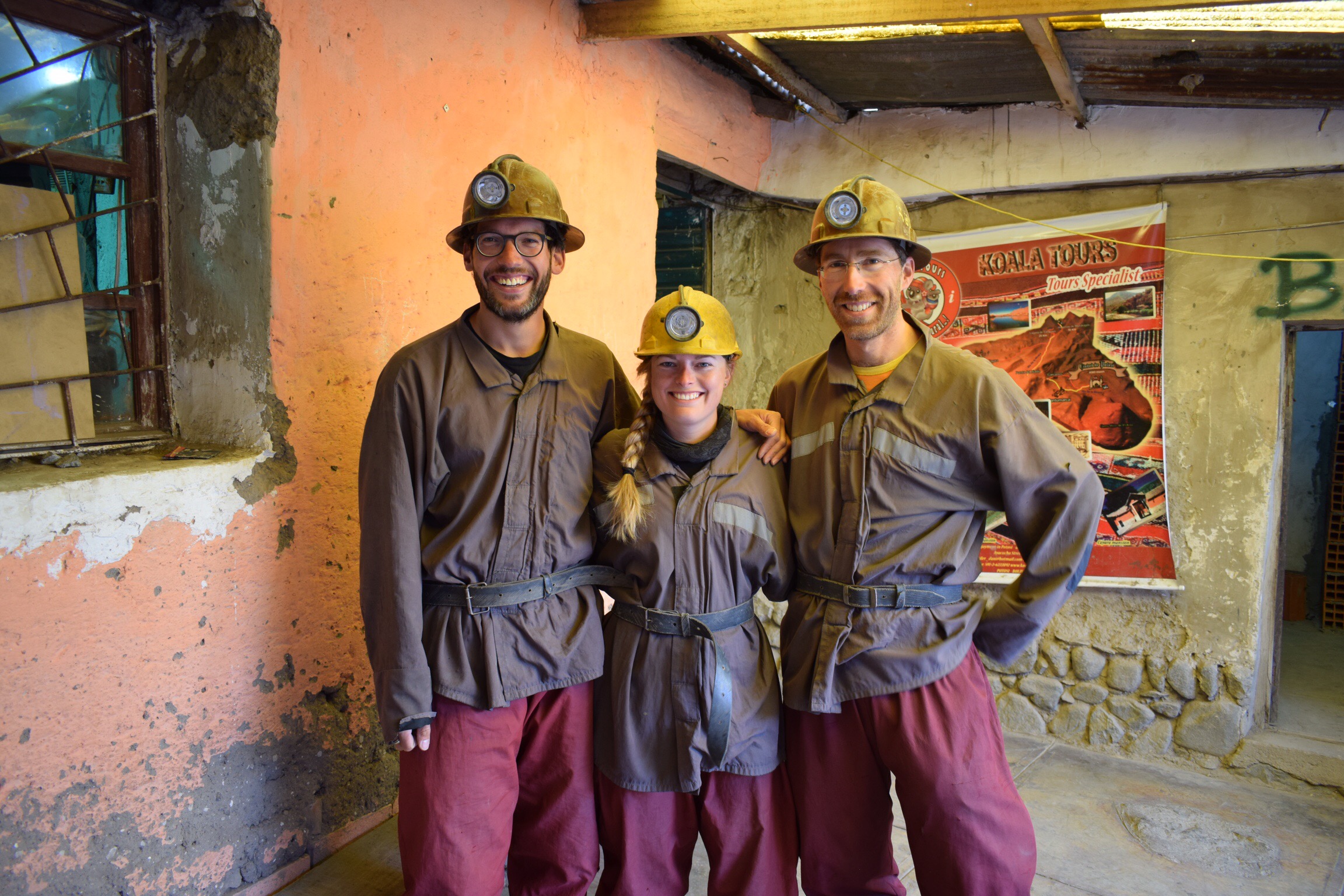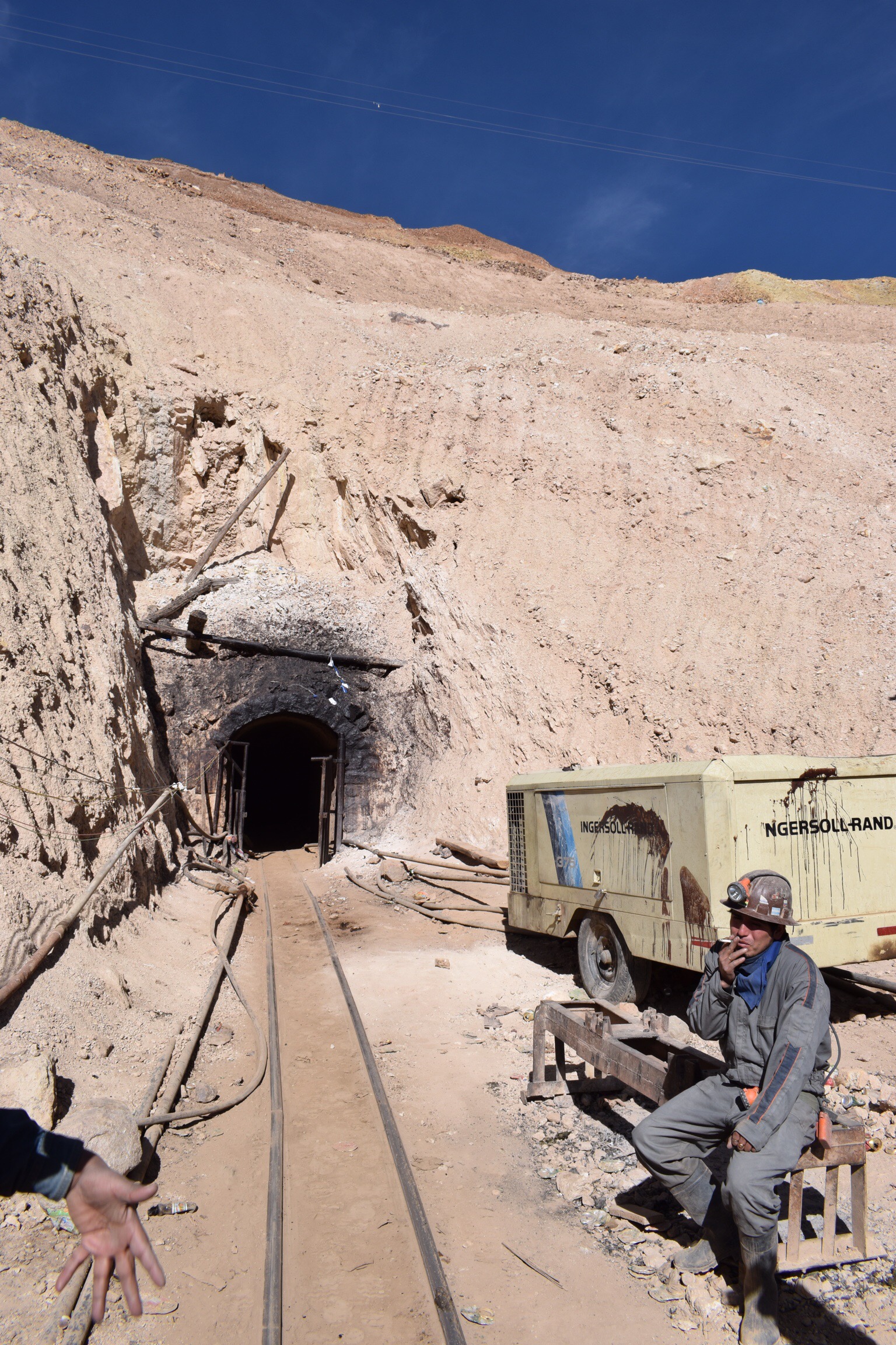 A Potosí, l’ambiance est tout autre. Si la ville est toute aussi jolie en son centre, l’intérêt majeur reste la mine d’argent du Cerro Rico (montagne riche), surplombant la ville de 700 mètres. Chaque habitant a un lien plus ou moins proche avec cette montagne, théâtre de nombreuses ignominies et aujourd’hui toujours exploitée dans des conditions moyenâgeuses. La ville de Potosí fut fondée en 1545 par les Espagnols afin d’extraire l’argent du Cerro Rico. À partir de 1800, on estime que les ressources en argent sont épuisées, mais les locaux continuent à travailler à la mine, détenue aujourd’hui par des coopératives. Chaque nouveau travailleur paye à la coopérative un droit d’exploitation et peut choisir une « parcelle » qu’il exploite en tant qu’indépendant. Si la chance lui sourit, l’argent trouvé lui appartient. On apprend qu’un mineur gagne en moyenne 50 BOB par jour (environ 9 CHF), ce qui est encore loin d’être le jackpot, même en Bolivie. A Potosí, la découverte de la mine fait partie des incontournables et chaque hôtel ou agence propose, à peu de chose près, la même visite. Une fois l’équipement reçu, nous faisons halte au marché des mineurs où il est possible de se procurer dynamite et alcool à 96 degrés à petits prix. Il est d’usage que les visiteurs achètent différents présents à offrir aux mineurs rencontrés sur place, ce que nous faisons. Emmenés par notre guide, aussi mineur à temps partiel, nous entrons dans la mine par un minuscule boyau et longeons l’unique voie ferrée jusqu’à une représentation de Jésus. Placé à l’entrée de la mine, il permet aux mineurs de déposer leurs soucis de l’extérieur et de travailler en toute sérénité le reste de la journée. A l’intérieur, la terre est basse et nous avançons courbé en deux, attentifs aux va-et-vient des mineurs et de leurs wagonnets lourdement chargés, qu’il faut laisser passer en se plaquant contre les murs des souterrains. N’ayant qu’une voie à disposition, la priorité est donnée aux wagons qui descendent plein à rabord de minerais d’un poids d’environ 2 tonnes tandis que les wagons vides (d’un poids de 400 kg) sont balancés sur le côté pour permettre le croisement et aussitôt remis en place pour continuer la dure ascension dans cette atmosphère chaude et suffocante. La voie ferrée en mauvaise état et rafistolée de toute part n’arrange rien à la situation. Nous déambulons ainsi dans les nombreux couloirs, descendons par des échelles aux échelons manquant, passons au dessus de trous béants les pieds sur des troncs d’arbres, les mains sur la roche. La montagne est un véritable Emmenthal. Tellement perforée, qu’on nous dit qu’elle se serait affaissée de 500 mètres depuis le début de son exploitation. Après questionnement, nous apprenons qu’il n’existe aucun plan des nombreuses galeries, le risque de pouvoir connaître où sont les bons filons beaucoup trop grand. Un ingénieur déambule pourtant, une à deux fois par mois pour vérifier la stabilité des installations et exiger certains renforcements… Dernière étape de cette visite complètement folle, notre rendez-vous avec le Tío (l’oncle), sorte d’ami du mineur, à qui l’on donne cigarettes et alcool quasi pur en offrande, pour obtenir des métaux tout aussi purs. Nous ressortons à l’air libre des questions plein la tête: comment est-il possible que les mineurs n’arrivent pas à s’allier pour améliorer ne serait-ce qu’un tout petit peu leurs conditions de travail? Si effectivement la quantité d’argent restante est si infime, pourquoi les mineurs sont-ils prêts à mettre leur santé en danger? Une sacrée affaire!