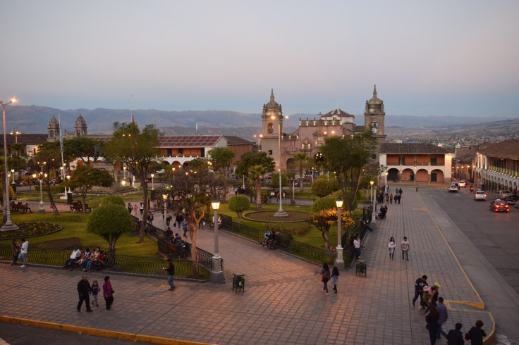 La tranquille Plaza de Armas d’Ayacucho au crépuscule.