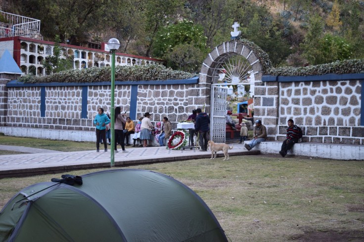 À Lircay, dans le jardin Eden, à l’entrée du cimetière. Ici, l’enterrement d’un nouveau-né ne semble pas aussi tragique que chez nous et nombreuses femmes viendront nous offrir du coca et papoter avec nous en attendant la mise en terre.