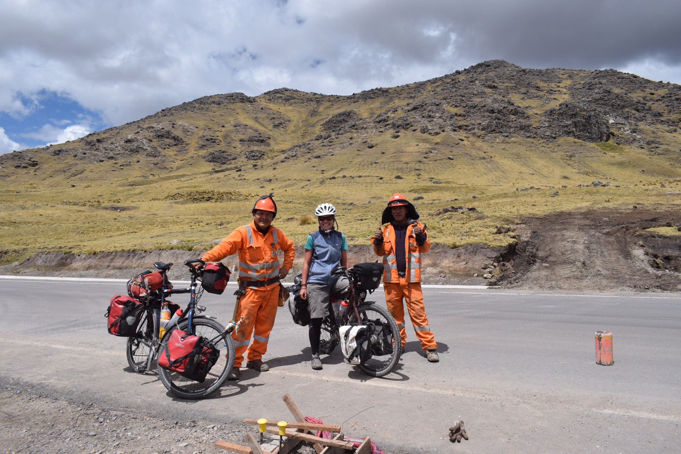 Les travaux vont bon train entre Lircay et Huancavelica, où la route est élargie. Deux ouvriers aux prises avec des finitions nous demandent une photo. D’accord mais nous en voulons une aussi!