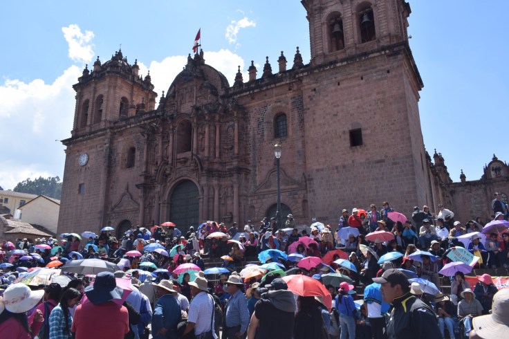 À Cusco, la Plaza de Armas est bondée. Une quantité de touristes du monde entier déambulent en quête de vieilles pierres, alors que les enseignants péruviens en grève depuis la mi-juin militent (ici devant la cathédrale de Cusco), entre autre, pour un meilleur salaire (palier minimum: 2000 Soles = environ 600 CHF mensuel pour 24 heures de travail hebdomadaire); pour en savoir plus: altavoz.pe/2017/08/17/26691/informe-para-que-entiendas-la-huelga-de-profesores