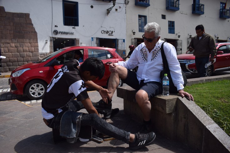 Lors d’une pause, JJ profite du savoir-faire des cireurs de chaussures cusquéniens. Le résultat est éclatant, quoiqu’un peu cher.