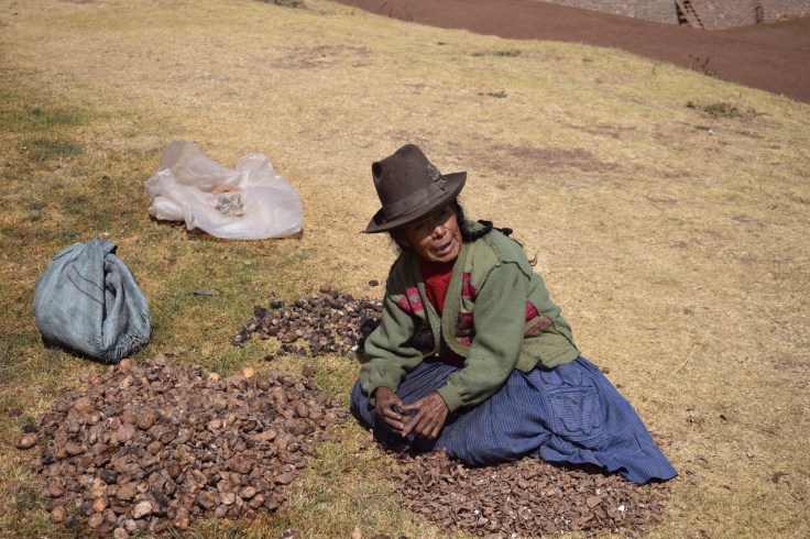 Près de la place de Chinchero, où se situe un marché d’artisanat, cette vieille femme s’occupe de sa récolte de chuños, parfois dérangée par quelques photographes ;-). Le chuño est une espèce de pomme de terre, qui une fois récoltée, est plusieurs jours durant laissée au gel la nuit, puis séchée au soleil le jour.