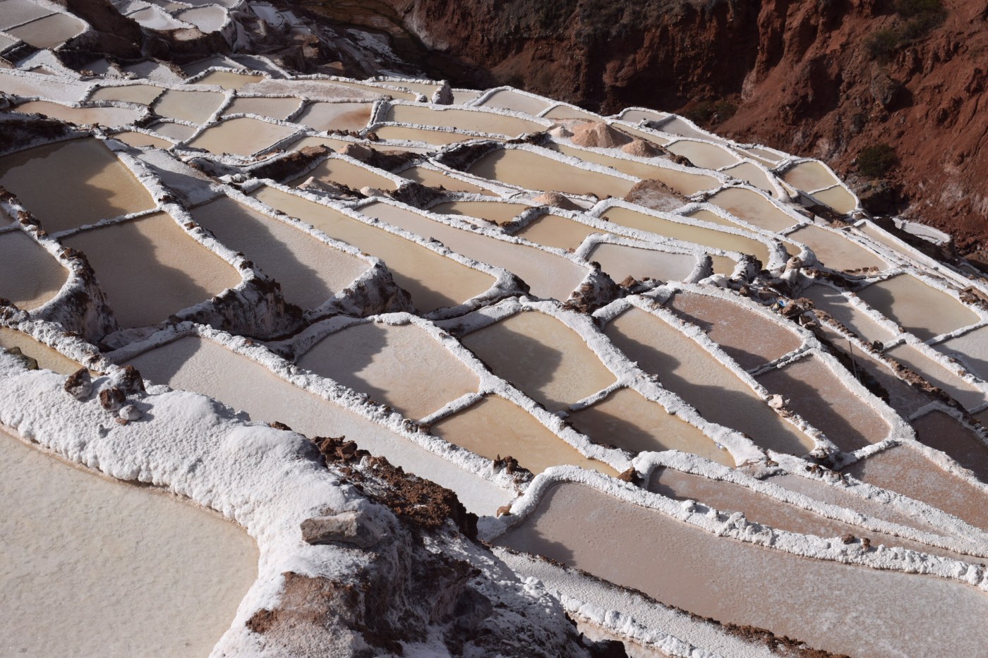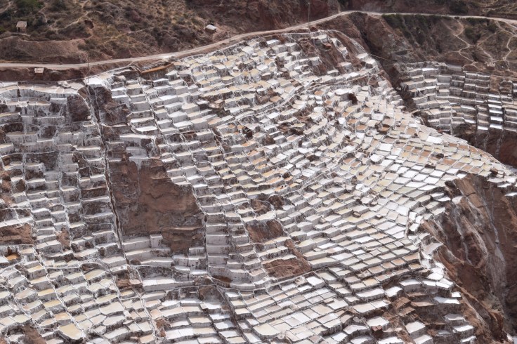 Habitués à voir des terrasses agricoles à longueur de coups de pédales, nous sommes éblouis par ce nouveau genre d’aménagement du territoire. Les Salines de Maras exploitent une source d’eau très salée et récoltent le sel par évaporation. Les différents tons de beige et blanc des terrasses sont un régal pour les yeux.