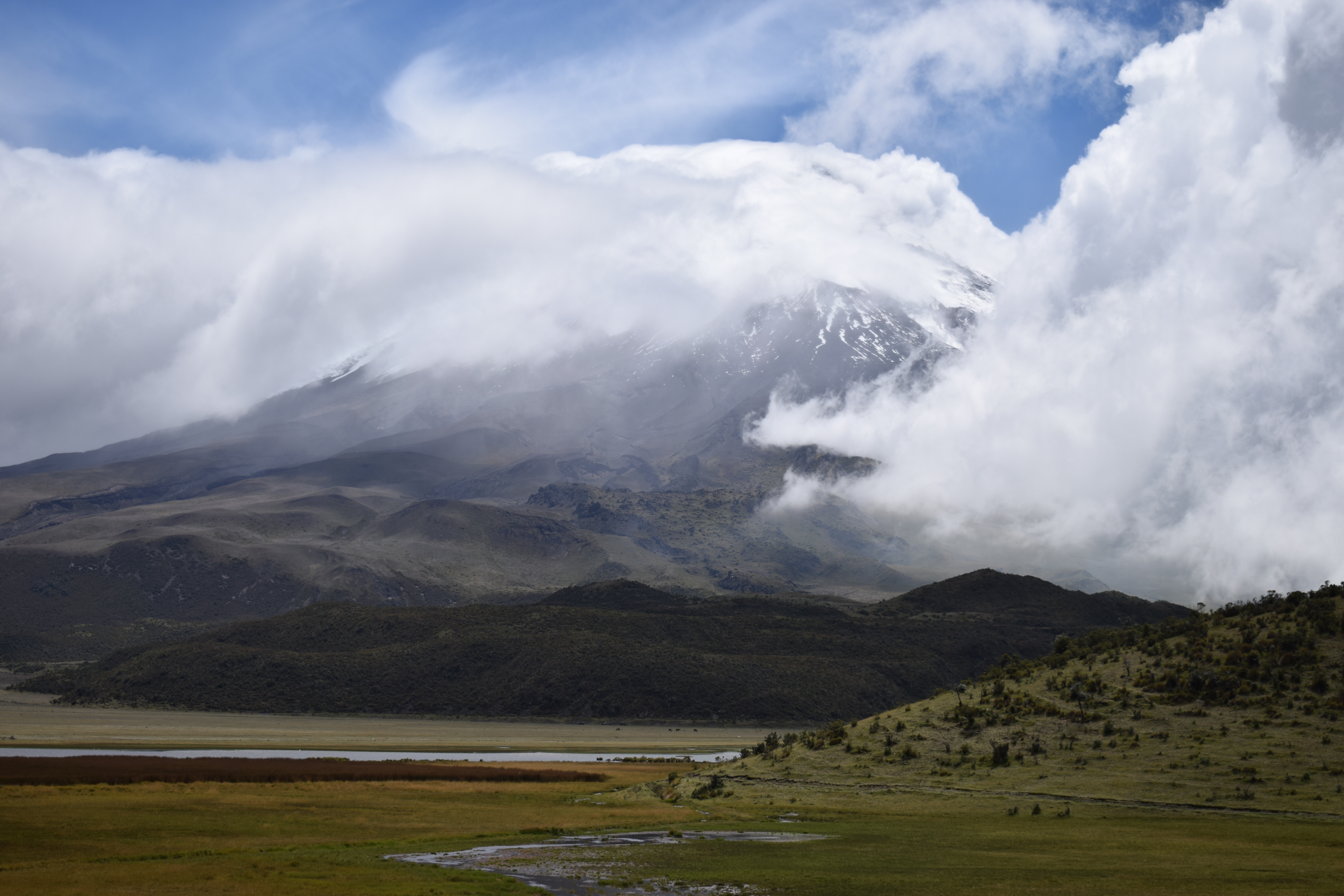 Dans les parcs nationaux, nous essayons de voir de plus près les volcans mythiques: le Cotapaxi avec une grosse écharpe de brume autour du cou, le Chimborazo noyé dans une charlotte de ouate à couper au couteau et le Tungurahua daignant montrer une fumerole de vapeur. En fait, nous eûmes plus de succès avec les lagunas qui se sont formés au centre des cratères anciens et dont on peut faire le tour, soit aux abords, soit sur la crête circulaire, soit encore par barque sur le lac lui-même. Le plus connu est celui de Quilotoa (3854m) flanqué d’une station d’accueil touristique en plein développement.