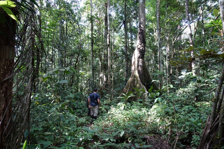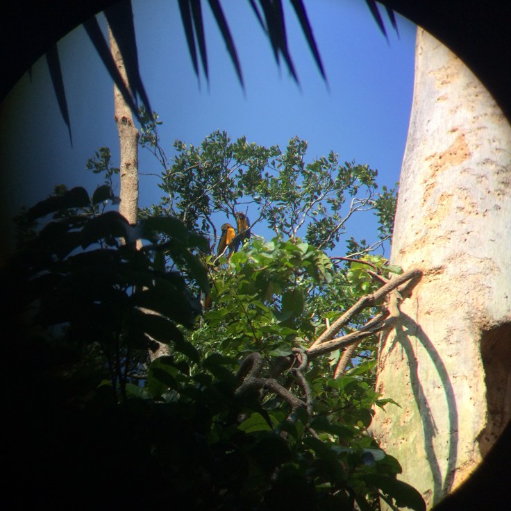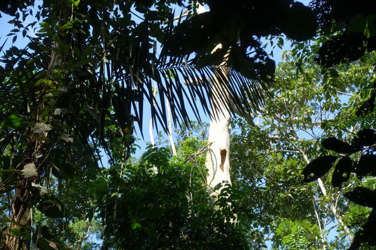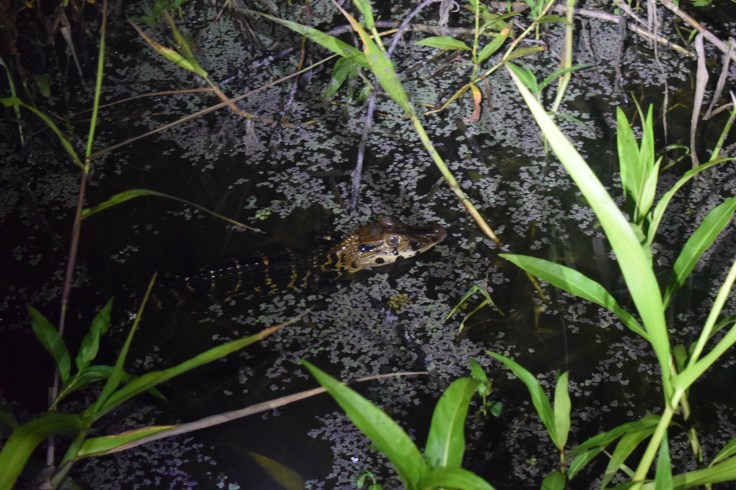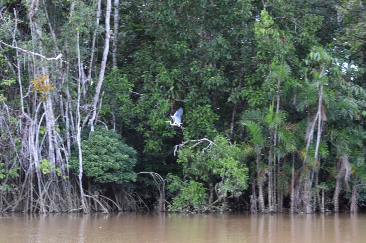 … Et ne sommes définitivement pas déçus! Deux jours durant, nous prenons le pouls de cette immensité, de ce paradis faunesque et verdoyant, baladés comme des rois dans la barque de notre guide et sa femme, Laisa. Ensemble, nous descendons le Napo, jusqu’à la frontière péruvienne avant de nous engager sur le río Yasuni, jusqu’à l’entrée du parc éponyme. Les dauphins d’eau douce approuvent cette excursion et nous régalent de quelques apparitions discrètes. Fernando est un guide attentionné, patient et passionné. Il prend à cœur notre éducation sylvestre et tente de nous faire découvrir le plus de choses possibles dans le temps très court qui nous est imparti. Et il semblerait que nous ayons de la chance! Non seulement il fait un temps époustouflant, mais les singes, vipères, oiseaux muy raros y localistos, comme dirait Fernando sont de la partie. Peu connaisseurs, les plus marquants sont les oiseaux muy comúnes. Le héron cocoi, le hoazin huppé, le cassique cul-jaune et la grande aigrette, qui surgissent soudain devant notre barque, resteront dans nos mémoires. En deux jours, nous pouvons les adopter, reconnaître leur cri, leur nid… Nous regrettons seulement de ne pas avoir un téléobjectif pour rendre au plus prêt nos émotions, mais passons notre temps les yeux vissés aux jumelles. A quatre reprises, nous suivons Fernando dans la forêt. Là, il nous en apprend plus sur les vertus médicinales des plantes présentes et nous fait goûter feuilles, écorces amères, eau de liane et même fourmis au citron! 🙂