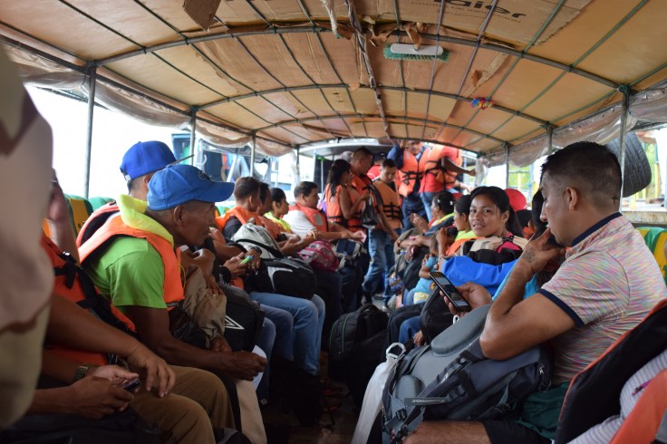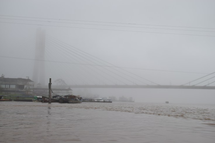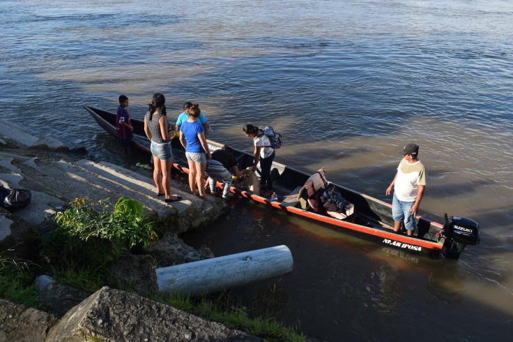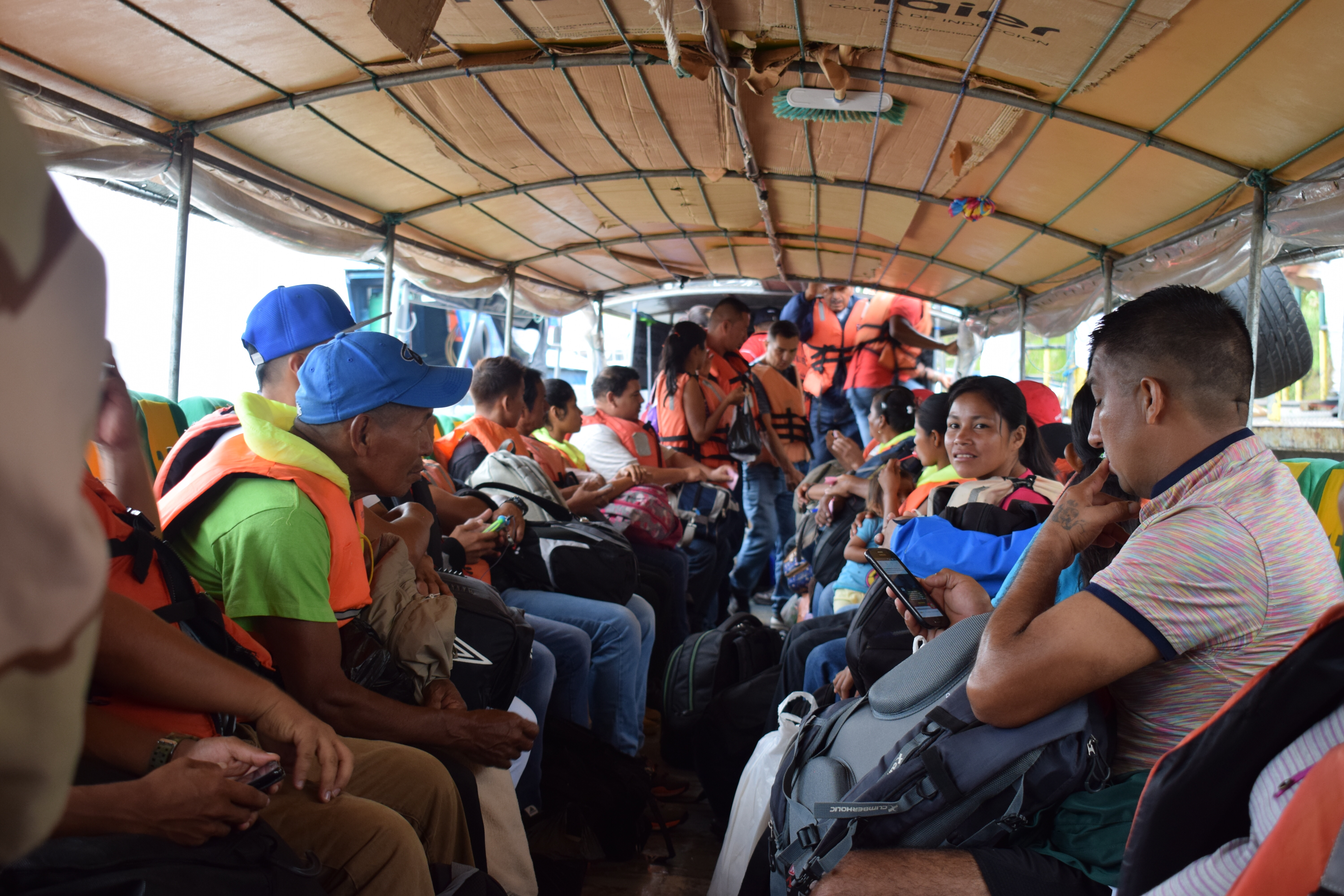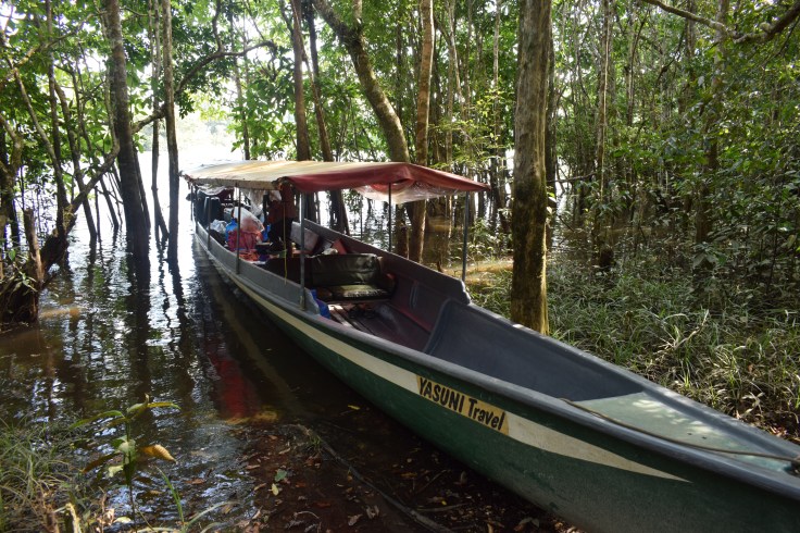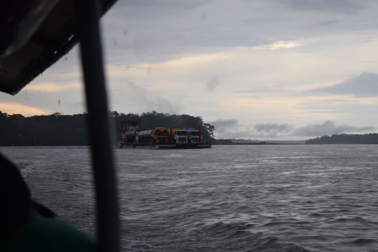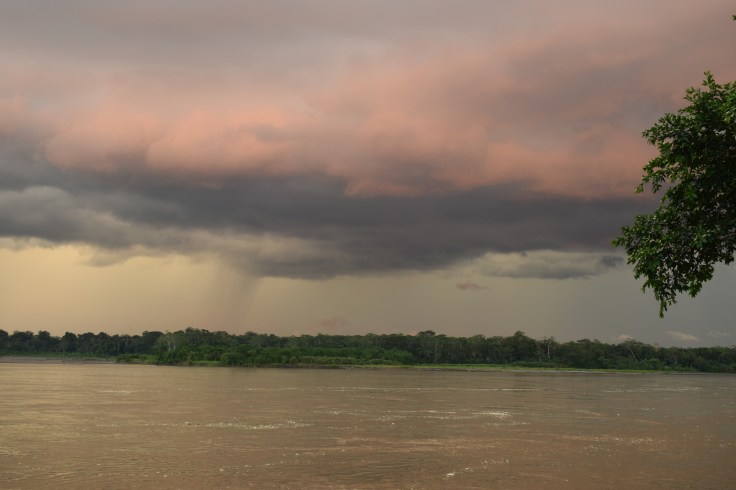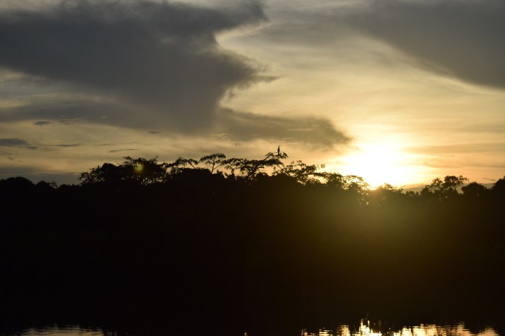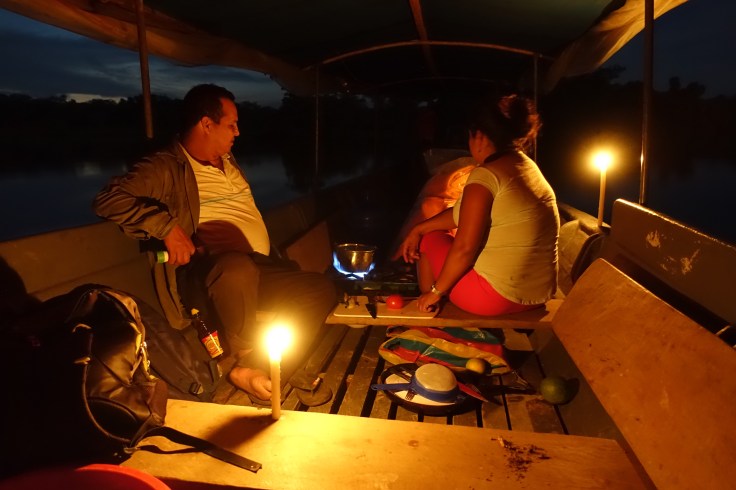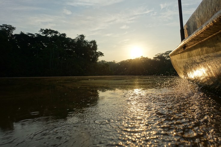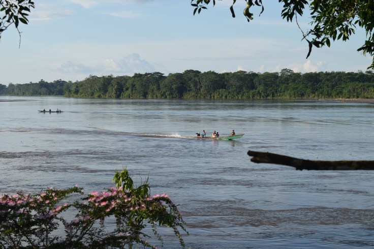 Entre le départ de Nicole et Jean-Bernard, les parents d’Arthur et la venue de notre ami Laurent, il y a quatre jours. Quatre jours que nous mettons à profit d’une incursion en Amazonie, à Nuevo Rocafuerte pour être précis! Par un merveilleux hasard, nous obtenons le numéro de Fernando et organisons notre arrivée directement avec lui. Le voyage jusqu’à notre point de rencontre est déjà une expérience en soi. Après six heures de bus de nuit, nous embarquons sur la lancha pública pour huit heures de navigation supplémentaires. La brume accompagne notre embarcation pleine à craquer mais silencieuse en cette heure matinale. Nous nous laissons tous bercer une heure ou deux par notre capitaine manchot, la faute à la pêche à la dynamite, qui zigzague entre les bancs de sable du río Napo. Les occupants de la barque habitent tout au long de la rivière, parfois dans des villages, souvent dans des maisons isolées. Notre lancha rápida ne prend pas la peine de manœuvrer des arrêts pour chacun d’entre eux mais ralentit pour que les chaloupes particulières aient le temps de nous rattraper et récupérer un occupant à la James Bond, en sautant! Bientôt tous sont réveillés et la musique, hits du moment mélangés aux classiques équatoriens, augmente d’un cran. Le soleil est revenu, l’ambiance est bon enfant… Nous passons les nombreuses heures de voyage à lire. Sur conseil de mon ancien prof de géo, la plongée dans l’Amazonie a déjà commencé au travers des mots de Luis Sepulveda et de son livre Le vieux qui lisait des romans d’amour. Enchantés par cette histoire nous avons vraiment hâte d’y être…