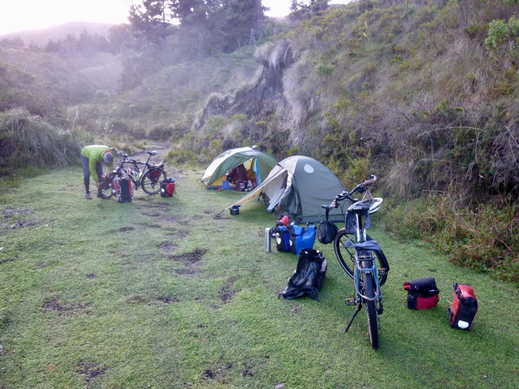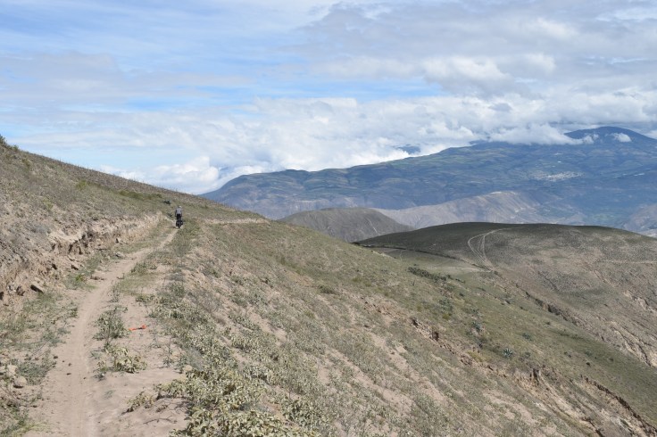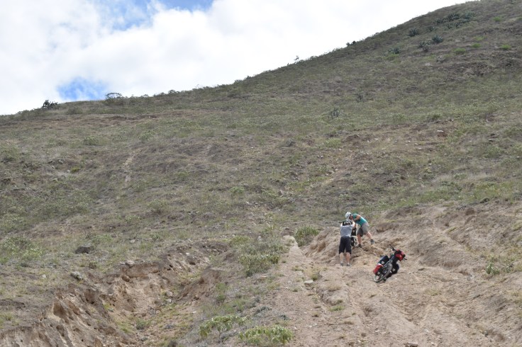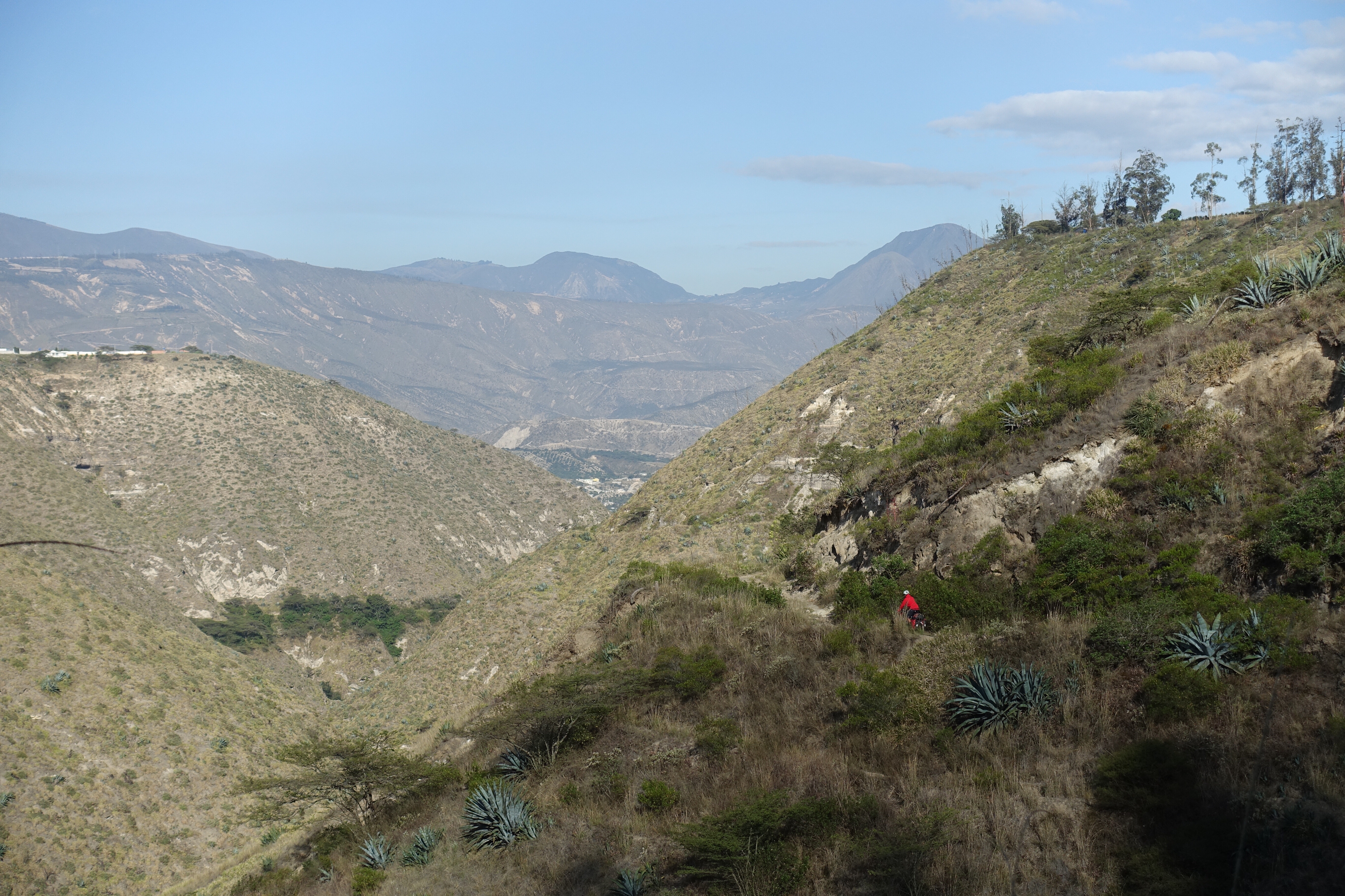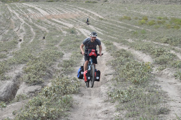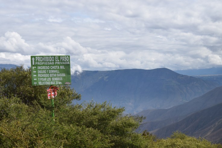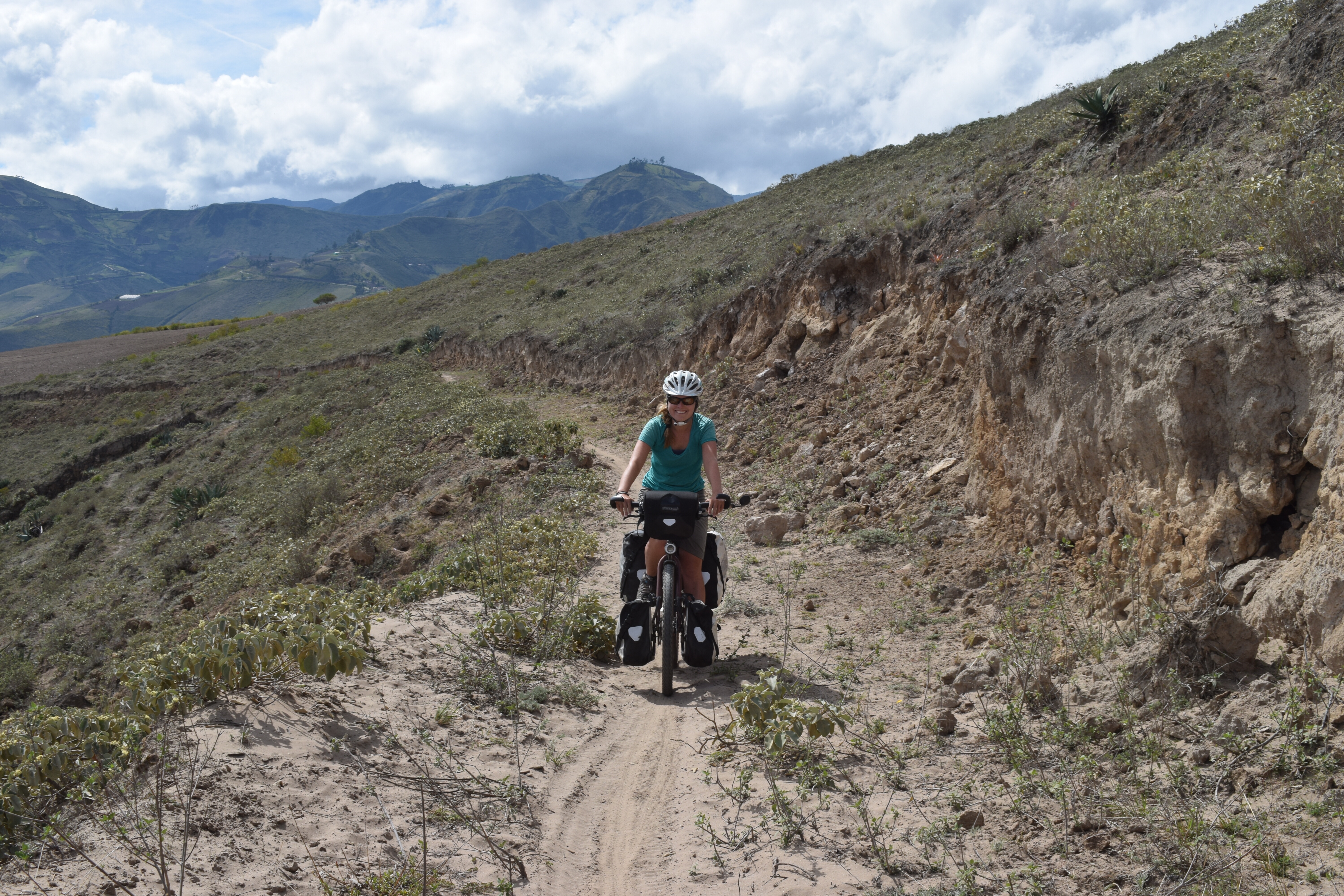 Depuis Ibarra, nous avons le choix entre deux pistes pour continuer vers le nord. Nous prenons la plus directe et lorsque nous arrivons au sommet, une villageoise nous demande: « Vous allez descendre par là? Avec toutes ces sacoches?? Faites attention à ne pas tomber… » Plus loin, un panneau enduro y downhill nous montre la voie à suivre et l’état d’esprit à adopter… Ce sera donc du singletrack! Très joueuse au début, la trace descend de colline en colline. Mais parfois le terrain est tellement raide que nous devons marcher à côté de nos vélos. Puis le sable fait son entrée en scène et les choses commencent à se compliquer. Après la rivière, la remontée dans du sable pulvérulent et deux crevaisons coup sur coup mettent fin à nos rires du matin! C’est donc bien entamés, mais heureux quand même que nous posons la tente en début d’après-midi!