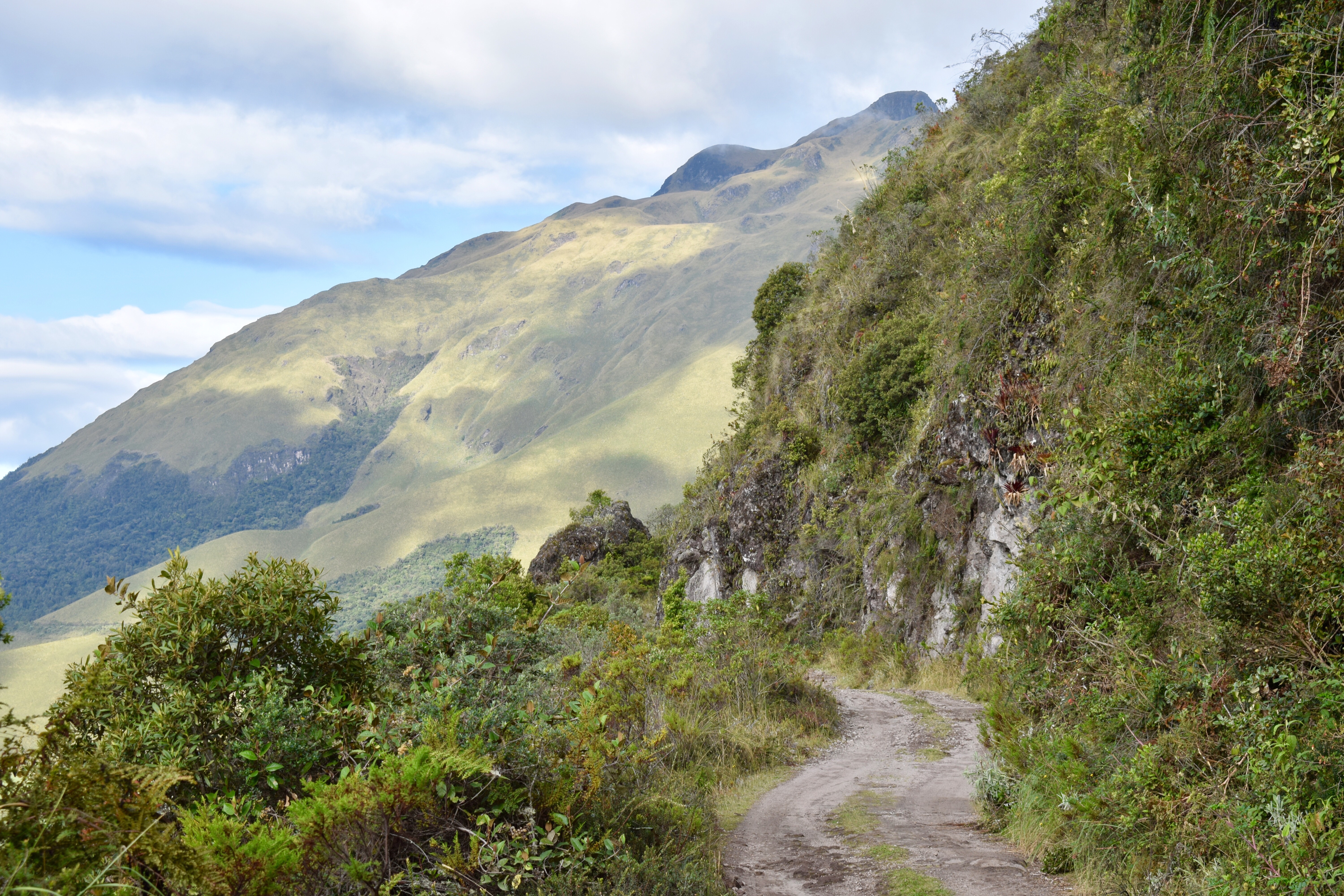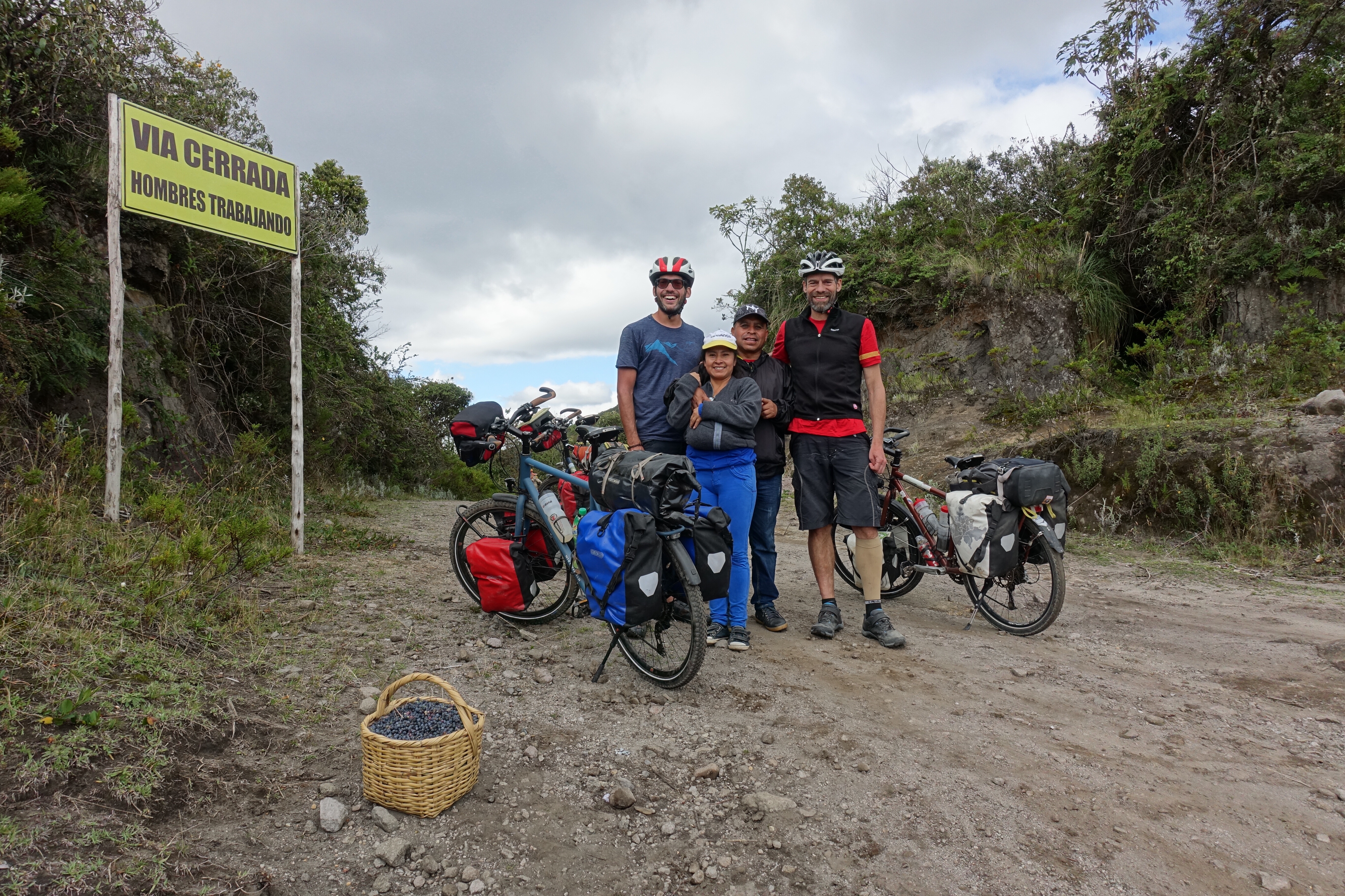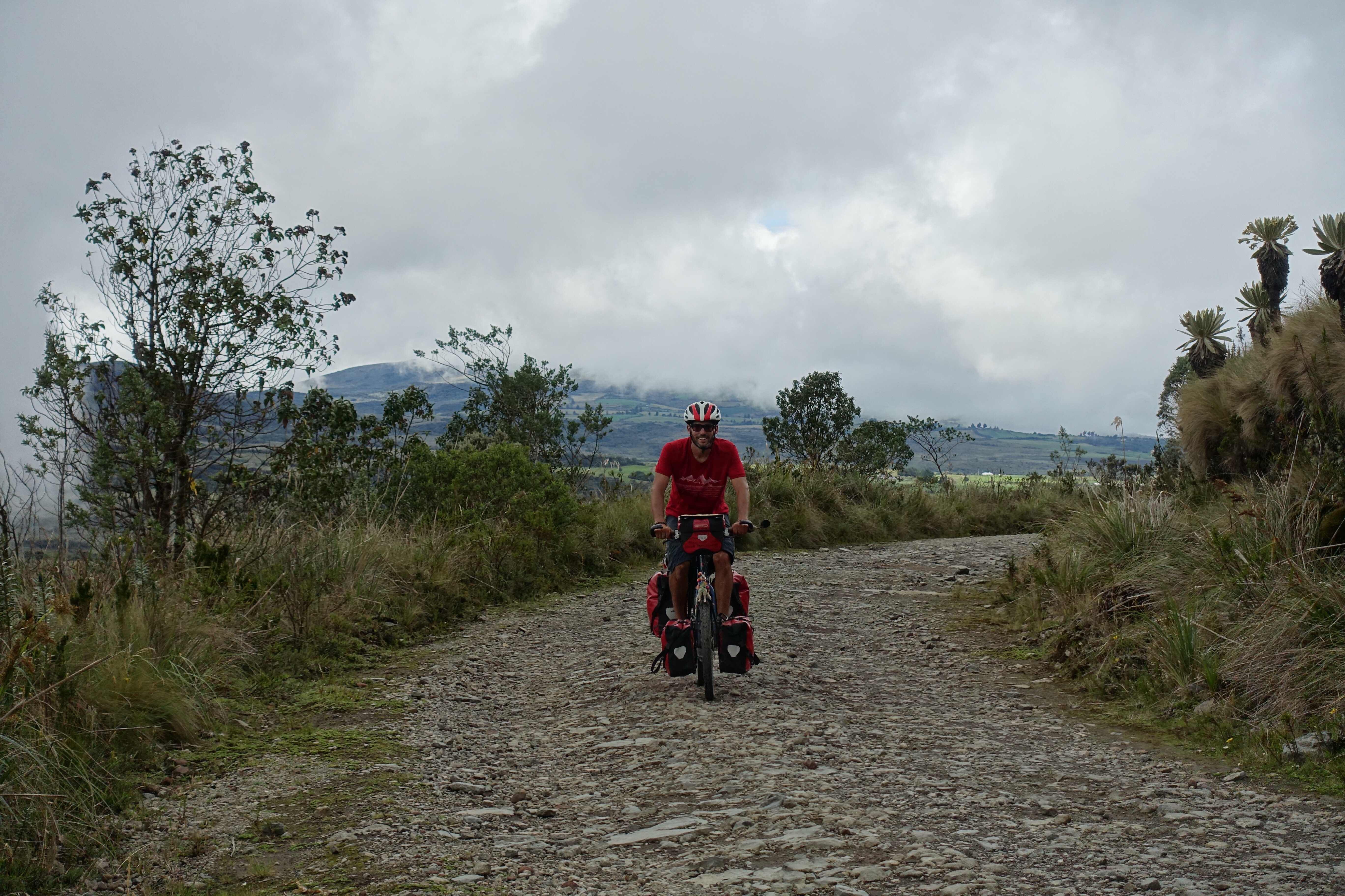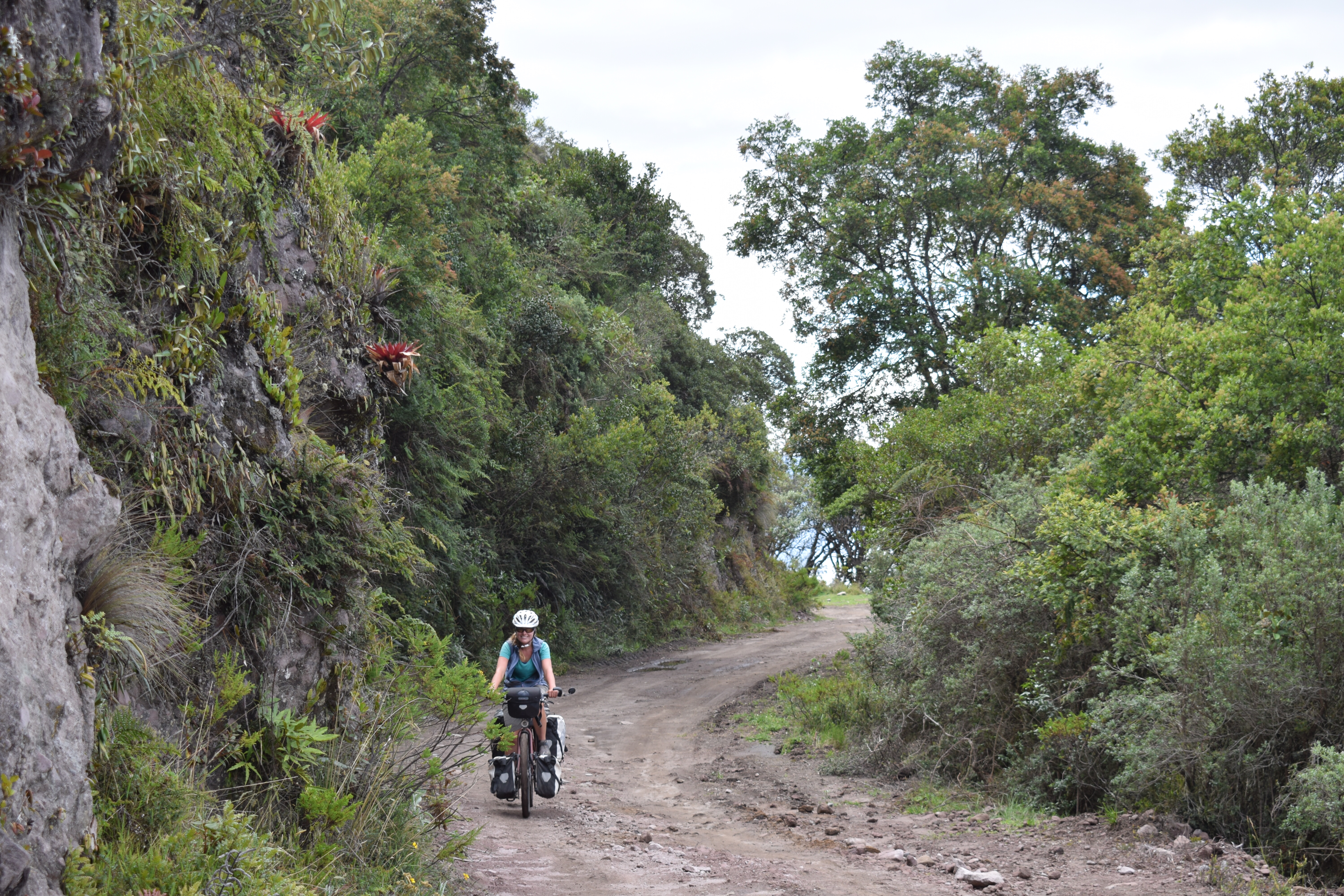 Moins de 300 kilomètres nous séparent de la Colombie, j’avais donc prévu quatre ou cinq jours de balade. C’était sans compter un terrain relativement exigeant, assez joueur et plein de surprises! En sortant de Quito, nous suivons tout d’abord une ancienne voie ferrée nouvellement aménagée en piste cyclable. Dans une topographie accidentée, le tracé zigzague sympathiquement afin de rester le plus plat possible. Souvent, nous roulons entre deux parois rocheuses, trace du dynamitage effréné de l’époque. Puis une rude montée nous mène jusqu’aux magnifiques lagunes de Mojanda, suivie d’une longue descente sur pavés bien mal équarris. Nous laissons filer quelques bars de nos pneumatiques afin de pouvoir descendre comme des balles, avec cependant un léger sentiment de flottement…