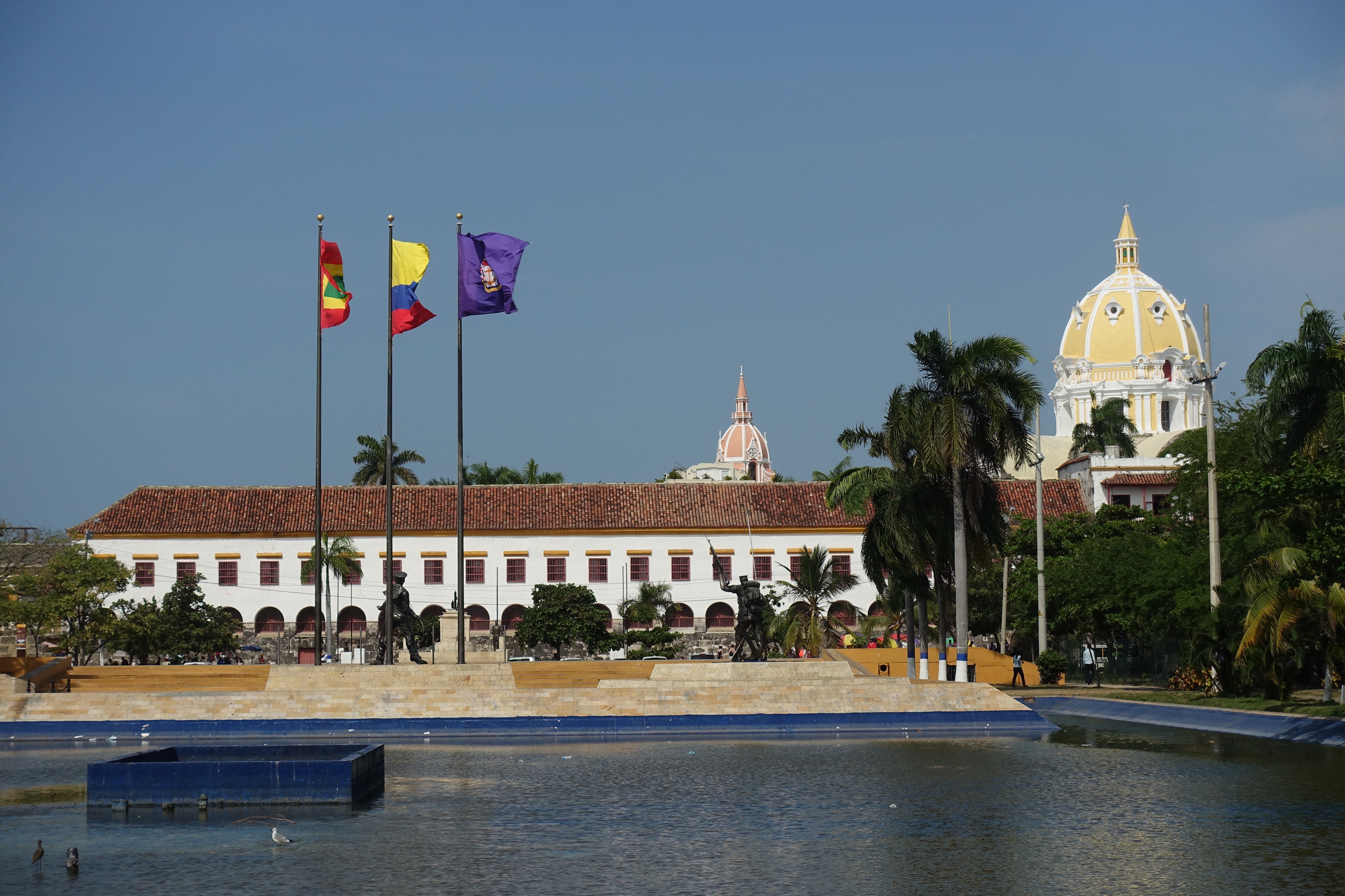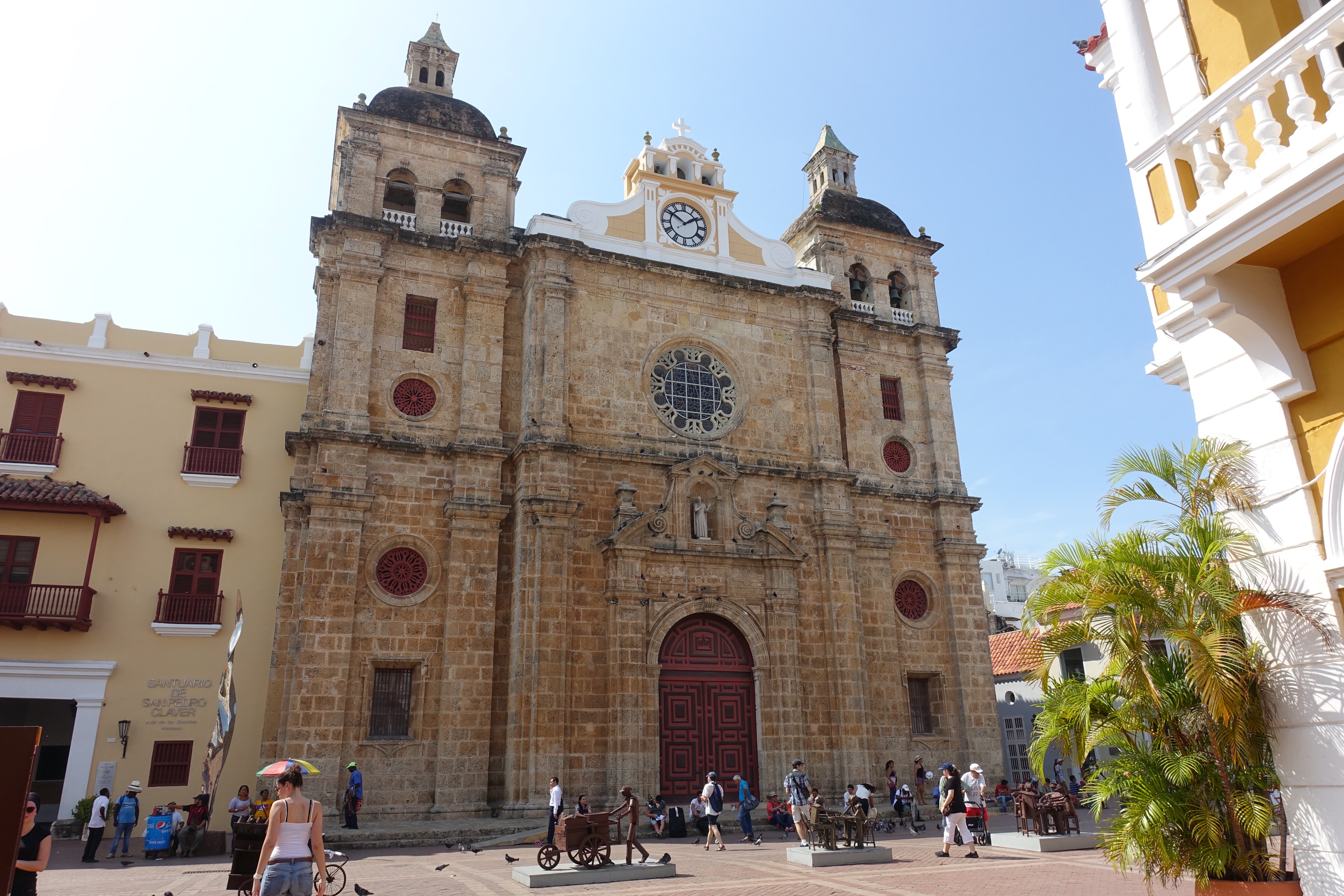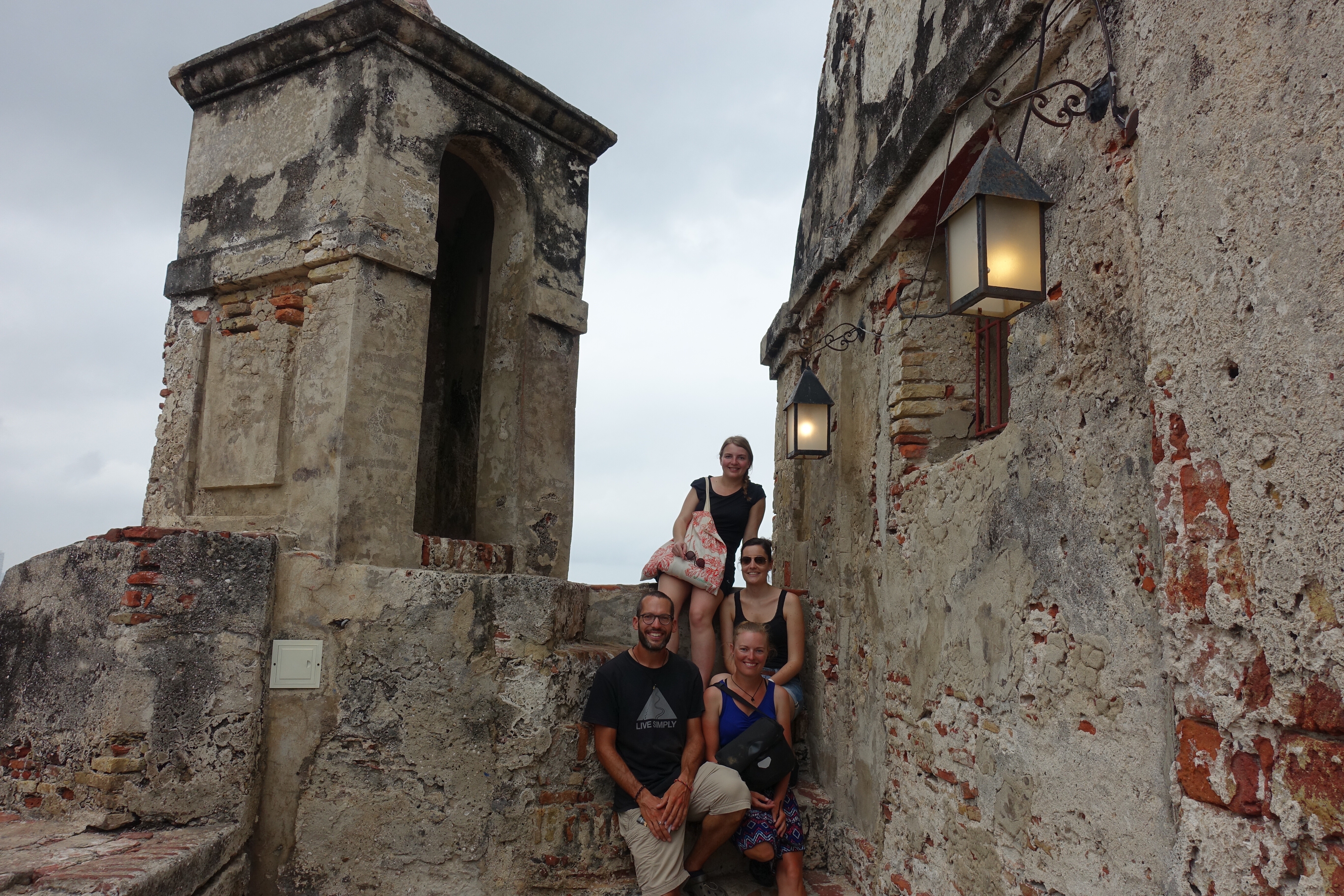 Carthagène, 16 janvier 2018: je trépigne d’impatience, aujourd’hui c’est le jour J! En fin de journée, il est prévu que nous retrouvions Sarah et Arthur!☺Depuis notre arrivée en Colombie le 4 janvier, je compte les jours! Même si j’ai bien conscience que cela est quasiment impossible, depuis le début de notre voyage, à chaque fois que nous prenons le bus, j’ai l’espoir de les voir sur leur vélo; au loin, là-bas sur une longue ligne droite ou alors, de les croiser par hasard au détour d’un chemin… Vers 17h00, comme prévu, Audrey et moi arrivons dans notre petit hôtel. A la réception, nous apercevons directement deux passeports suisses posés sur une table. Mon cœur s’emballe, Sarah et Arthur sont peut-être déjà là! Je commence à crier « Choupe Choupe! Choupe Choupe! » (et oui, pour ceux qui ne le savent pas, c’est le petit nom de Sarah ☺)! Au bout de quelques secondes, ils apparaissent dans le couloir, nous leur sautons dans les bras. Ah, qu’il est bon de les retrouver! Ils arborent un large sourire. Ils sont tout minces, tout bronzés, tout puants, ils viennent d’arriver! Les sentiments se mélangent, par où commencer, tant de choses se sont passées, tant de choses à se raconter. Il faut dire qu’entre nos au revoir à Marly et nos retrouvailles ici, à Carthagène, 19’195 kilomètres de vélo ont été parcourus. Eh oui, ils l’ont fait, ils ont traversé toute la cordillère des Andes! Ce soir, restaurant pour fêter tout ça! Puis demain, visite de Carthagène, une ville portuaire pleine de charmes. En effet, la vieille ville fortifiée est magnifique: des petites rues pavées, de grandes places où il est agréable de se retrouver pour échanger et siroter un verre, des bâtiments coloniaux très colorés, des sculptures tout en rondeur de Botero, des églises ainsi que la Cathédrale de Santa Catalina de Alejandría pour Arthur!☺ Nous découvrons aussi le château de San Felipe de Barajas, un fort situé au sommet de la colline de Saint-Lazare. Il offre un point de vue splendide sur toute la ville.