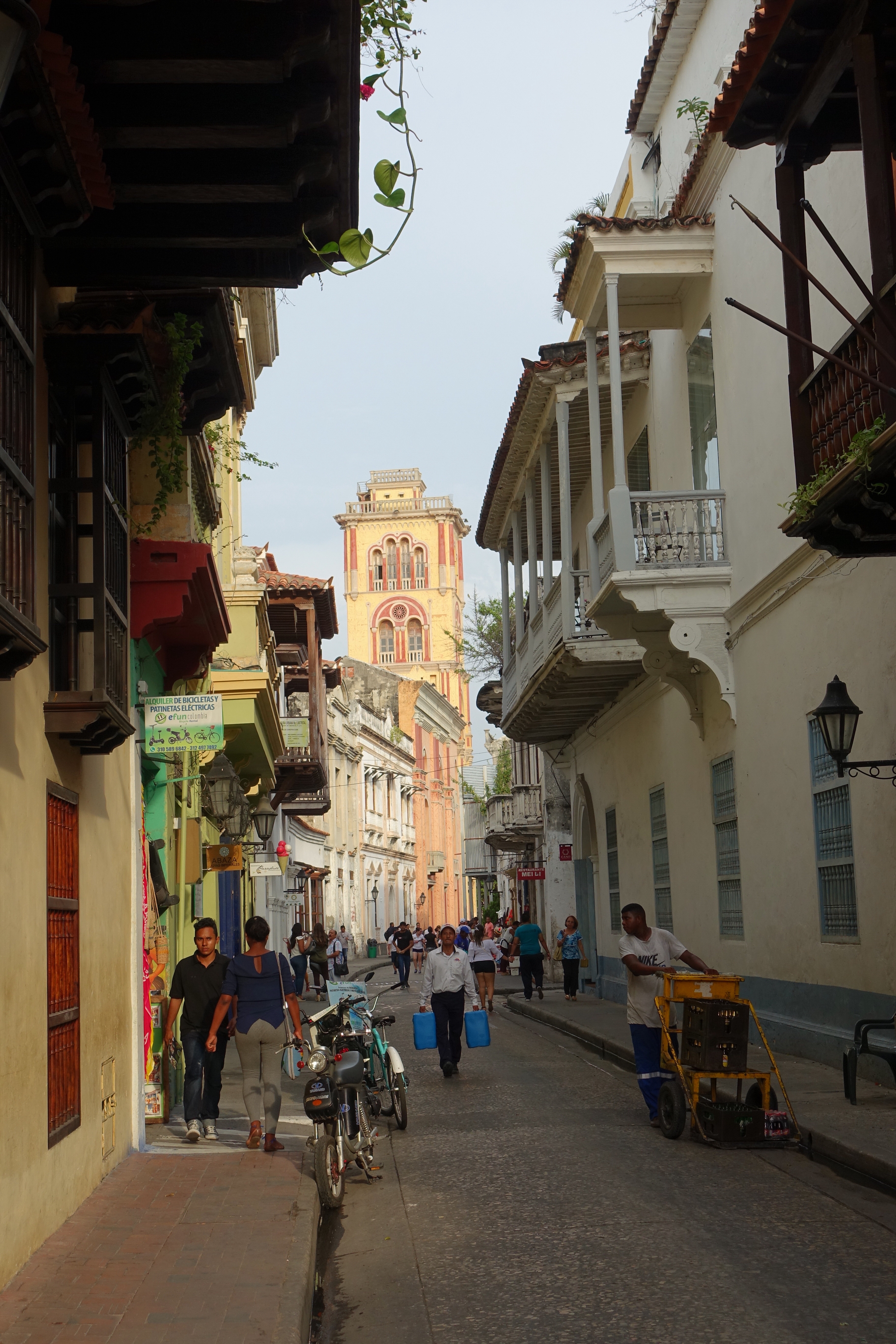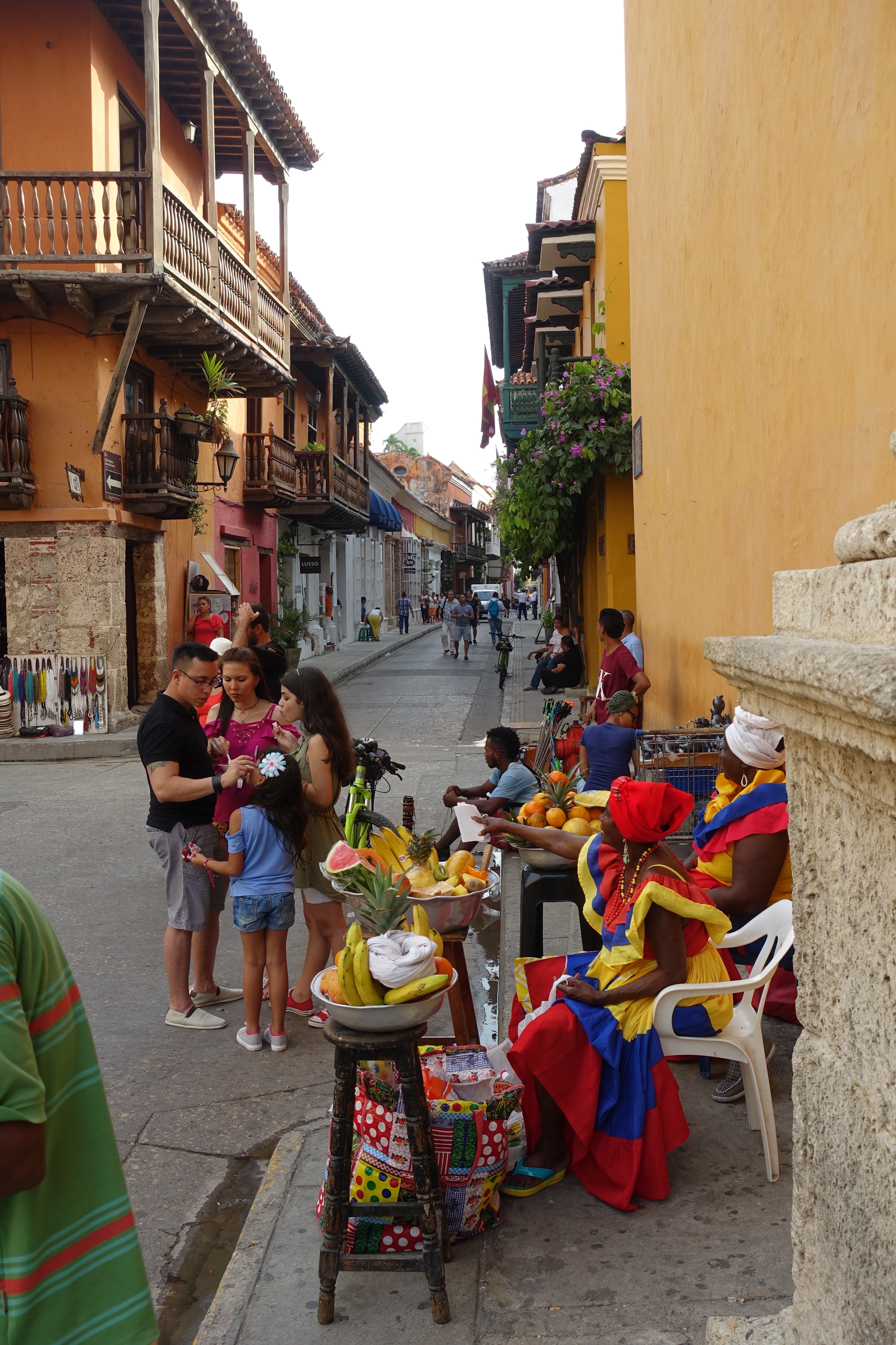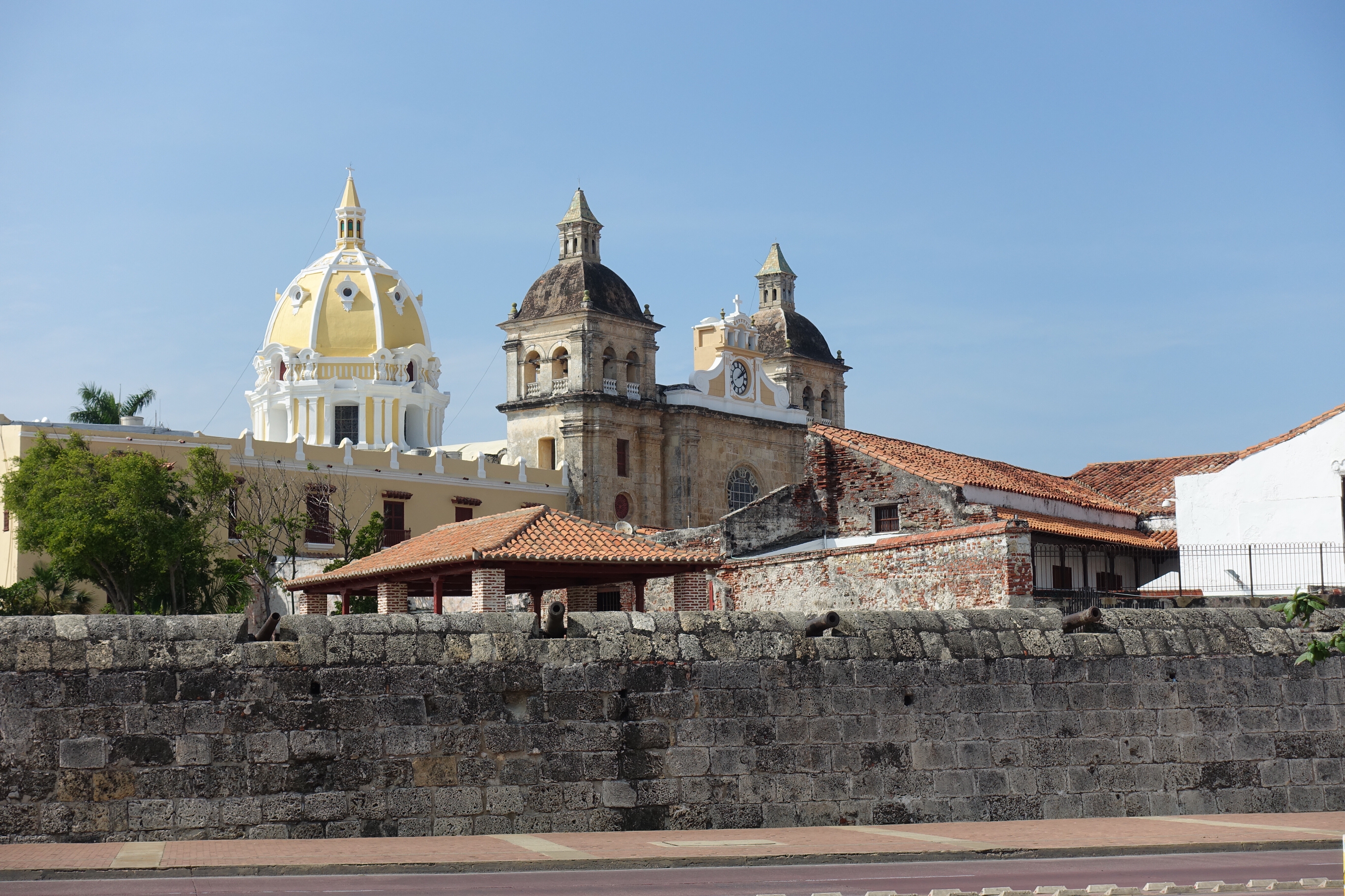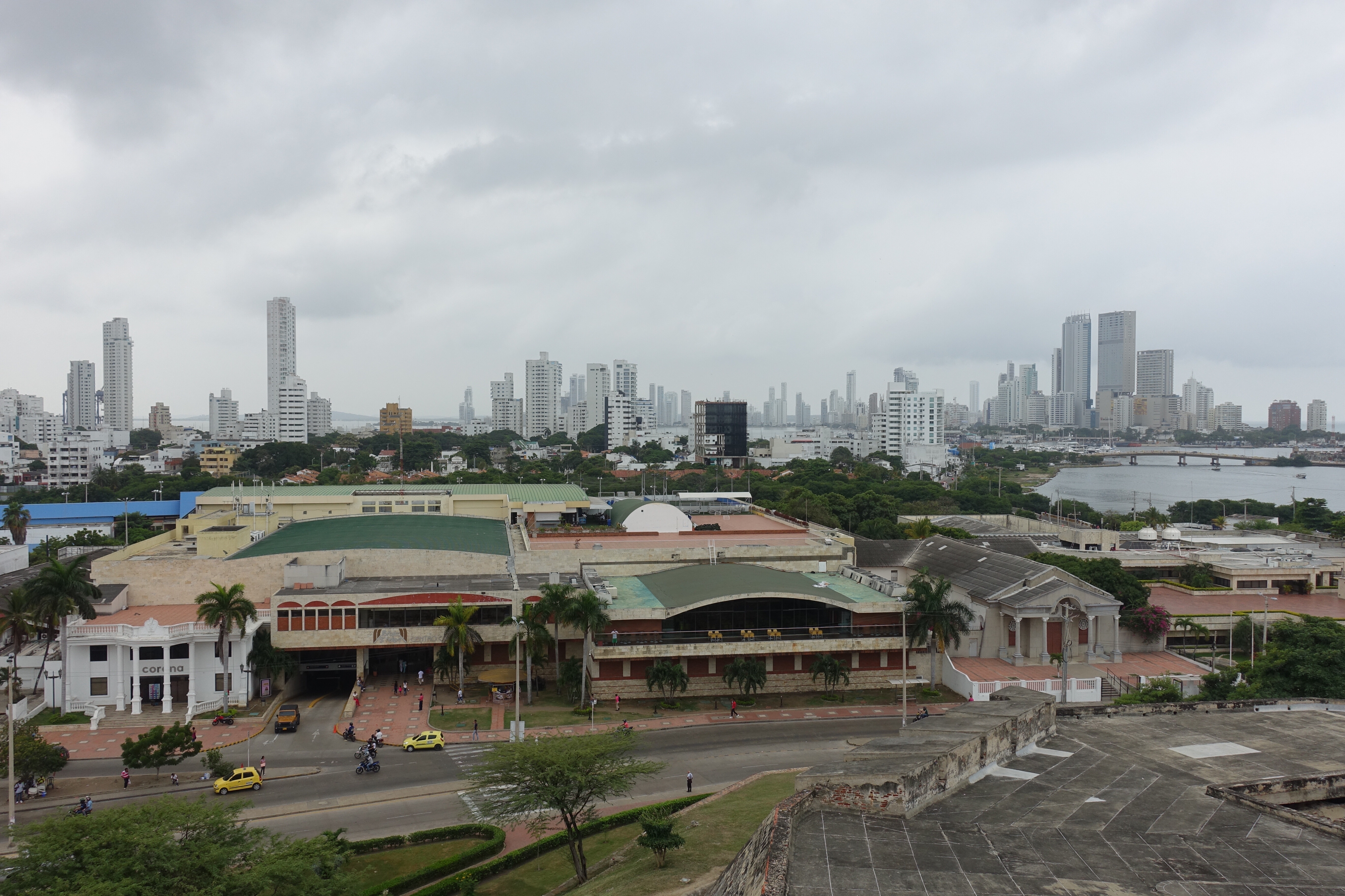 Carthagène, 16 janvier 2018: je trépigne d’impatience, aujourd’hui c’est le jour J! En fin de journée, il est prévu que nous retrouvions Sarah et Arthur!☺Depuis notre arrivée en Colombie le 4 janvier, je compte les jours! Même si j’ai bien conscience que cela est quasiment impossible, depuis le début de notre voyage, à chaque fois que nous prenons le bus, j’ai l’espoir de les voir sur leur vélo; au loin, là-bas sur une longue ligne droite ou alors, de les croiser par hasard au détour d’un chemin… Vers 17h00, comme prévu, Audrey et moi arrivons dans notre petit hôtel. A la réception, nous apercevons directement deux passeports suisses posés sur une table. Mon cœur s’emballe, Sarah et Arthur sont peut-être déjà là! Je commence à crier « Choupe Choupe! Choupe Choupe! » (et oui, pour ceux qui ne le savent pas, c’est le petit nom de Sarah ☺)! Au bout de quelques secondes, ils apparaissent dans le couloir, nous leur sautons dans les bras. Ah, qu’il est bon de les retrouver! Ils arborent un large sourire. Ils sont tout minces, tout bronzés, tout puants, ils viennent d’arriver! Les sentiments se mélangent, par où commencer, tant de choses se sont passées, tant de choses à se raconter. Il faut dire qu’entre nos au revoir à Marly et nos retrouvailles ici, à Carthagène, 19’195 kilomètres de vélo ont été parcourus. Eh oui, ils l’ont fait, ils ont traversé toute la cordillère des Andes! Ce soir, restaurant pour fêter tout ça! Puis demain, visite de Carthagène, une ville portuaire pleine de charmes. En effet, la vieille ville fortifiée est magnifique: des petites rues pavées, de grandes places où il est agréable de se retrouver pour échanger et siroter un verre, des bâtiments coloniaux très colorés, des sculptures tout en rondeur de Botero, des églises ainsi que la Cathédrale de Santa Catalina de Alejandría pour Arthur!☺ Nous découvrons aussi le château de San Felipe de Barajas, un fort situé au sommet de la colline de Saint-Lazare. Il offre un point de vue splendide sur toute la ville.