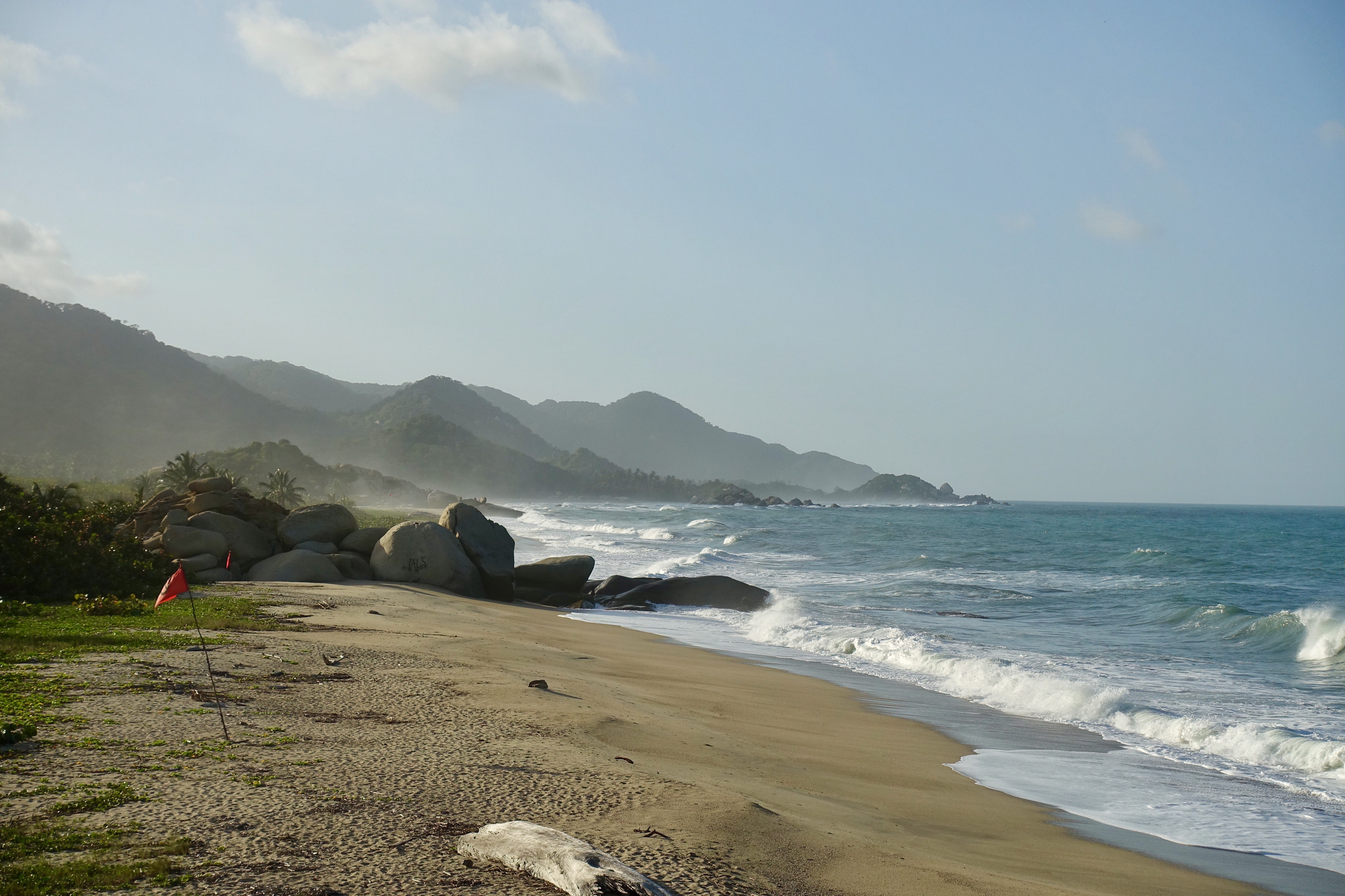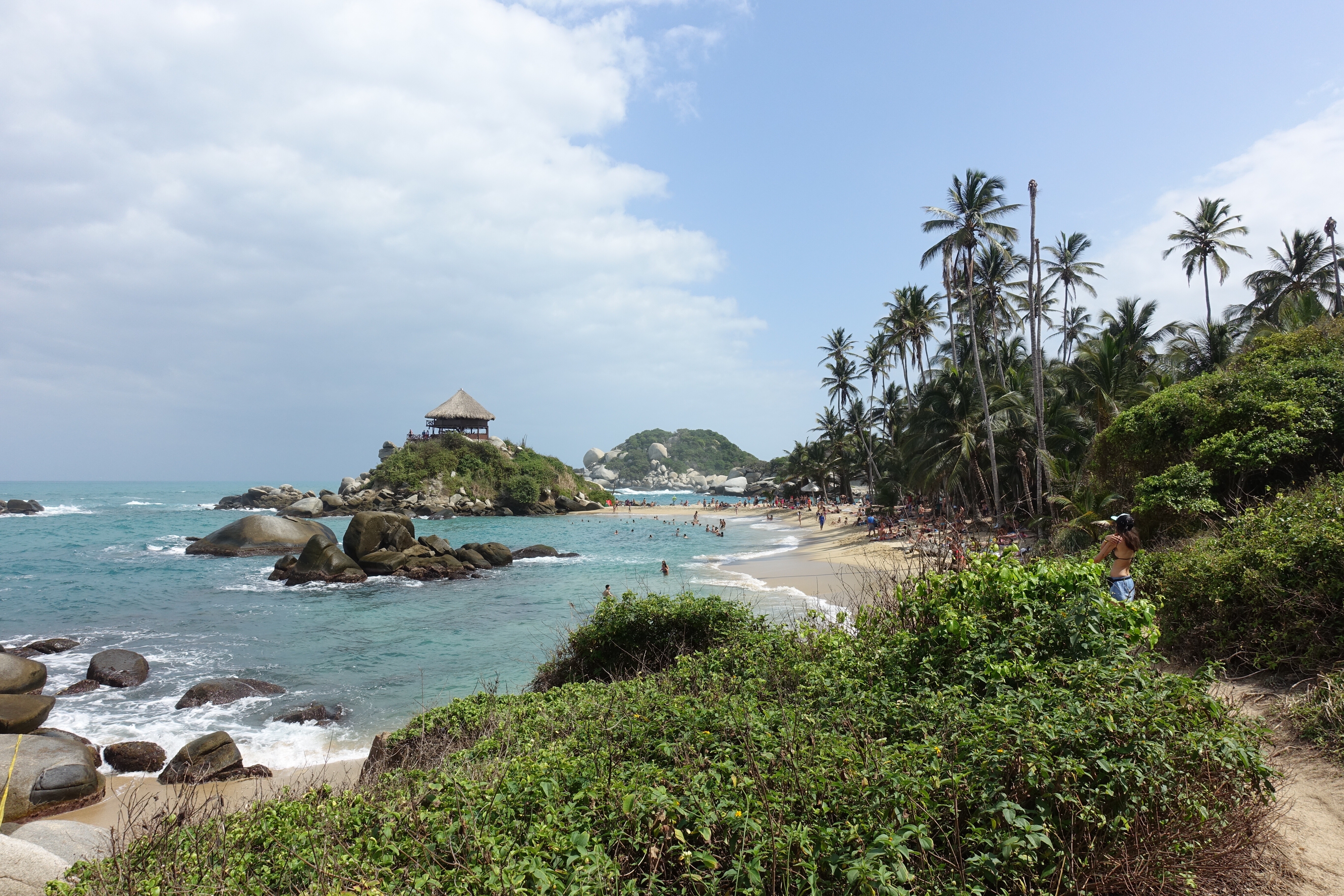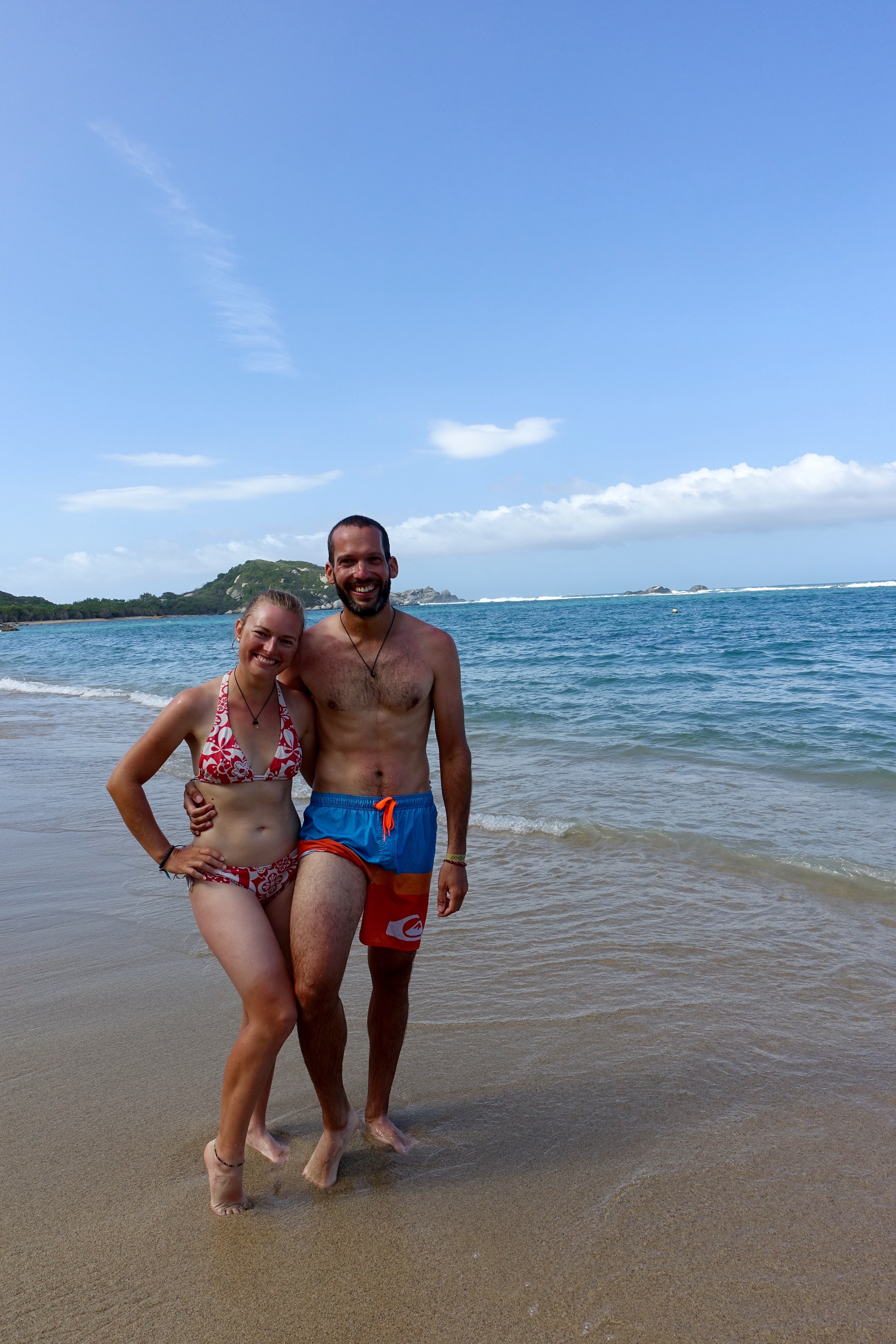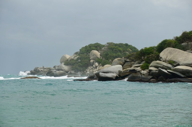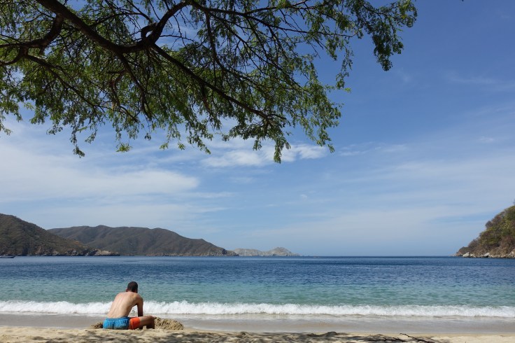 24 janvier: nous nous rendons à Tayrona, un parc naturel protégé. Au programme de cette journée, marche d’environ 14 km et baignade dans un décor tout simplement grandiose. Entre terre et mer, les couleurs se mélangent subtilement et nous offrent des paysages somptueux. De cette journée, je garde de nombreux et précieux souvenirs: les vagues qui déferlent violemment d’un bruit sourd sur les immenses rochers, mes pieds qui s’enfoncent dans le sable blanc, le gros singe qui se balade d’arbre en arbre avant de disparaître dans la dense végétation, les groupes d’oiseaux qui forment des images dans le ciel, les immenses palmiers qui dansent au rythme du vent, les sourires complices, les échanges sur tout, sur rien, sur la Vie, tout simplement… Cette journée se termine sur un toit terrasse de Santa Marta autour d’un bon repas. Ce soir-là, on fait « péter le budget »! C’est notre maman qui nous offre le souper! Mhmmm, le petit goût de ceviche est encore là! 🙂