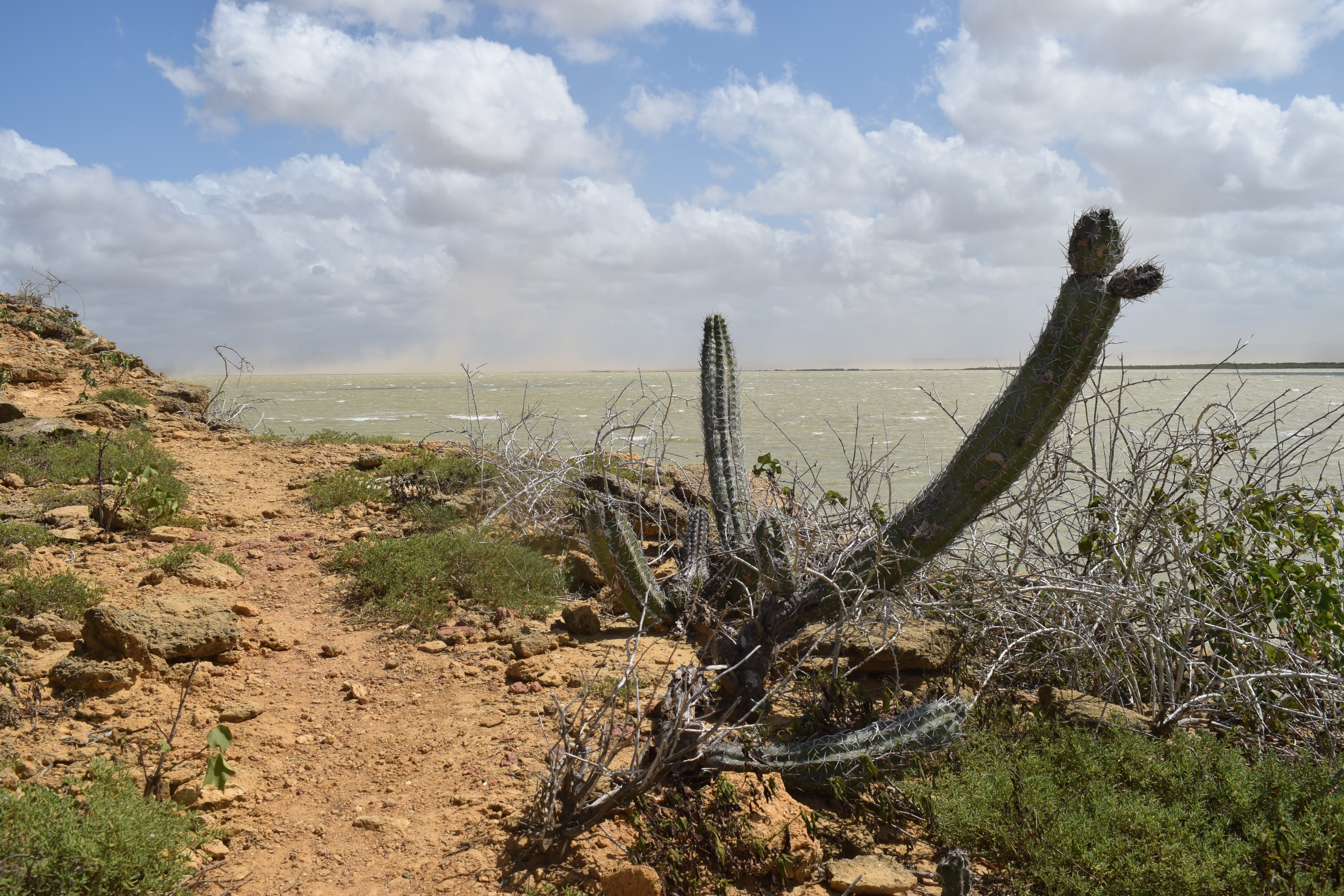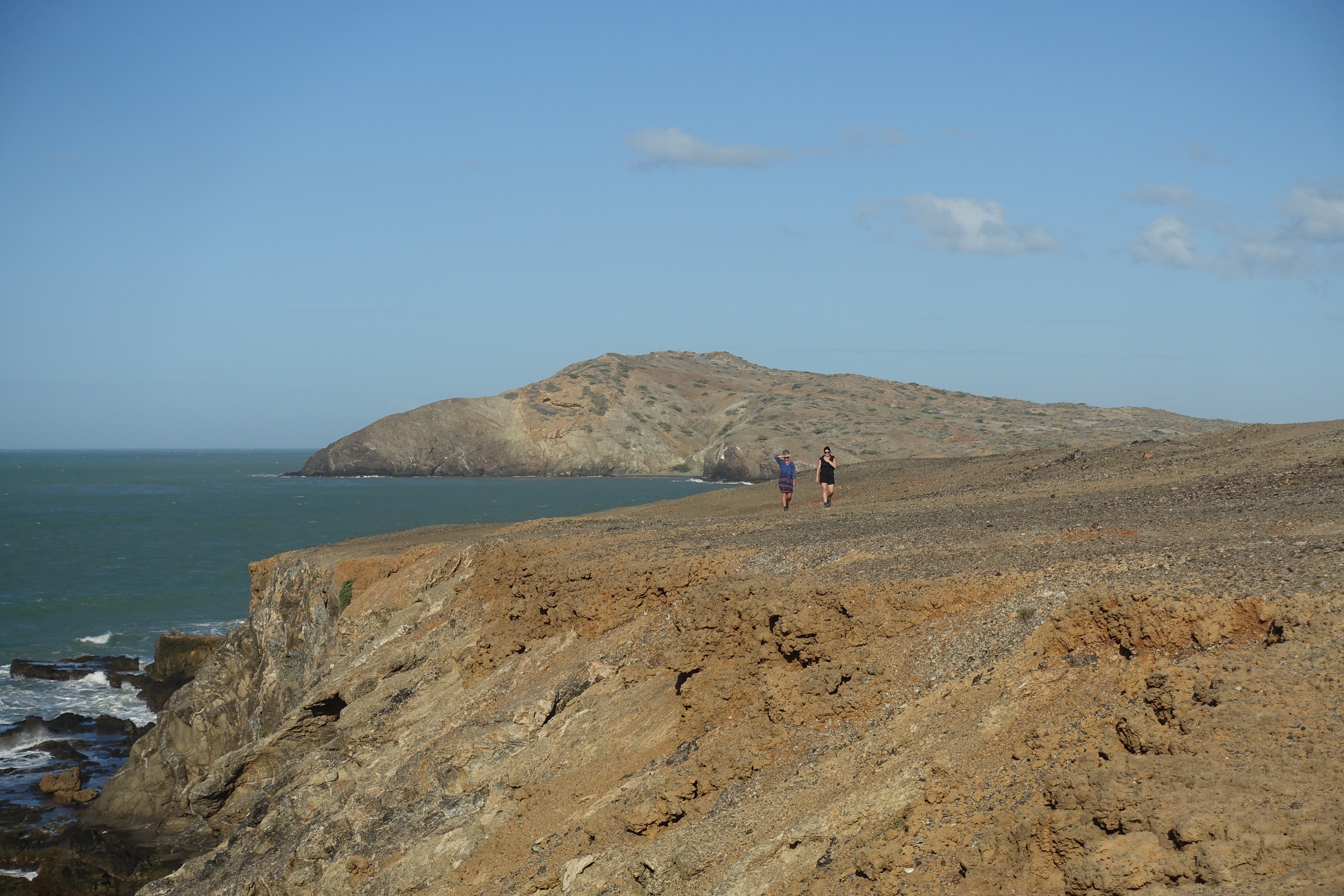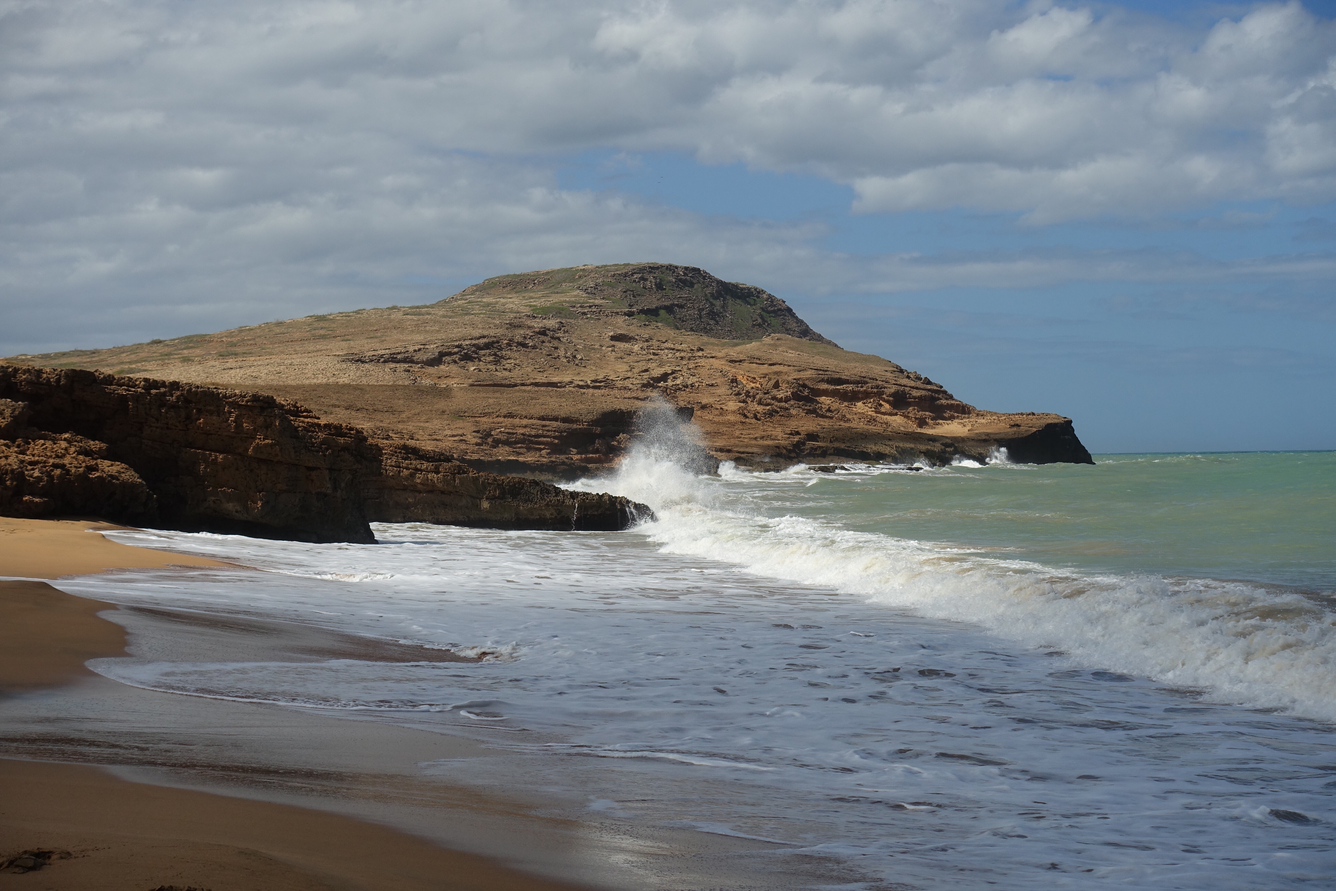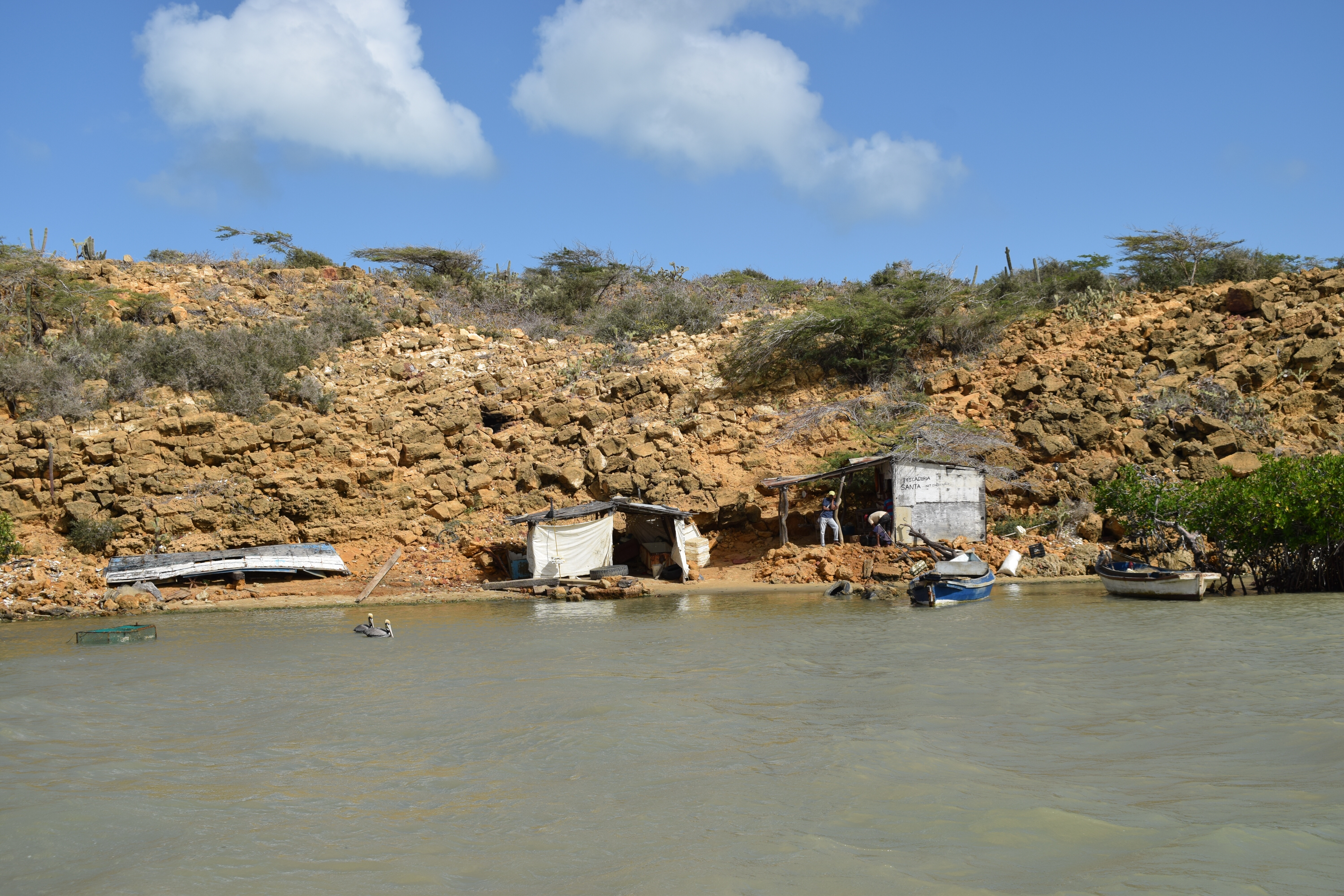 28 janvier: nous voilà listos pour atteindre notre dernier but: la Punta Gallinas, le point le plus au nord de la Colombie et de l’Amérique du Sud. C’est en jeep, à travers le désert que nous entamons le trajet de bonne heure après un petit tinto! Le soleil se lève durant le voyage et le paysage se dessine doucement derrière les branches d’arbres et les nombreux cactus. Puis une lancha nous attend pour nous amener là où nous logerons… ou… c’est plutôt nous qui l’attendons! Nous arrivons dans un environnement désertique où la nature est surprenante et très diversifiée. Le plateau, les dunes de Taora, les falaises rocheuses sortant de la mer ainsi que les racines de mangroves forment un tableau extraordinaire qui démontre la richesse et la variété des paysages que la Colombie recèle.