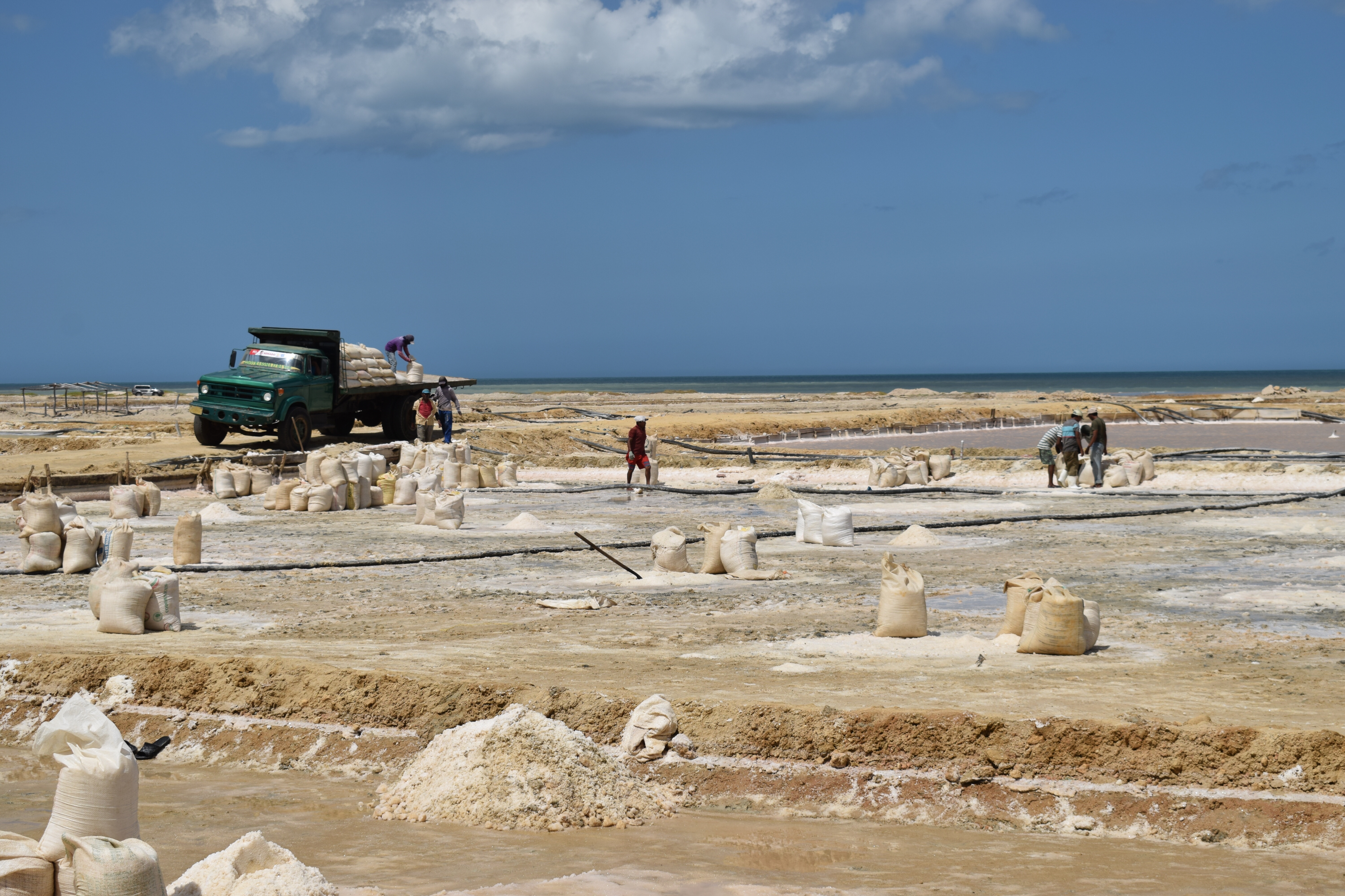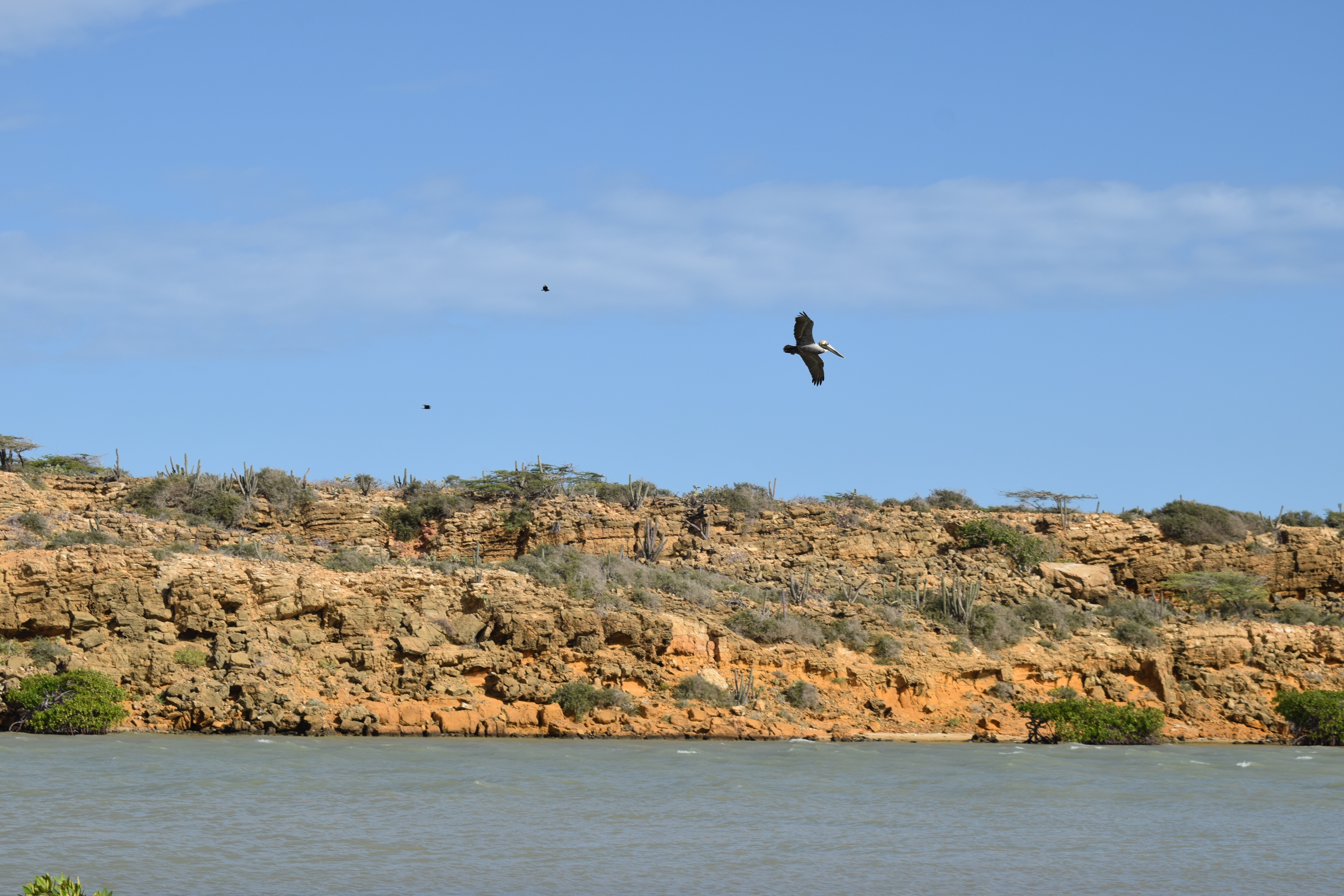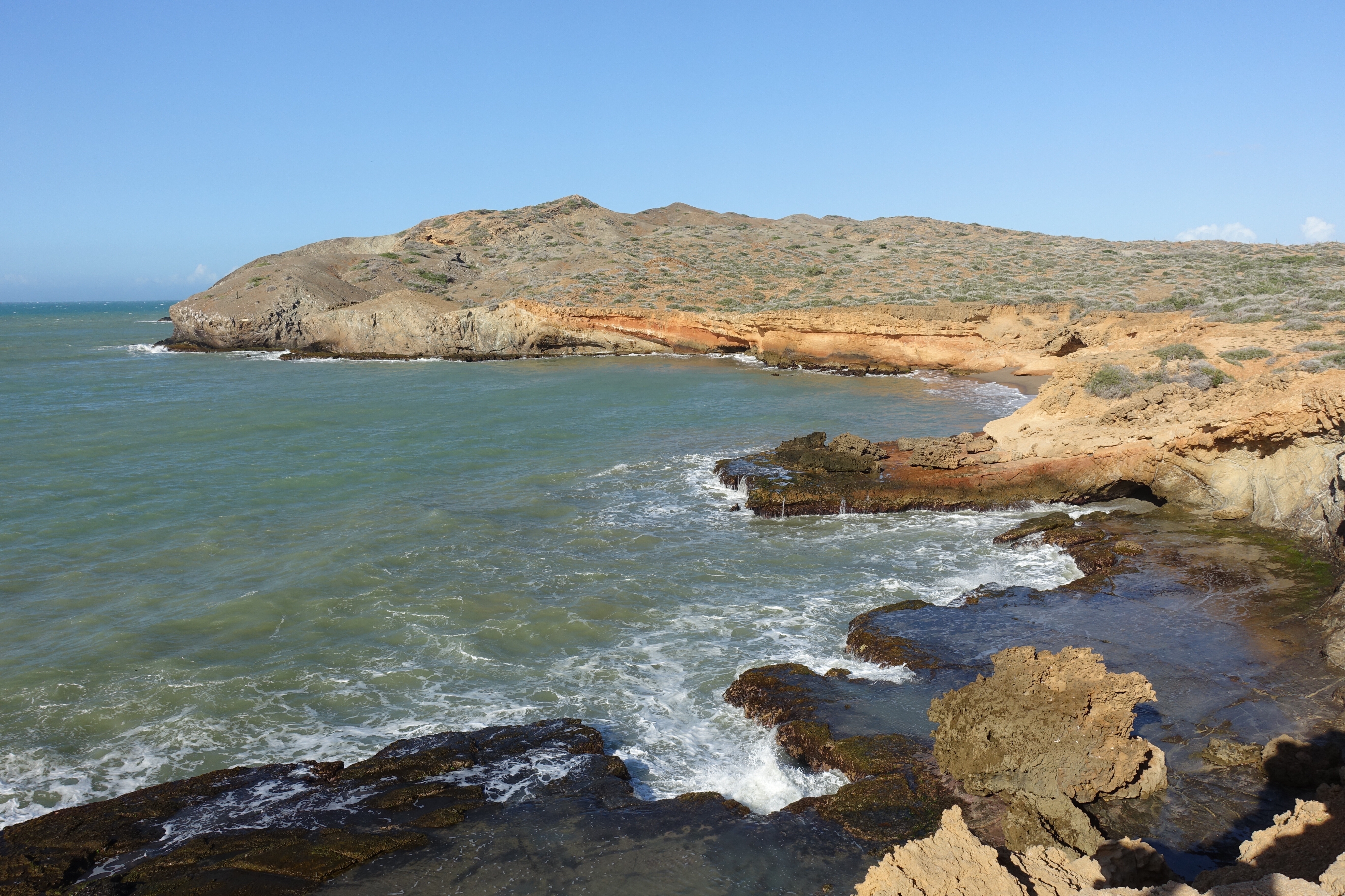 28 janvier: nous voilà listos pour atteindre notre dernier but: la Punta Gallinas, le point le plus au nord de la Colombie et de l’Amérique du Sud. C’est en jeep, à travers le désert que nous entamons le trajet de bonne heure après un petit tinto! Le soleil se lève durant le voyage et le paysage se dessine doucement derrière les branches d’arbres et les nombreux cactus. Puis une lancha nous attend pour nous amener là où nous logerons… ou… c’est plutôt nous qui l’attendons! Nous arrivons dans un environnement désertique où la nature est surprenante et très diversifiée. Le plateau, les dunes de Taora, les falaises rocheuses sortant de la mer ainsi que les racines de mangroves forment un tableau extraordinaire qui démontre la richesse et la variété des paysages que la Colombie recèle.