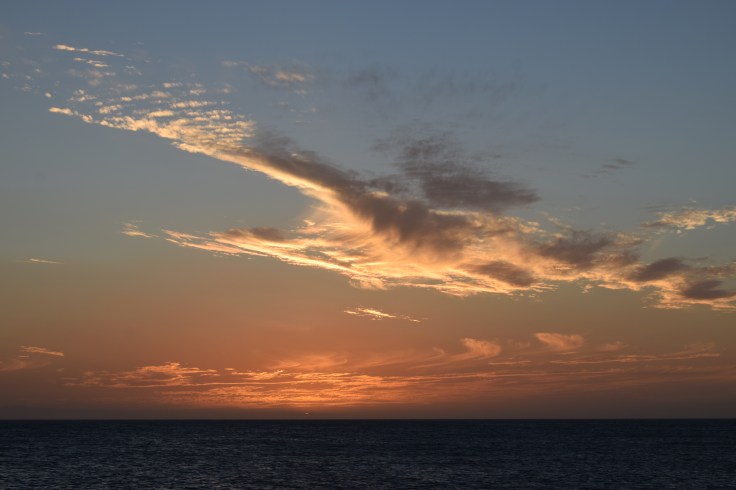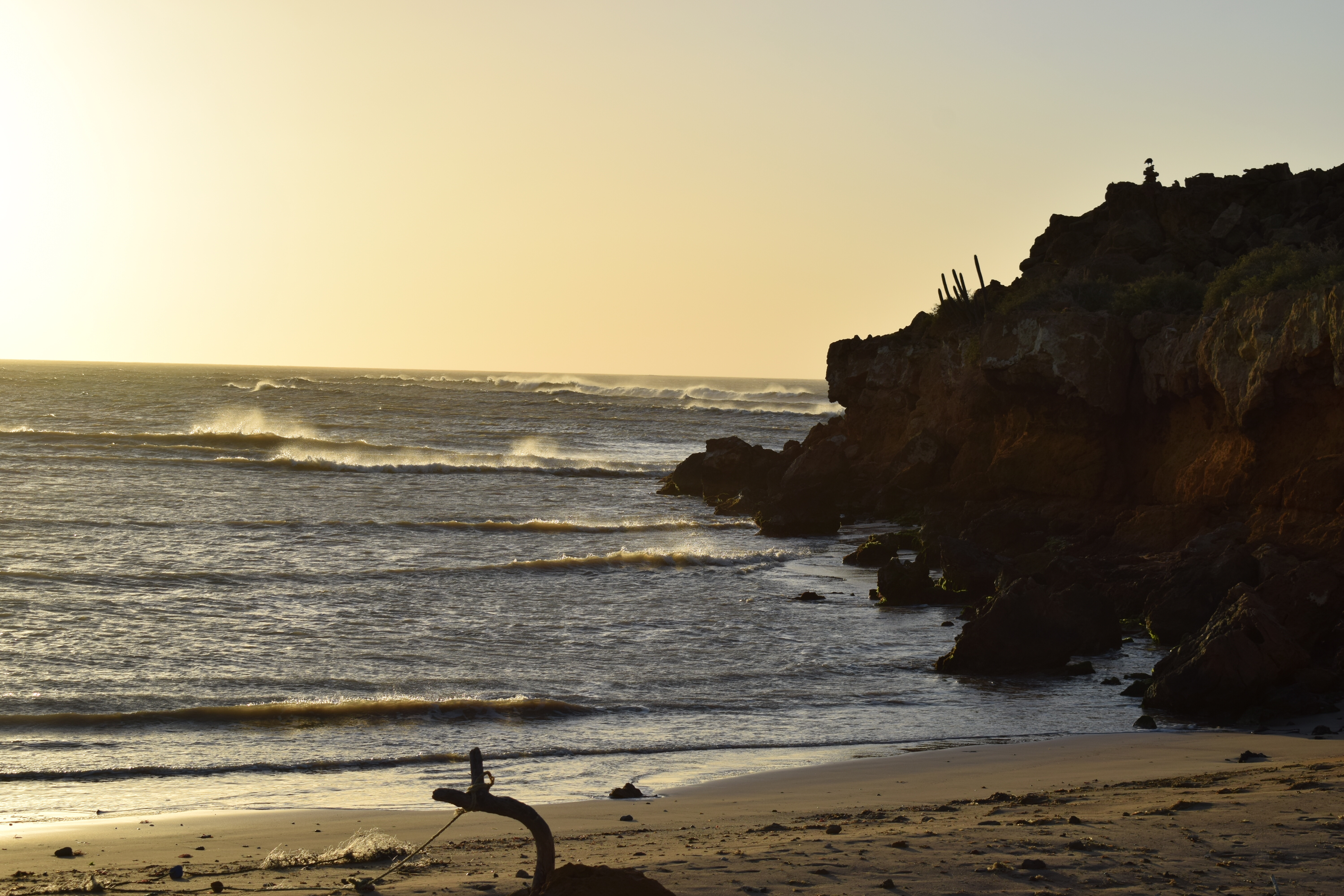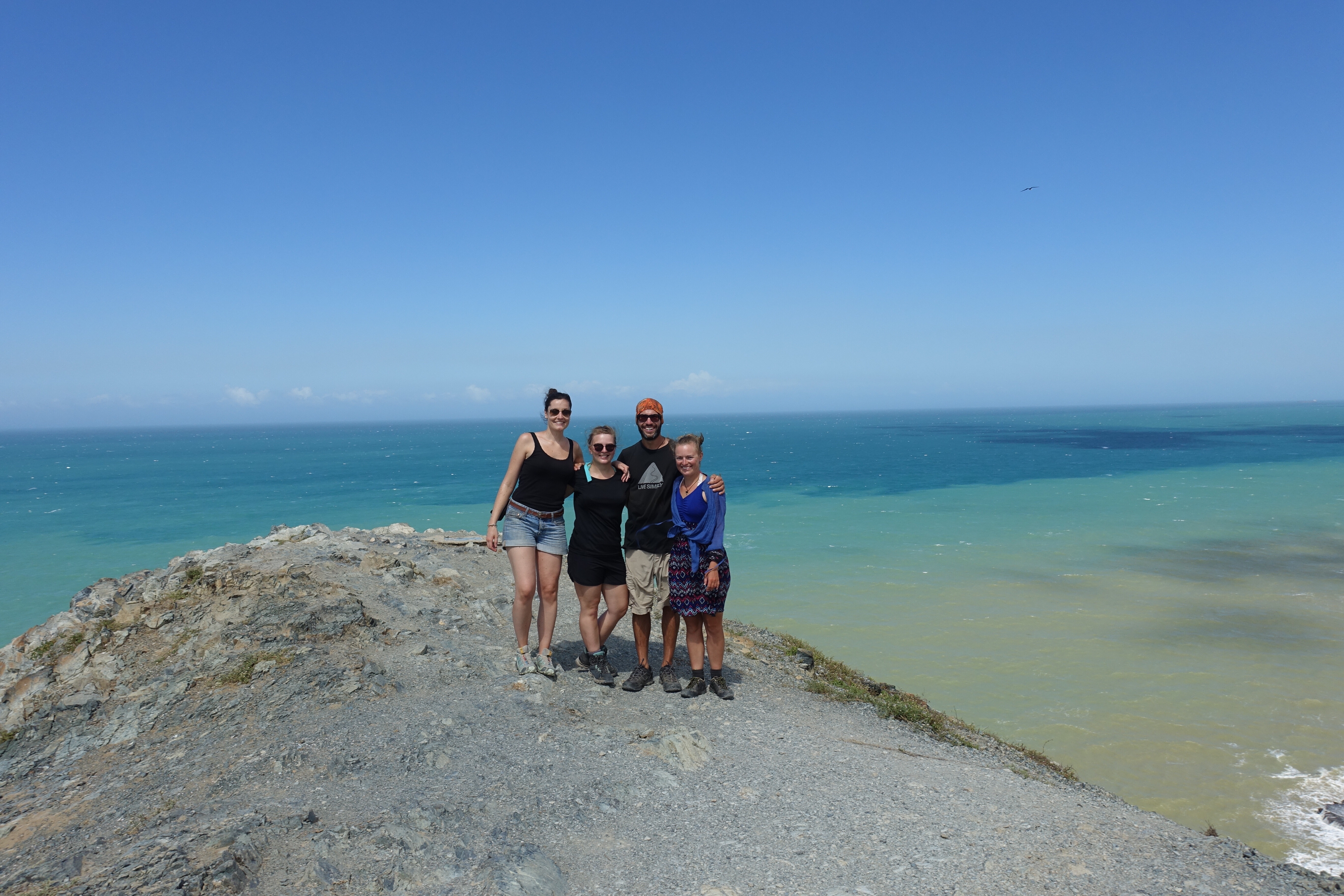 Cabo de la Vela, voilà ce que je retiens de toi… D’abord la douche à ciel ouvert, des millions d’étoiles me regardent, je suis un peu gênée, je me sens petite dans cette immensité! Puis, nos deux nuits dans les hamacs suspendus à quatre mètres de la mer. Ici, il n’y a quasiment personne… Chut! Ecoutez et découvrez mon premier réveil: tout doucement une vague est poussée vers l’avant, elle vient se poser sur le sable. L’écume qui glisse et frétille encore quelques secondes avant de se retirer à pas de loup. J’ouvre les yeux, devant moi la mer et rien que la mer: verte, bleue, azurée,… Les couleurs se transforment sous les rayons du soleil. Le vent, quant à lui, dessine des sillons à la surface de l’eau. Sans un bruit, quelques chiens errants se baladent sur la plage et des crabes jouent à cache-cache dans le sable. J’entends ensuite le cri d’une frégate, elle est sans doute à la recherche de son déjeuner, car tout comme moi, elle reste un bon moment plantée là. Dans mes souvenirs, je nous revois, nous quatre, à l’autre bout du monde, au bord de la plage, buvant une bière colombienne en regardant les kitesurfeurs virevolter dans le ciel avec pour fond, un magnifique coucher de soleil. Pour finir, je garde en mémoire notre journée de marche sous un soleil de plomb avec pour seules provisions: quatre lulos, deux carottes, trois sachets de cracottes, quatre tomates d’arbre, un paquet de pain toast et un petit bout de fromage. J’avoue, j’ai la trouille, aujourd’hui, nous allons peut-être mourir de faim! Mais non, je me suis trompée, tout ira bien pour mon bidon… Toutefois, avec le recul, je me demande si ce jour-là, je n’ai peut-être pas mangé avec mes yeux, car il faut l’admettre entre le Pilón de Azucar, la crête, les falaises, le phare, le geyser maritime, j’en passe et des meilleures, j’en ai pris plein la tête!
