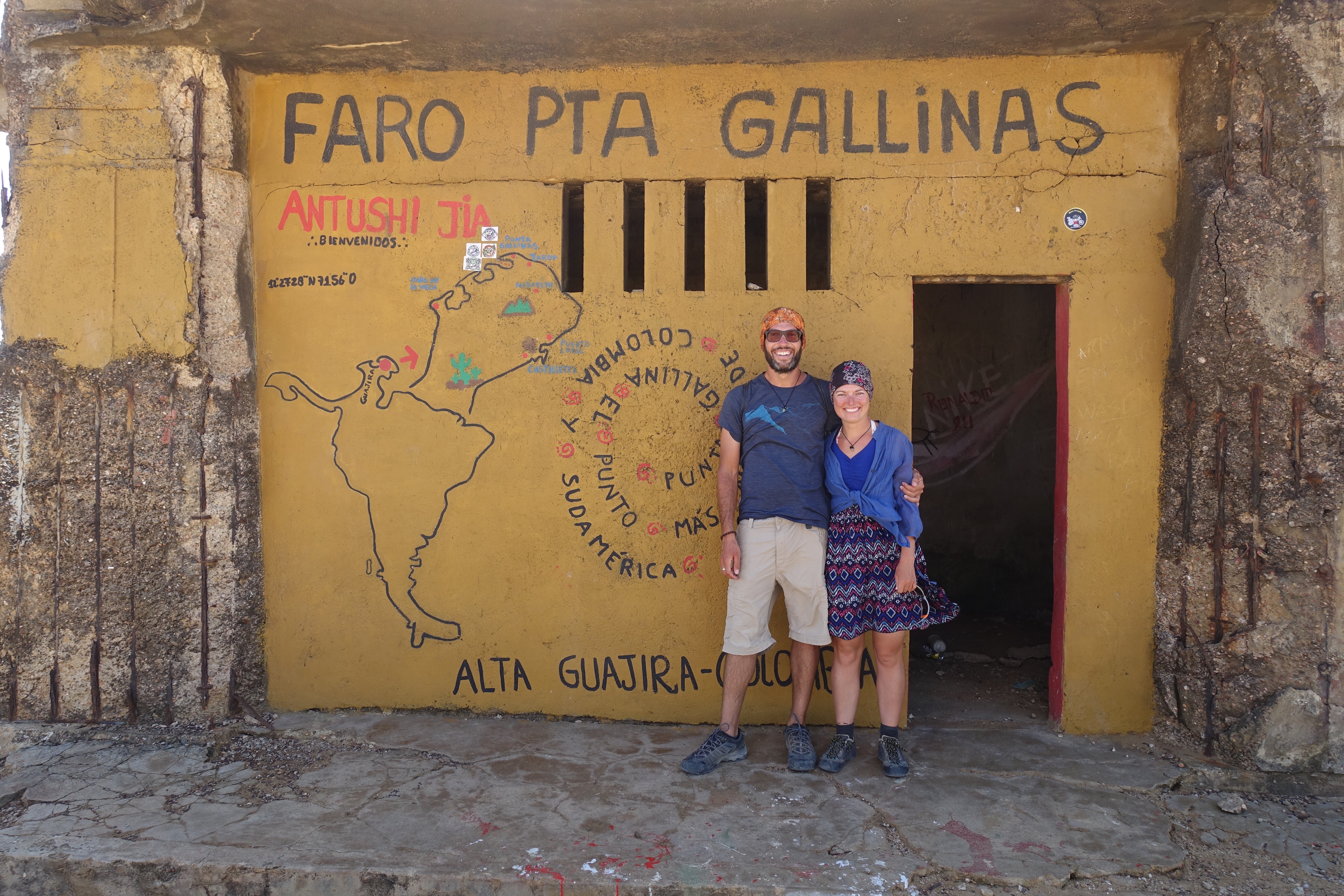 26 janvier: on embarque, destination Cabo de la Vela sur la péninsule de la Guajira. En accéléré, voici l’histoire du trajet. Notre voiture va très vite entre Riohacha et Uribia, aussi Arthur interpelle le chauffeur sur sa vitesse. Celui-ci lui répond: « nous sommes obligés d’être rapides, au risque sinon, que les fermiers de la région nous agressent »! M’ouay! Nous ne sommes pas franchement convaincus par cette explication! Entre nous, des petits sourires s’échangent! Arrivés à Uribia, on s’entasse avec des locaux dans une jeep. Les moindres recoins du véhicule sont utilisés car dans la péninsule les denrées sont rares, il faut prendre des provisions. Dans la jeep qui file sur la piste de sable, les regards se croisent, s’apprivoisent, se sourient puis les langues se délient… Arrêt sur image : il y a cette femme qui explique que son travail c’est d’être ama de casa. Avec Sarah, on le traduit comme « être l’âme de la maison », une belle manière d’expliquer qu’elle est femme au foyer. Nous apprenons par après qu’en espagnol l’âme se dit alma. Nous nous sommes donc trompées. Toutefois, nous retenons le charme du moment. Il y a aussi ce petit garçon lové dans les bras de son papa qui me regarde de temps à autre avec ses yeux noisettes plein de lumière; puis cet homme d’environ 35 ans qui est venu de Bogotá jusqu’ici à pied en 26 jours; à côté de lui un vieux monsieur au regard doux qui ne dira pas un mot du trajet, sans doute parle-t-il seulement le wayuu; il y a aussi cette fillette de huit ans qui, d’abord intimidée devant Arthur, devient malicieuse et joueuse. Fin de l’arrêt sur image, reprise de la route. La jeep file à toute allure, nous nous enfonçons dans le désert. Ici et là, des cahutes en bois, perdues au milieu de nulle part. Tout est très sec et pourtant, là-bas, au loin, on aperçoit un point de couleur, du turquoise, c’est la mer…