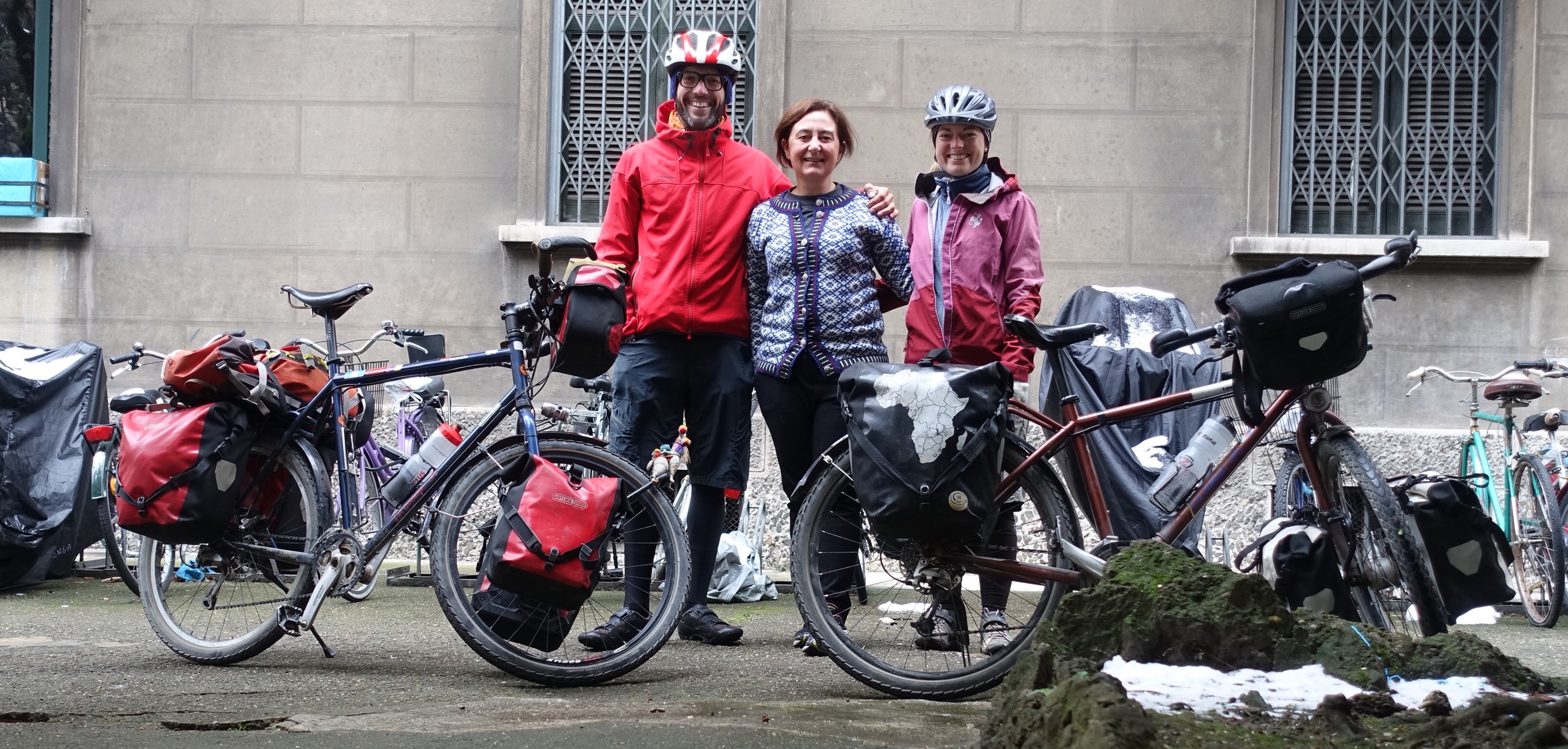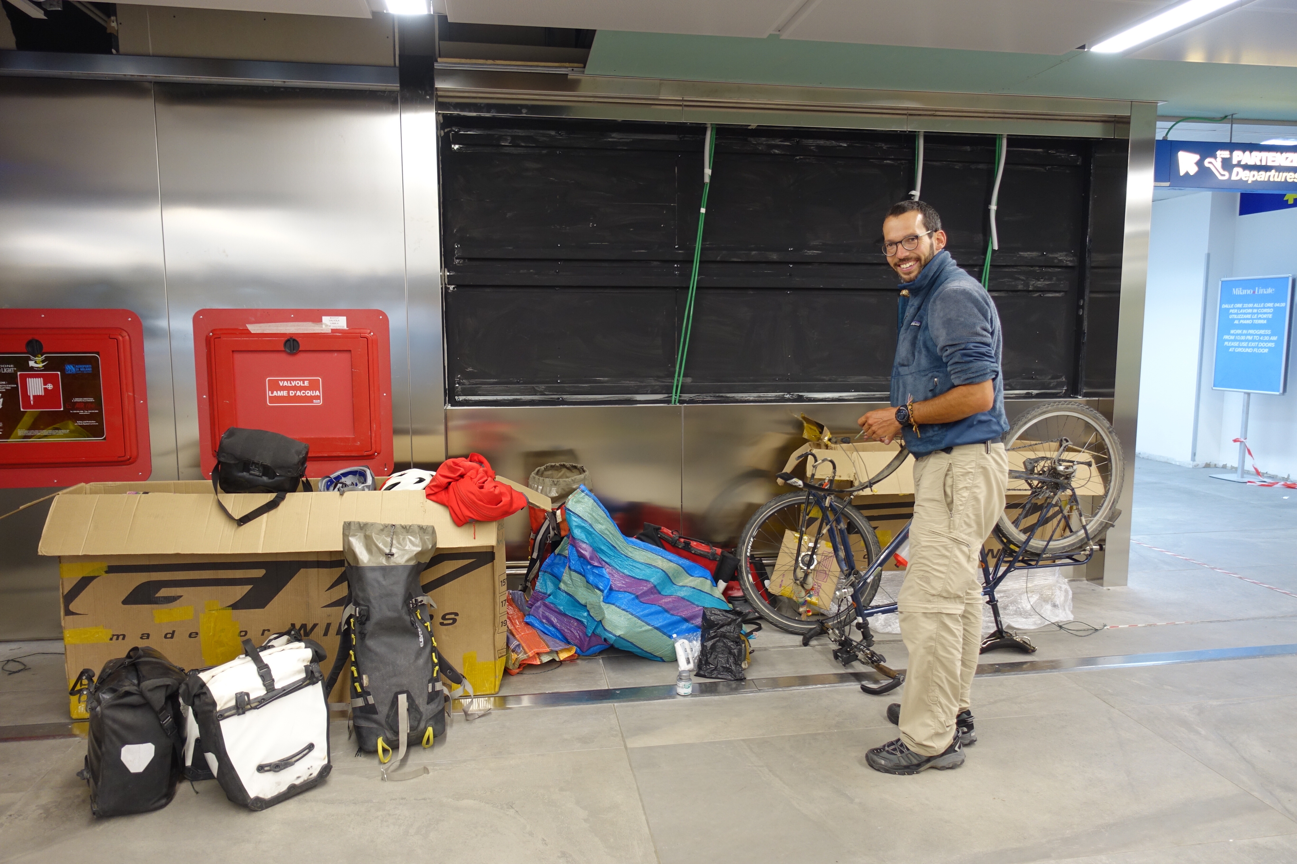 Jamais un vol long-courrier ne m’a paru aussi rapide. Il faut dire qu’en volant à rebrousse fuseaux, la nuit fut courte. L’envie de revenir en Europe, de redécouvrir ce que l’on connaît déjà (ou que l’on croit connaître encore…) avec d’autres yeux, le fait de quitter la Colombie sereins et comblés, d’avoir le sentiment d’avoir bien profité jusqu’au bout aident certainement à ce retour, inéluctable dès le premier coup de pédale! C’est donc avec la buena onda que nous atterrissons à Milan Linate, le petit aéroport à « deux pas du centre-ville, si vous chaussez du trois kilomètres »! (Yann Marguet, les Orties 023). A peine arrivés et déjà au boulot! Nous nous trouvons un coin dans l’aéroport pour déballer nos cartons, nos bagages et là, commence le remontage de nos montures et le remplissage des sacoches, sous le regard parfois curieux des passants. Un des travailleurs de l’aéroport nous demande ce que l’on va faire, car dehors « il fait froid ». Rien de bien méchant, ce soir nous allons seulement jusqu’au centre-ville, rejoindre Monica, qui nous accueille chez elle! En sortant de l’aéroport nos vélos à la main, nous repassons devant le travailleur inquiet qui nous met à nouveau en garde contre le froid…
