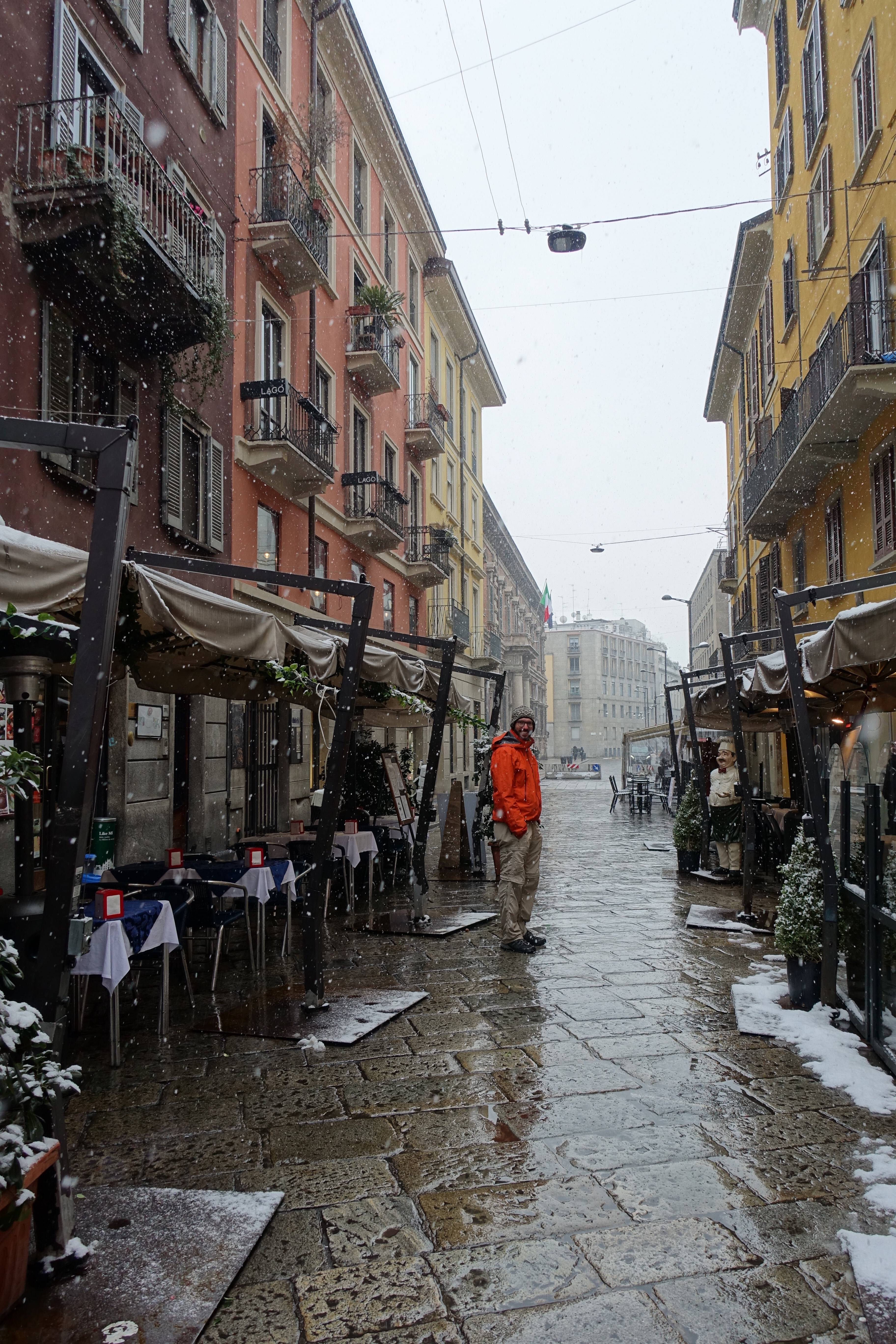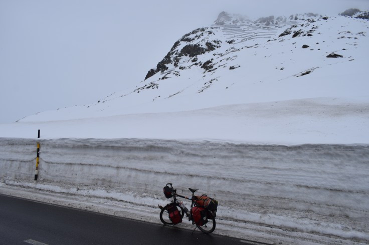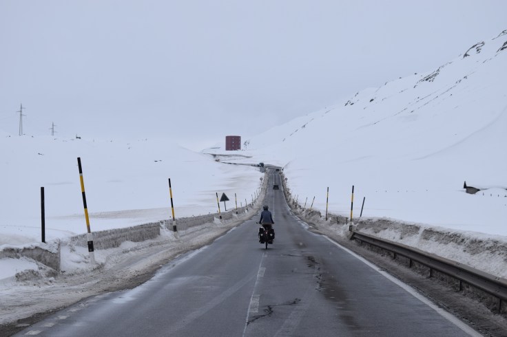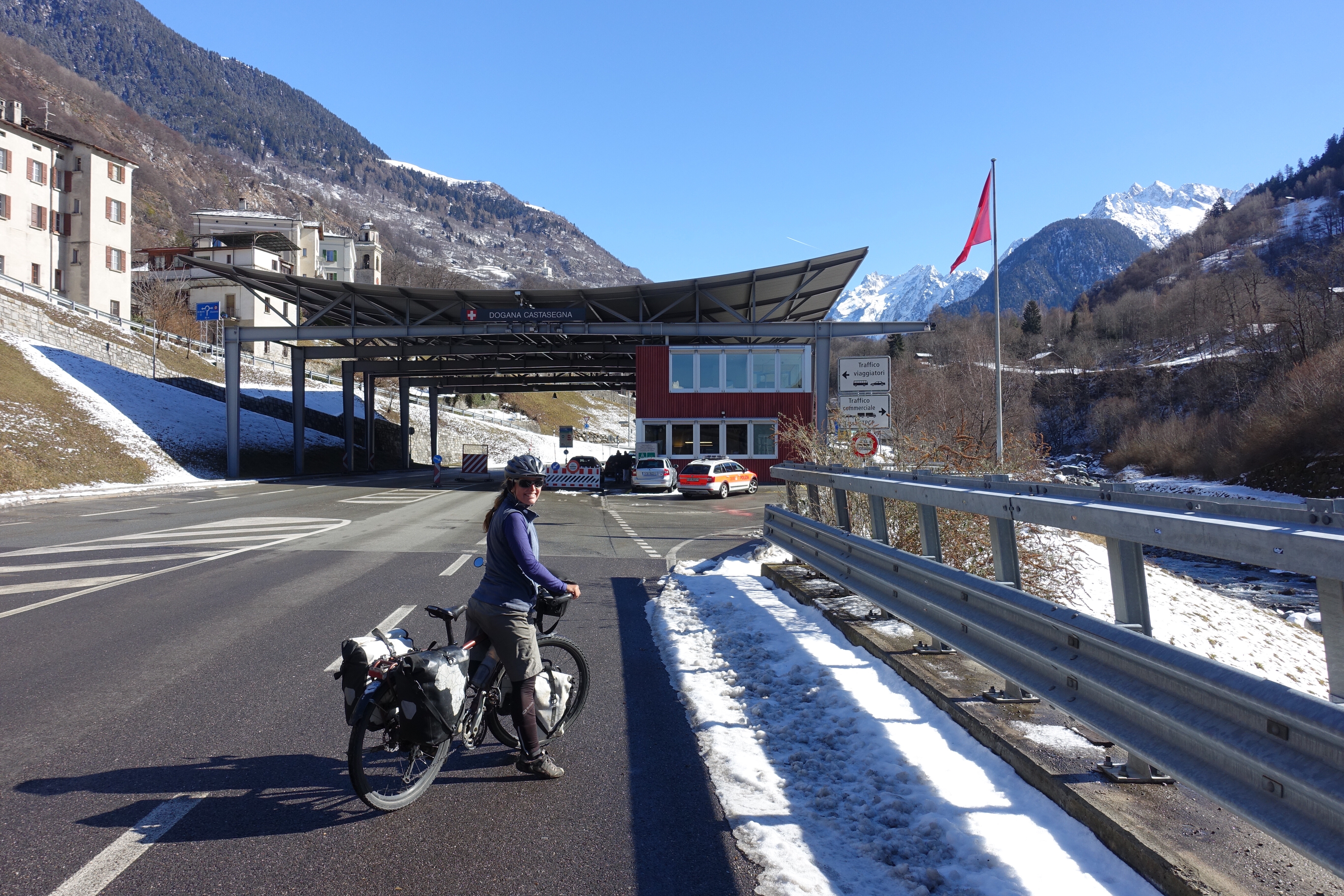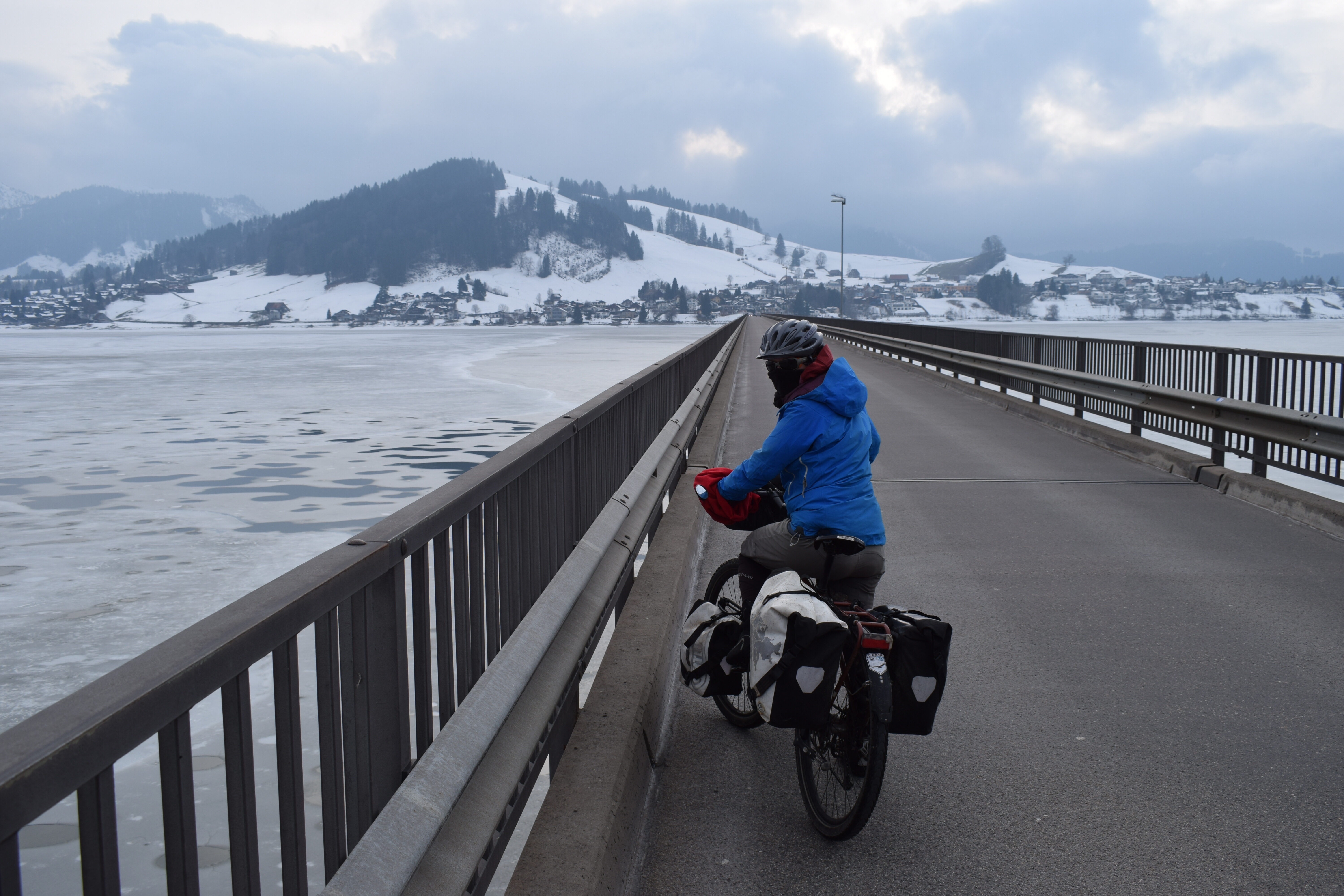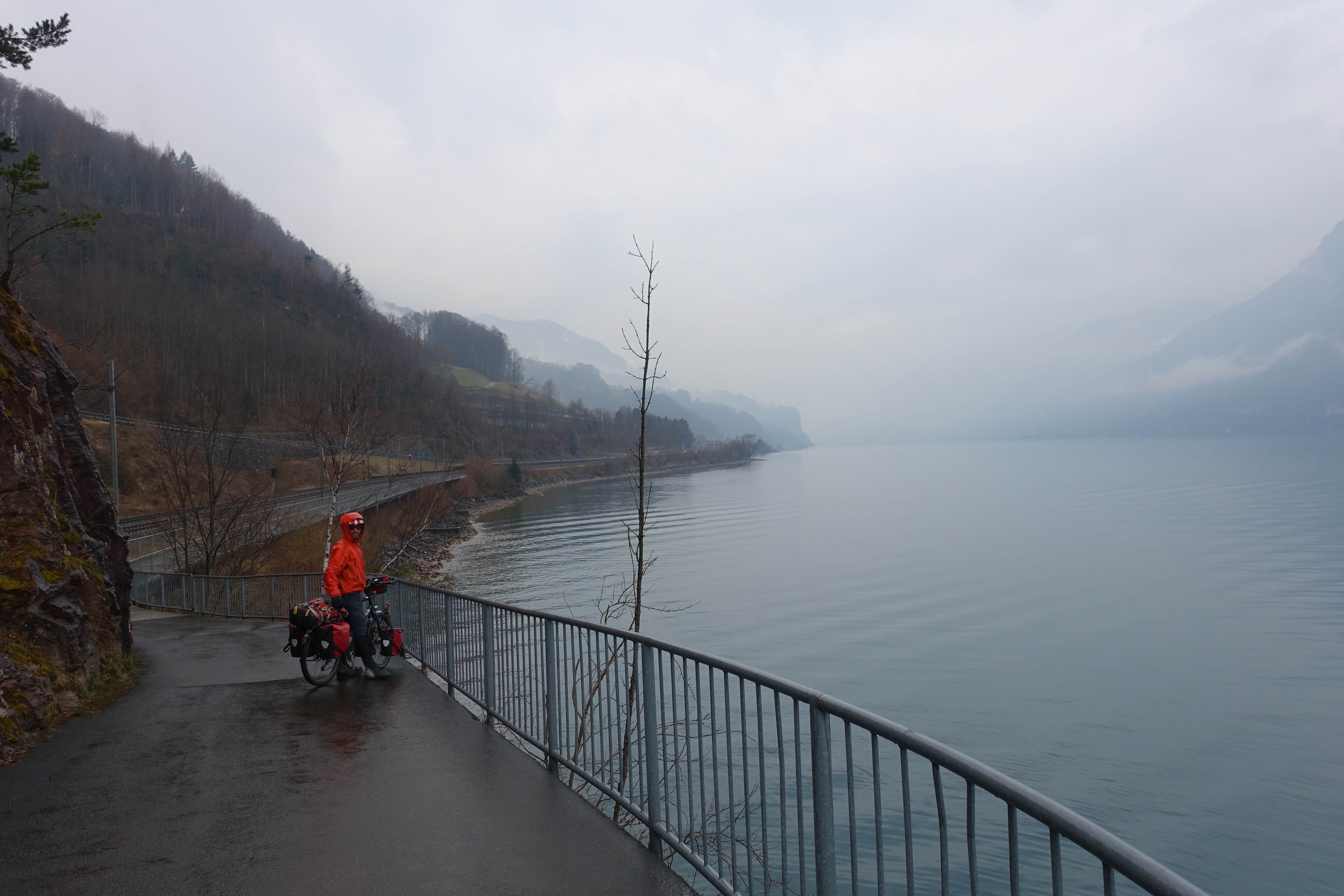 Nous profitons de ces deux jours pour visiter un Milan enneigé (les terrasses du Duomo sont même fermées!), pour (re)découvrir les spécialités culinaires lombardes et italiennes, déguster des cafés dignes de ce nom, acheter des chaussettes chaudes pour passer les Alpes… Puis vient le départ pour cet ultime tronçon, le dernier d’une longue série! Après des adieux émouvants avec Monica, nous enfourchons nos montures, qui semblent insensibles au climat hivernal… Nous quittons Milan par un froid vif, puis viennent la neige, la pluie, et enfin la neige à nouveau! C’est complètement frigorifiés que nous nous réfugions dans une pizzeria de Côme! D’un point de vue climatique, nous plaçons cette demi-journée de vélo (40 kilomètres) dans les dix pires jours du voyage, marrant qu’il faille venir en Italie pour souffrir autant, après avoir traversé la cordillère des Andes! L’après-midi, nous longeons le lac de Côme, heureusement au sec. Mais ne vous méprenez pas, c’est plutôt ambiance fjord norvégien que lac alpin ensoleillé!