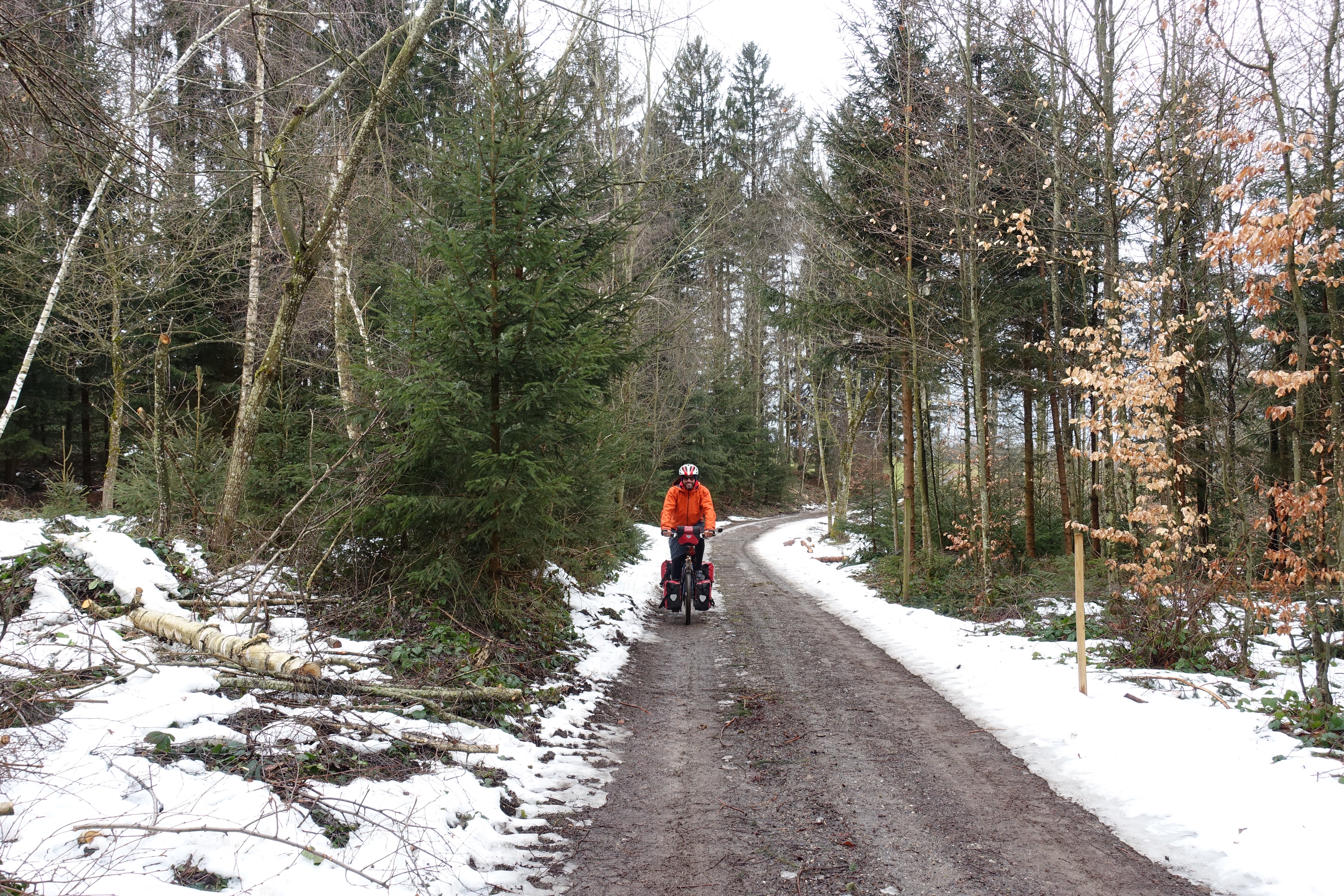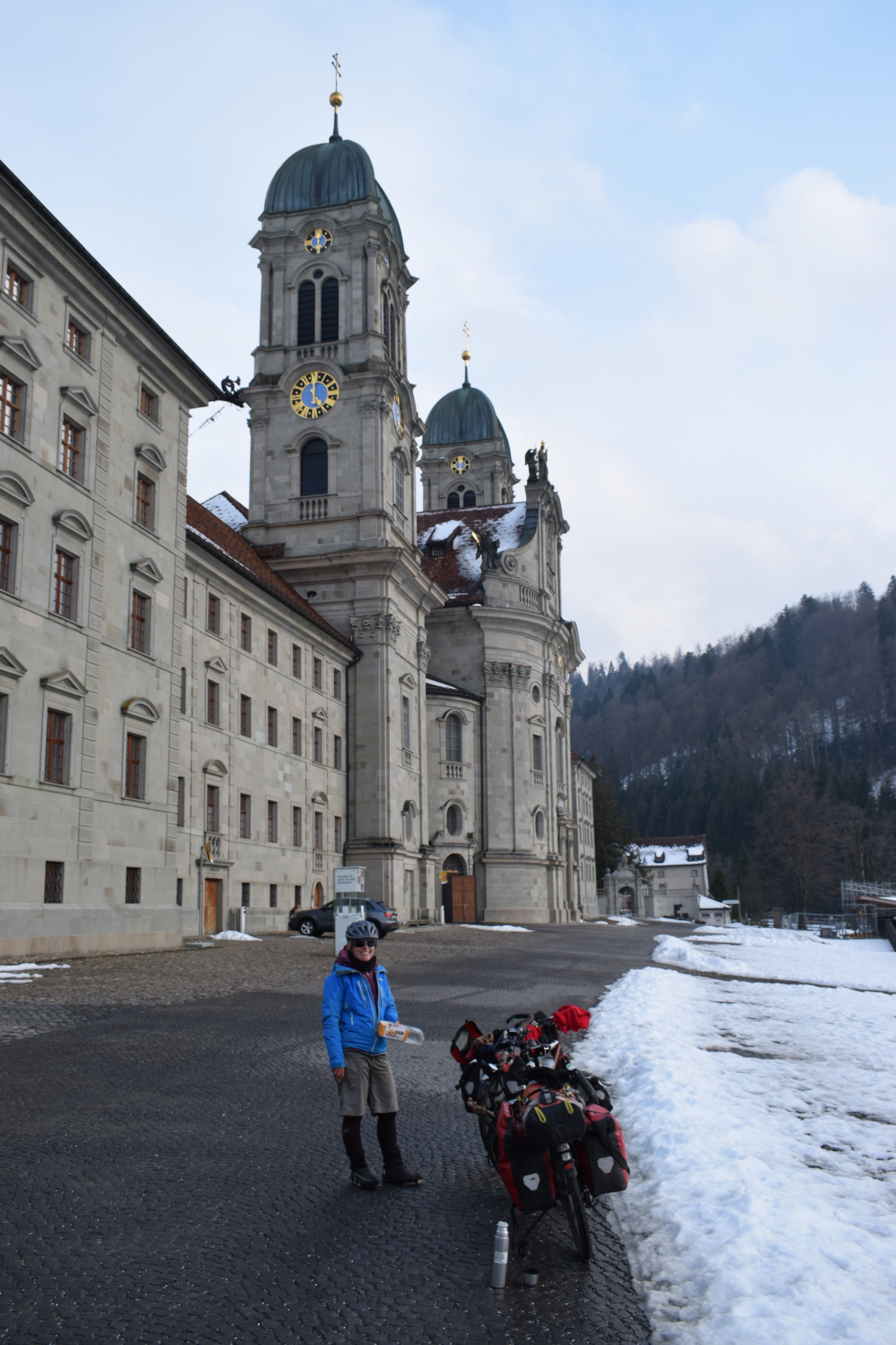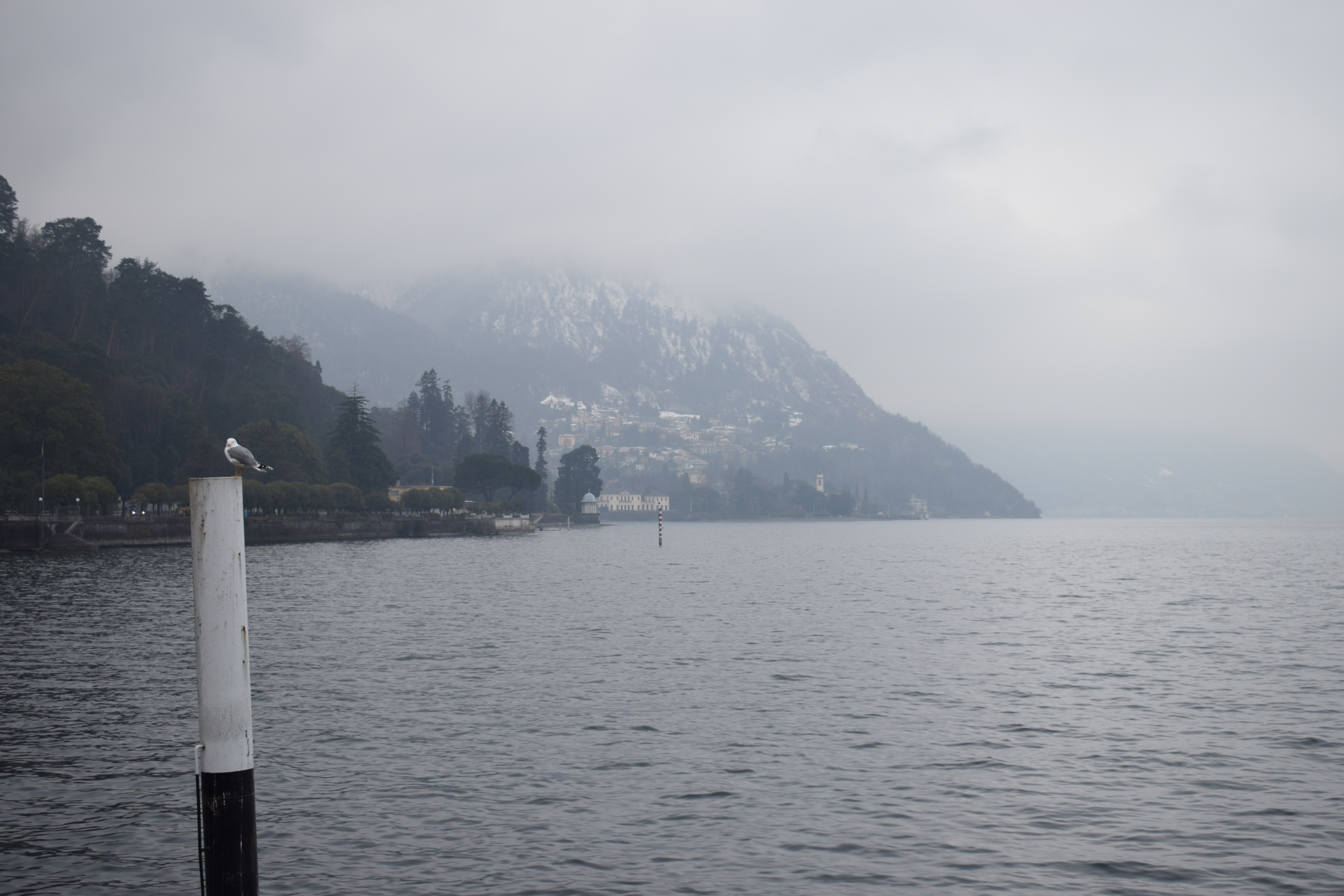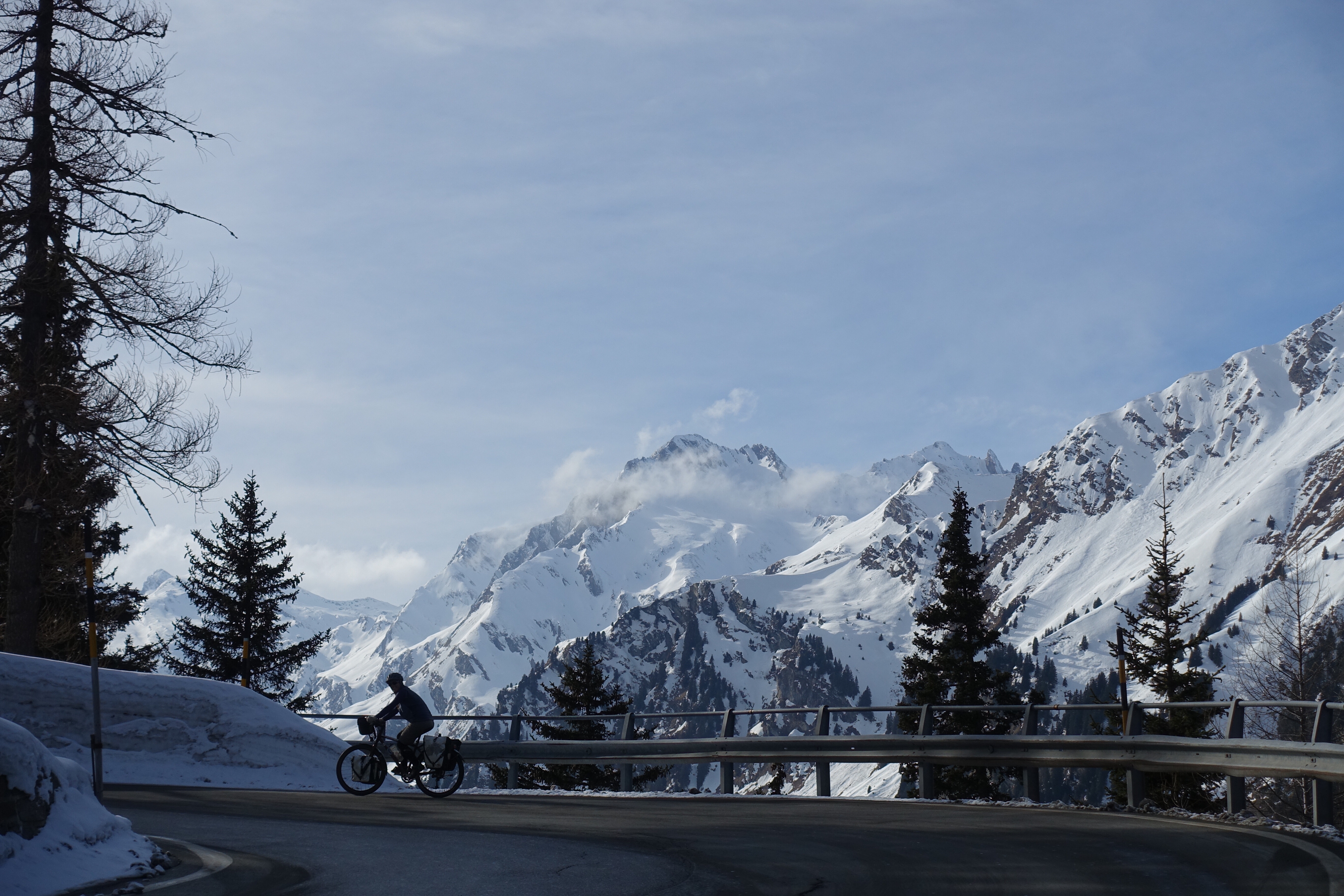 Nous profitons de ces deux jours pour visiter un Milan enneigé (les terrasses du Duomo sont même fermées!), pour (re)découvrir les spécialités culinaires lombardes et italiennes, déguster des cafés dignes de ce nom, acheter des chaussettes chaudes pour passer les Alpes… Puis vient le départ pour cet ultime tronçon, le dernier d’une longue série! Après des adieux émouvants avec Monica, nous enfourchons nos montures, qui semblent insensibles au climat hivernal… Nous quittons Milan par un froid vif, puis viennent la neige, la pluie, et enfin la neige à nouveau! C’est complètement frigorifiés que nous nous réfugions dans une pizzeria de Côme! D’un point de vue climatique, nous plaçons cette demi-journée de vélo (40 kilomètres) dans les dix pires jours du voyage, marrant qu’il faille venir en Italie pour souffrir autant, après avoir traversé la cordillère des Andes! L’après-midi, nous longeons le lac de Côme, heureusement au sec. Mais ne vous méprenez pas, c’est plutôt ambiance fjord norvégien que lac alpin ensoleillé!