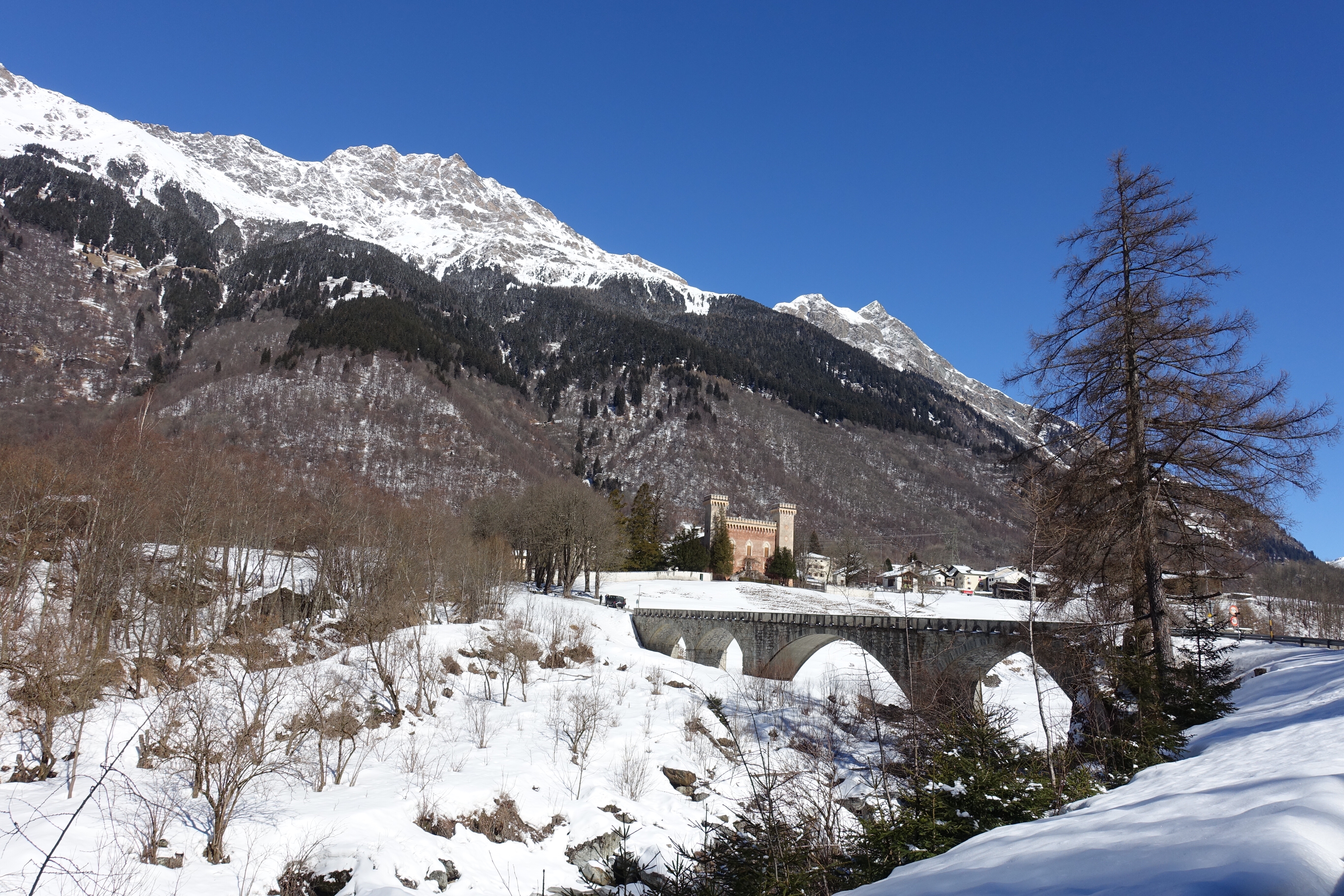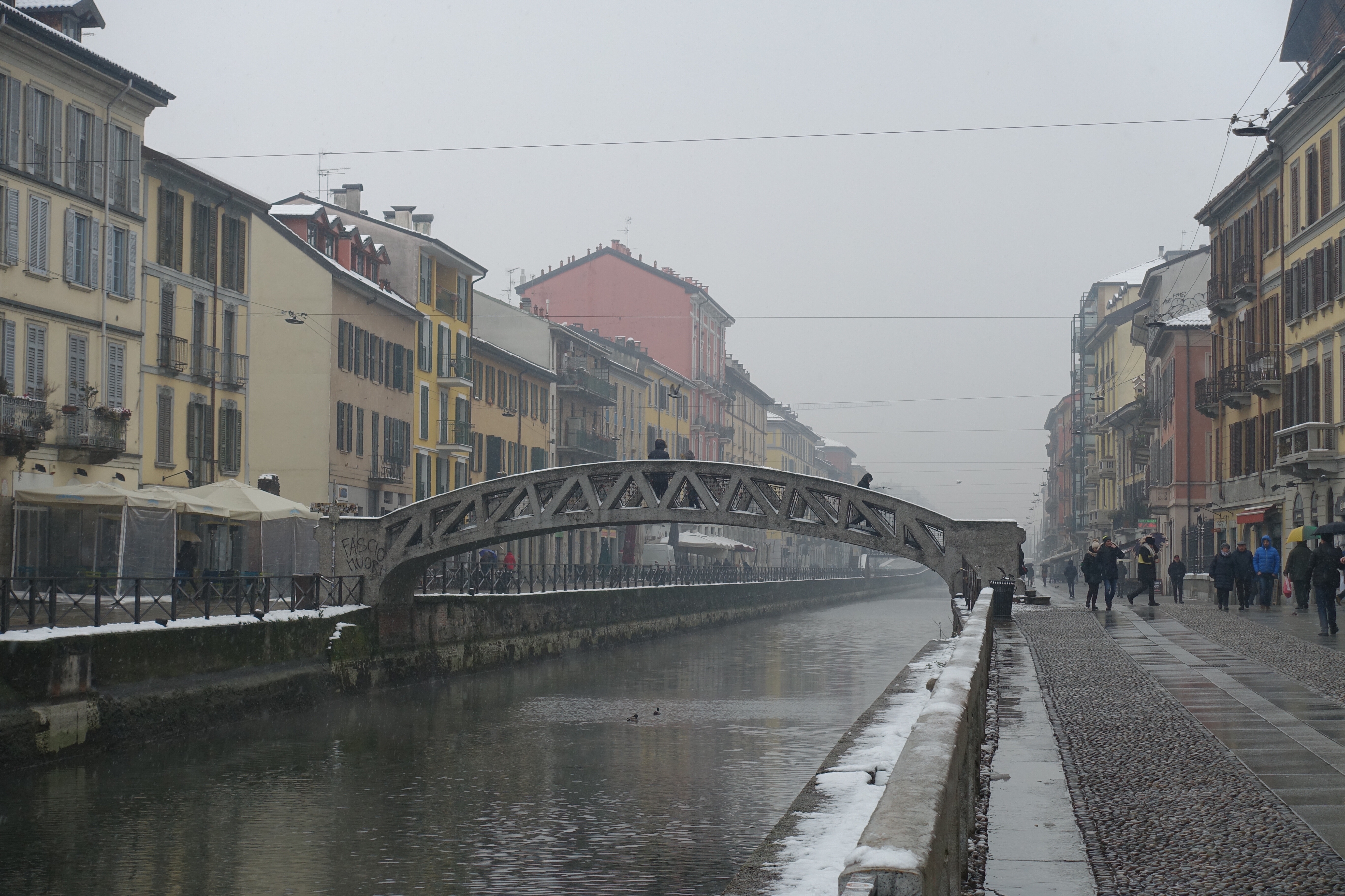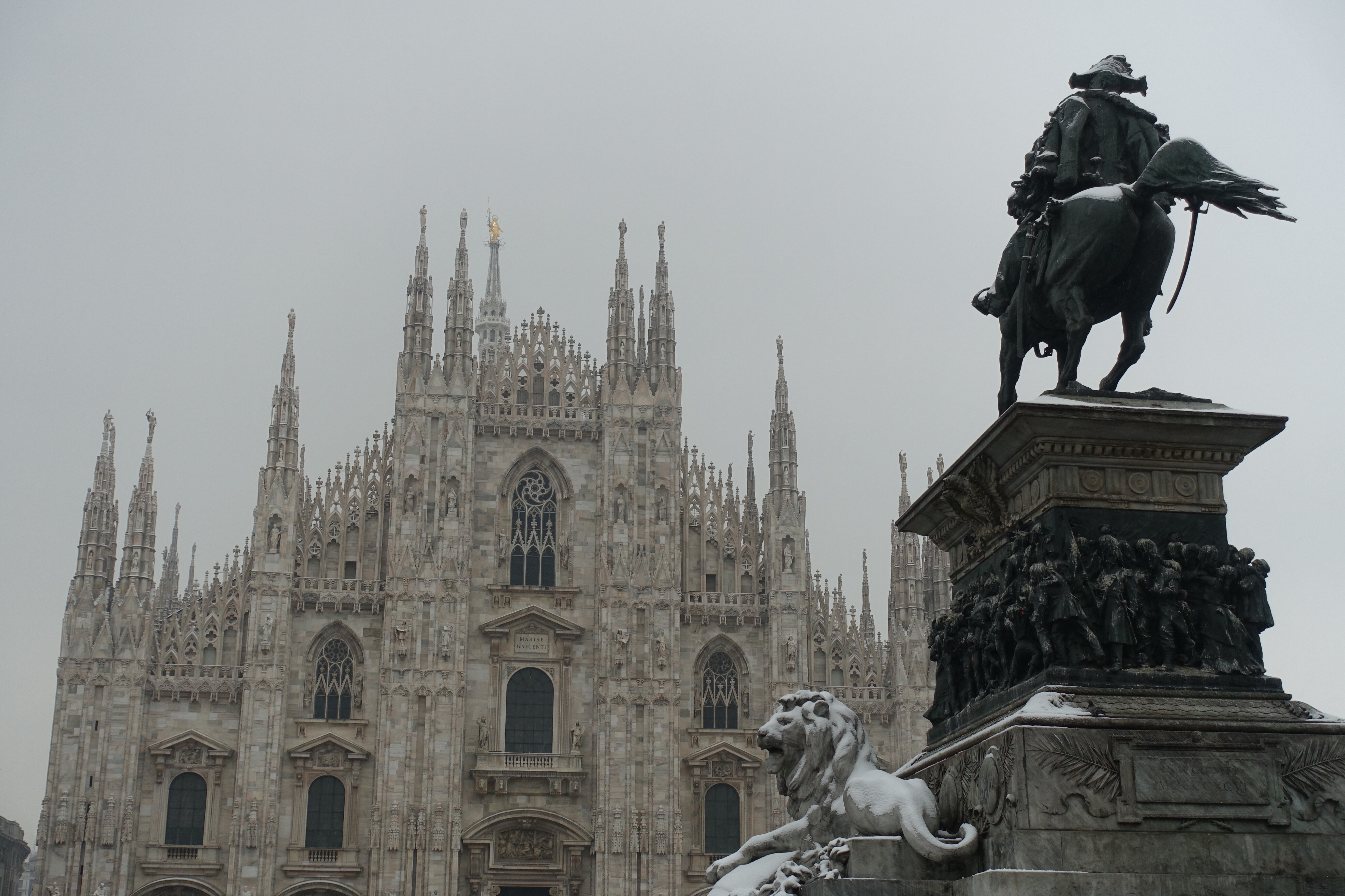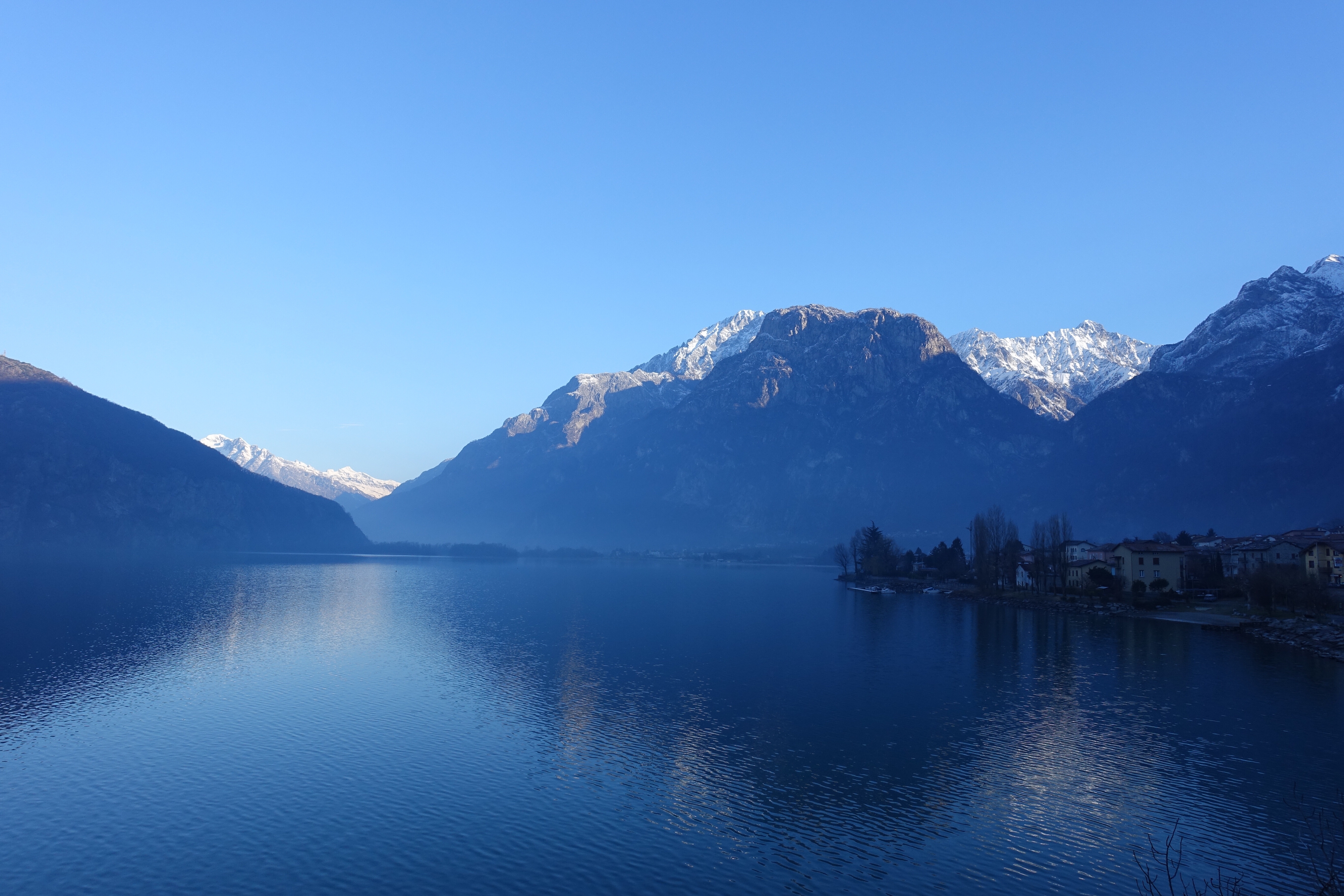 Nous profitons de ces deux jours pour visiter un Milan enneigé (les terrasses du Duomo sont même fermées!), pour (re)découvrir les spécialités culinaires lombardes et italiennes, déguster des cafés dignes de ce nom, acheter des chaussettes chaudes pour passer les Alpes… Puis vient le départ pour cet ultime tronçon, le dernier d’une longue série! Après des adieux émouvants avec Monica, nous enfourchons nos montures, qui semblent insensibles au climat hivernal… Nous quittons Milan par un froid vif, puis viennent la neige, la pluie, et enfin la neige à nouveau! C’est complètement frigorifiés que nous nous réfugions dans une pizzeria de Côme! D’un point de vue climatique, nous plaçons cette demi-journée de vélo (40 kilomètres) dans les dix pires jours du voyage, marrant qu’il faille venir en Italie pour souffrir autant, après avoir traversé la cordillère des Andes! L’après-midi, nous longeons le lac de Côme, heureusement au sec. Mais ne vous méprenez pas, c’est plutôt ambiance fjord norvégien que lac alpin ensoleillé!