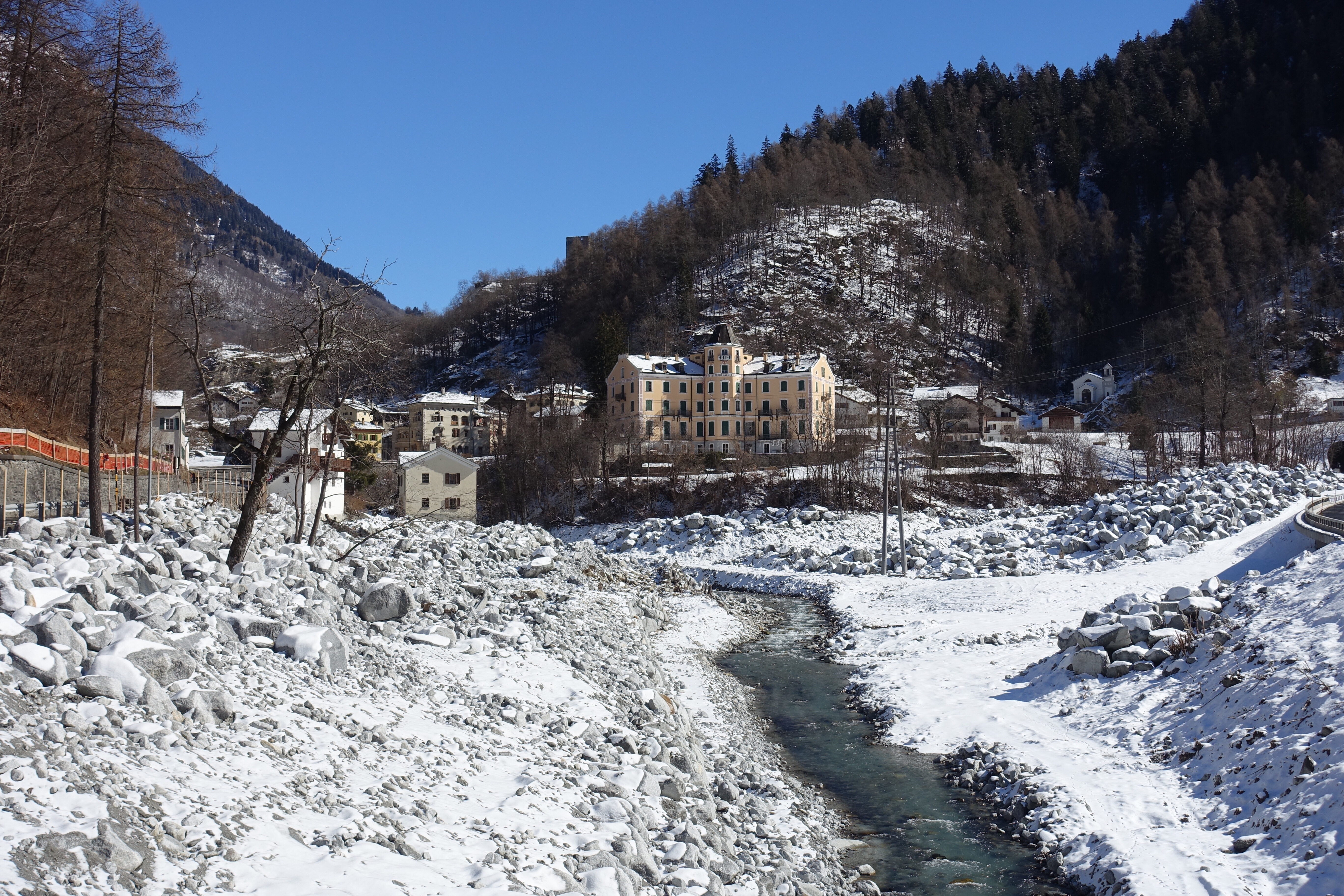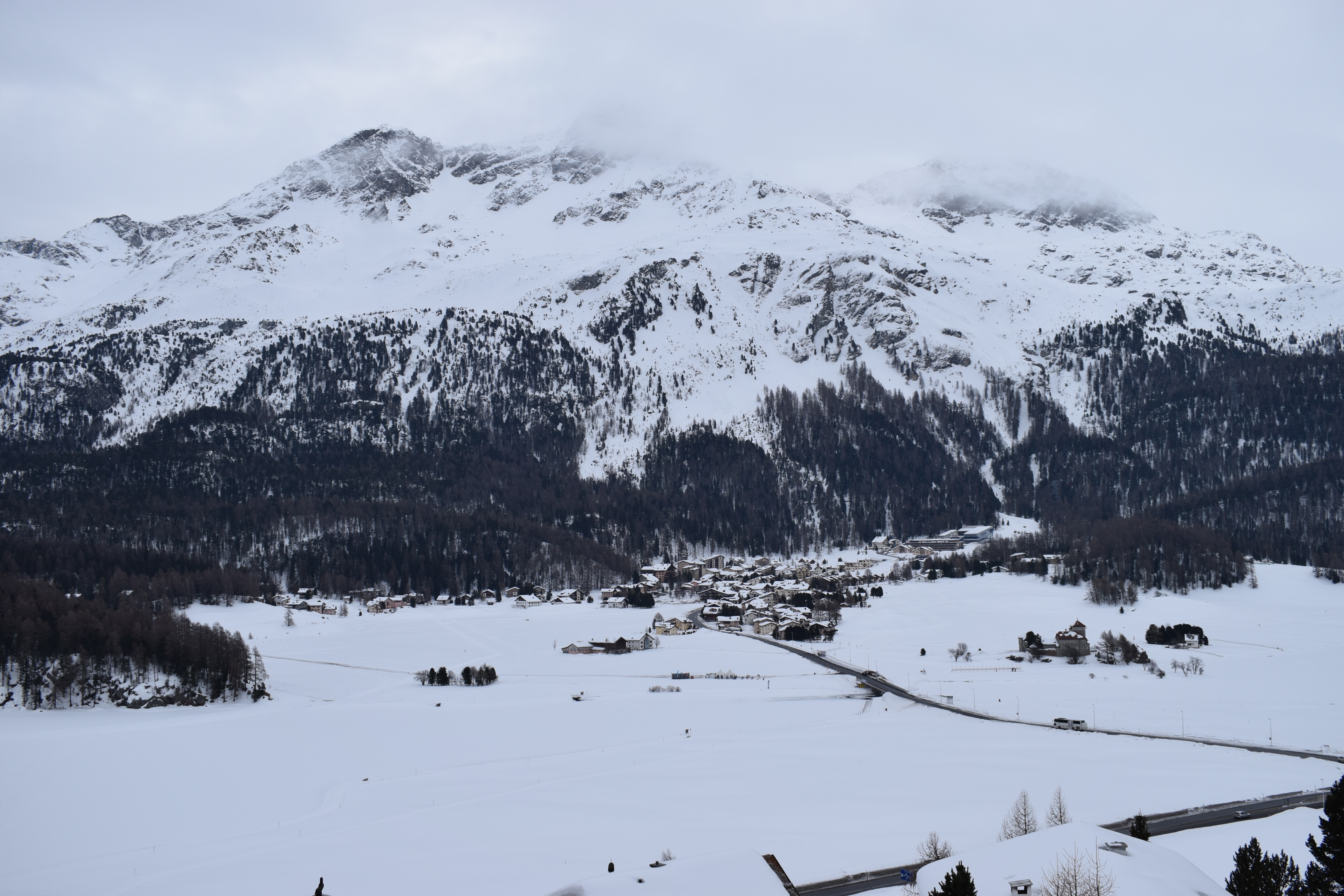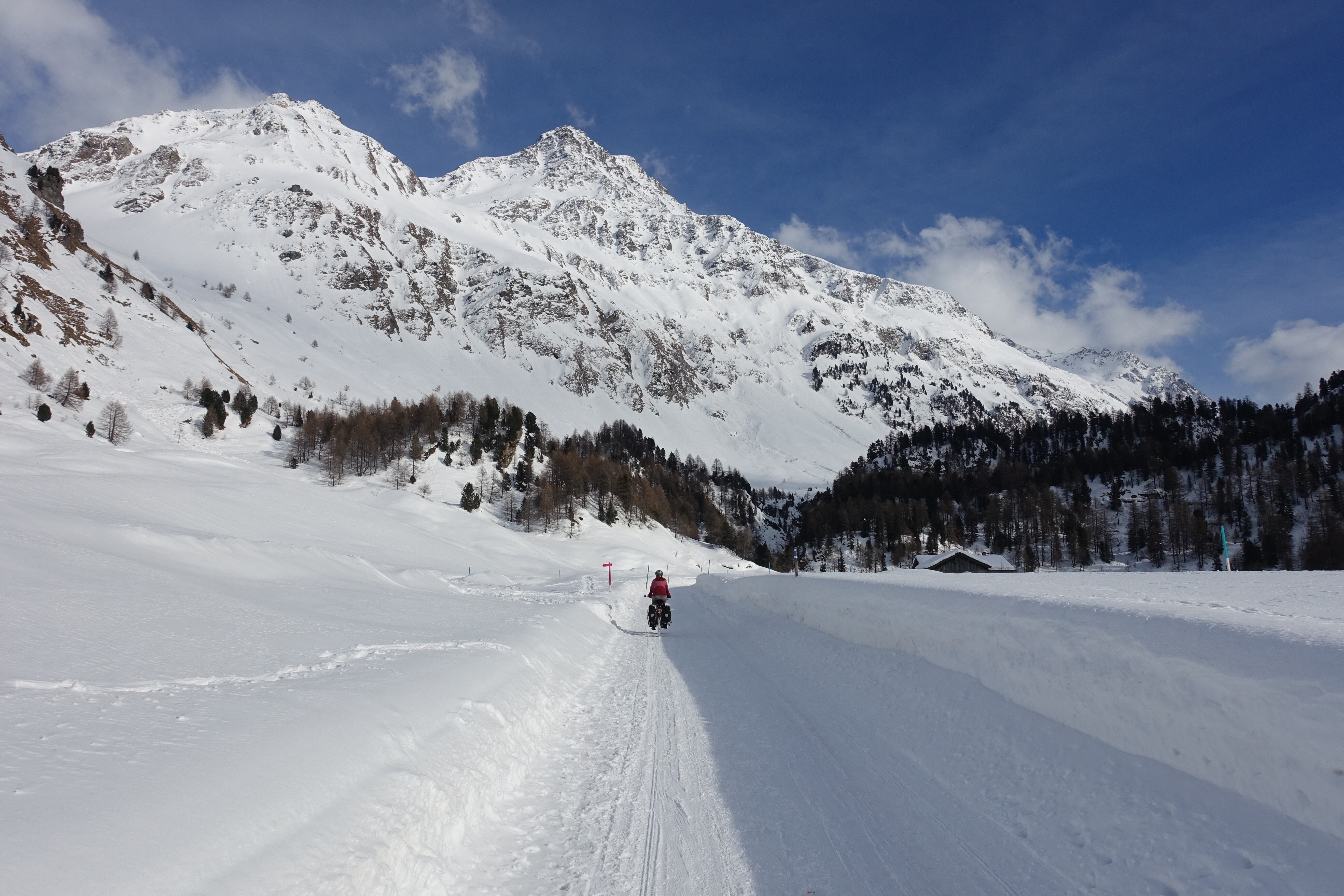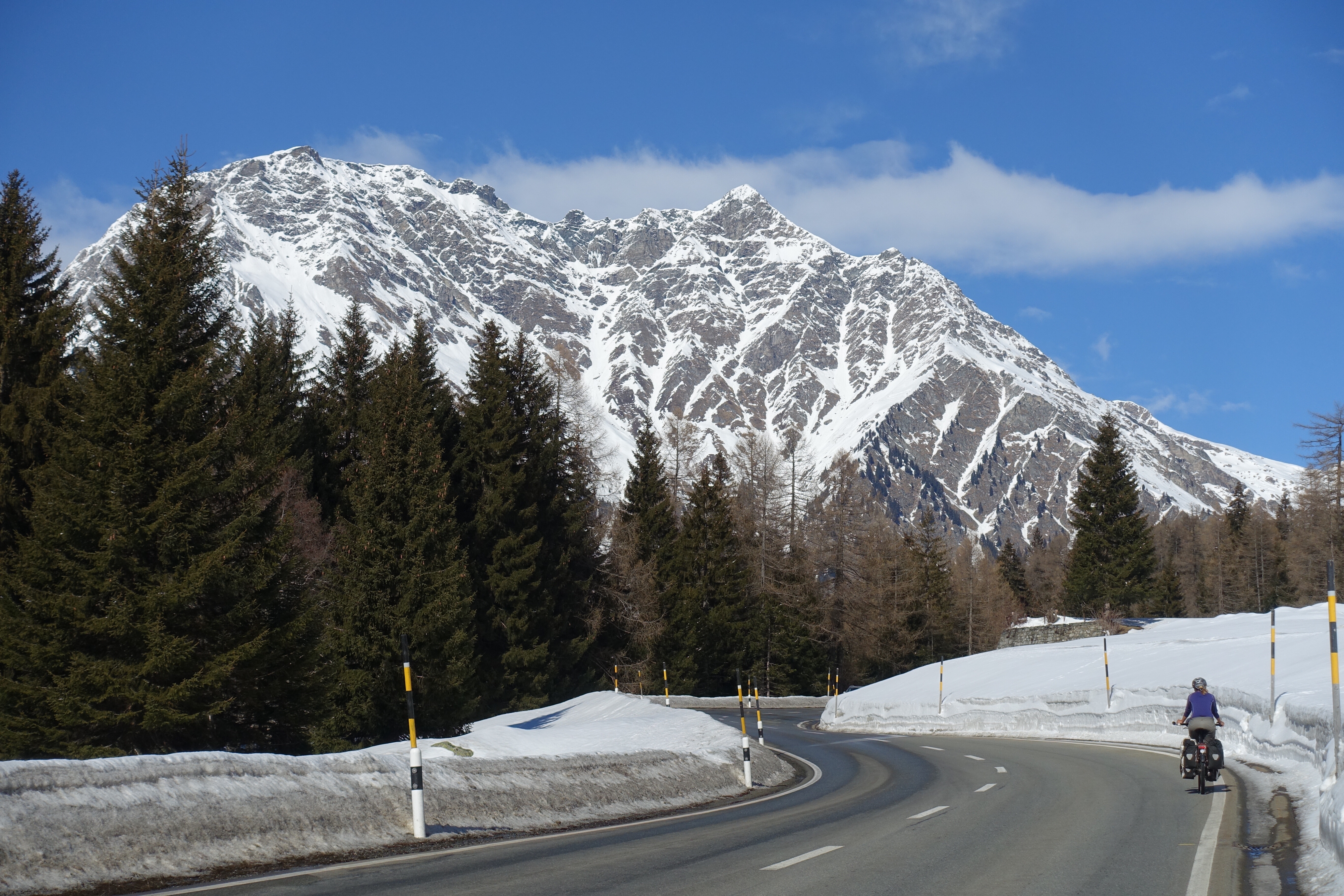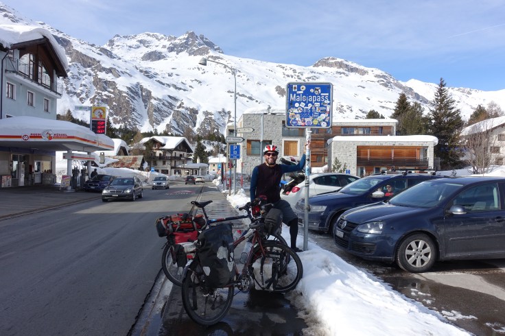 Le lendemain, c’est sous un soleil radieux que nous remontons le val Bregaglia, direction col de la Maloja et de la Haute Engadine. Nous passons la douane suisse comme deux vulgaires touristes, pas un contrôle, pas le moindre douanier au bord de la route. C’est la frontière la plus anonyme que nous traversons depuis 18 mois! A Maloja, nous posons les sacoches au centre de vacances Salecina, sorte d’auberge de jeunesse relativement abordable où les hôtes doivent participer aux tâches ménagères. L’établissement est littéralement rempli d’Allemands, l’ambiance est très communautaire, presque sectaire. Après le souper, grande discussion tous ensemble pour se présenter et distribuer les corvées. Mais le clou de la soirée restera le mini-débat (même pas animé!), parce que quelqu’un a rangé ses bâtons de skis dans le local à chaussures, au lieu de les placer dans le local à skis! Et naturellement, il ne faudrait pas que ça se reproduise! Je me demande qu’est-ce que je fous là, en regrettant déjà la spontanéité et la simplicité sud-américaine…
