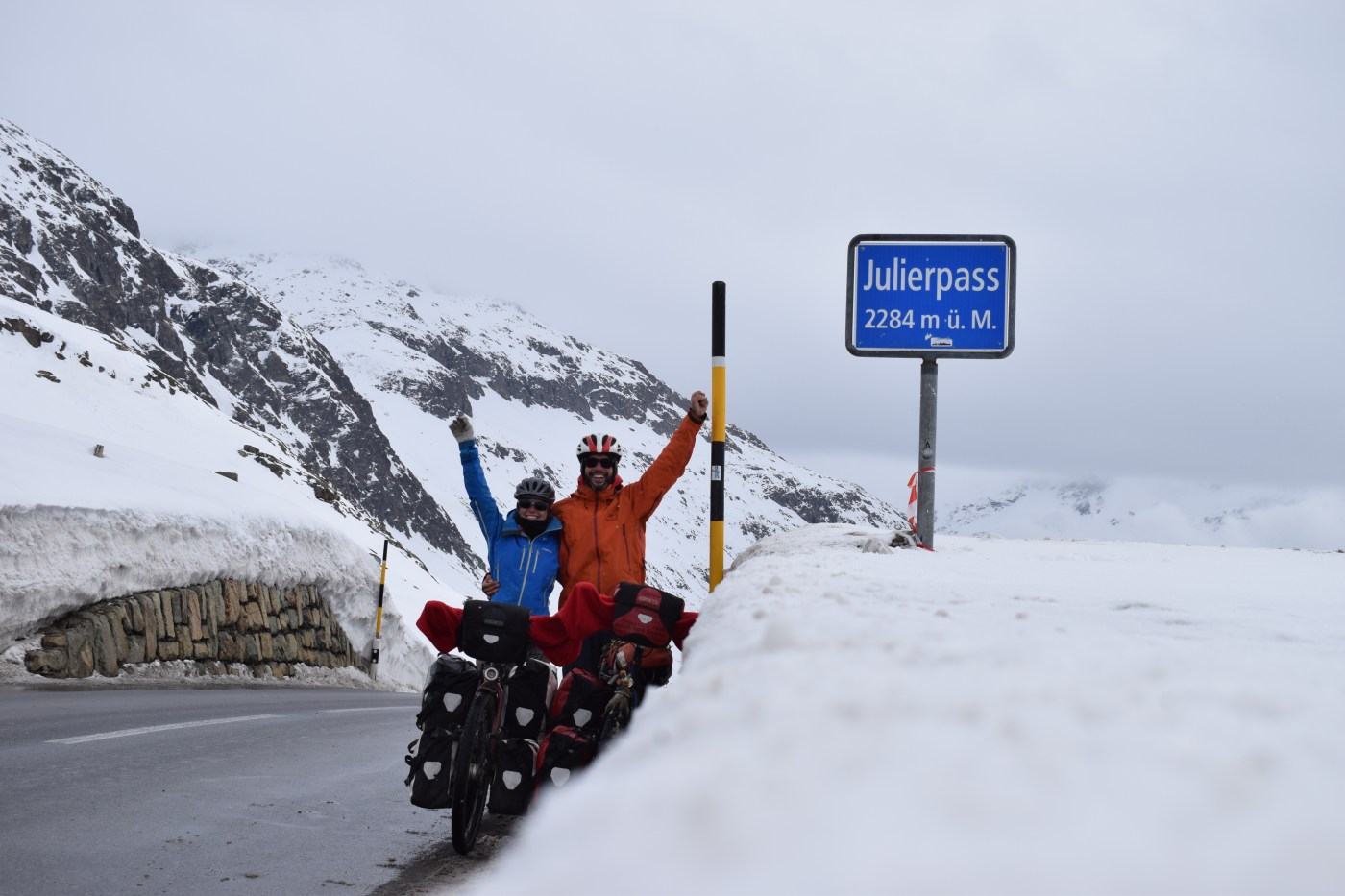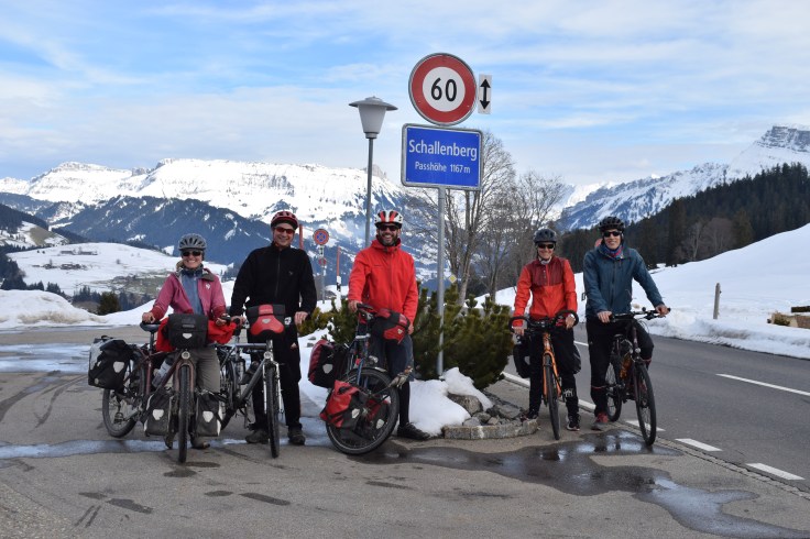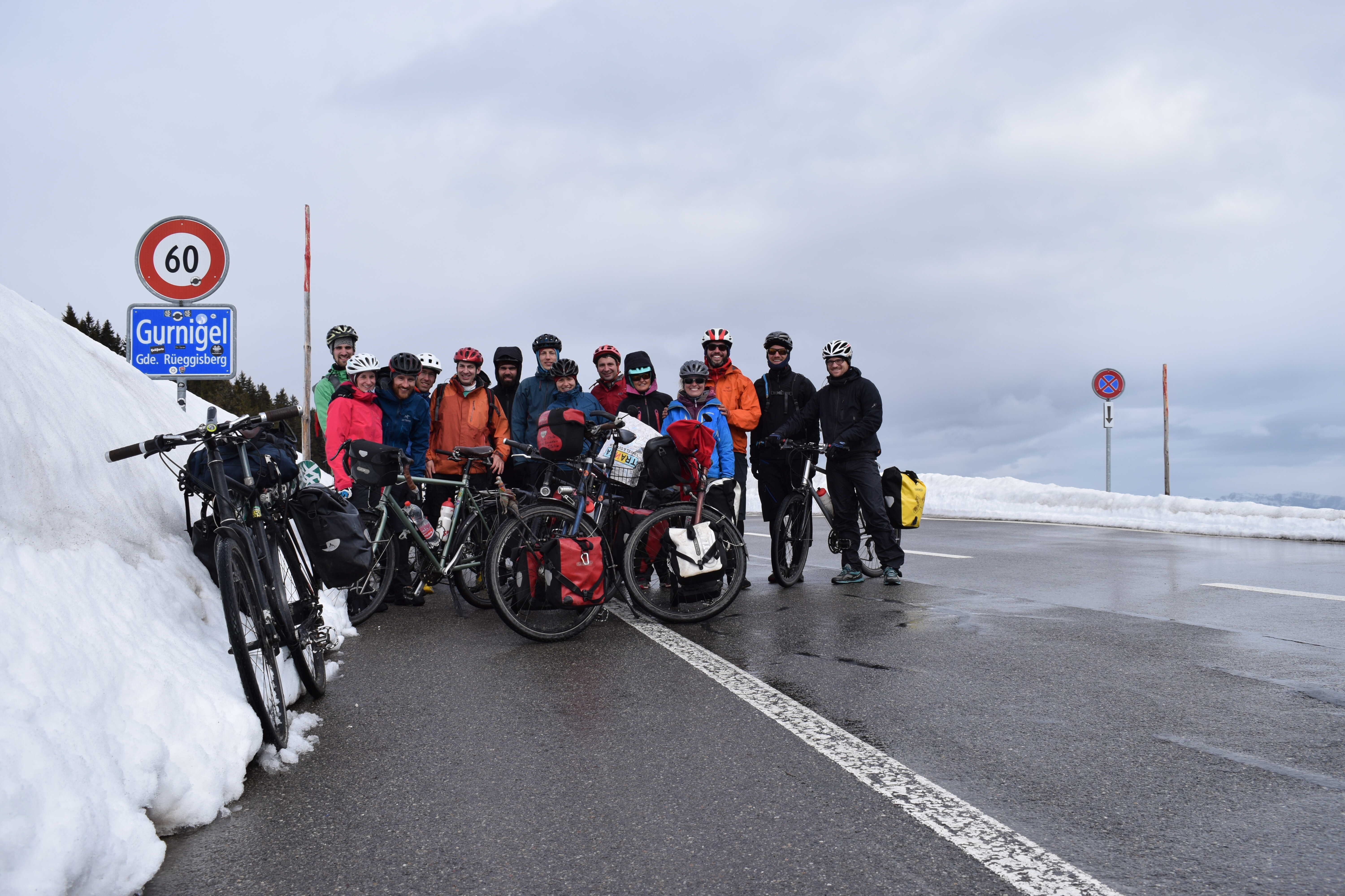 La suite passe par le col du Julier et sa descente glaciale pour nos mains mal équipées. A Bivio, nous buvons un bon thé pour permettre à nos organismes de se réchauffer. Les Alpes sont derrière nous, les retrouvailles avec les amis peuvent commencer! Après un café à Lenzerheide avec Claudia et Angela, nous mettons le cap sur Untervaz. Là, Seline et Dario nous reçoivent comme des rois! Les discussions vont bon train, il faut dire qu’après une si longue absence, il est grand temps de faire un update de nos vies respectives! L’expérience se répète à Lüthärtigen chez Cornel et Corina, à Zurich chez Reto et Sylvie, à Kriens chez Julia et Mattia et enfin à Berne chez Aurélie et Simon! Avec en sus de petites fêtes à Zurich et Berne! C’est donc sur les rotules mais heureux que nous avons l’honneur de partager l’avant-dernière étape avec Julia, Xavier et Simon ainsi que la dernière étape avec un peloton de 14 courageux (voir photo pour les noms) à l’assaut du Gurnigel, sous une pluie fine mais néanmoins transperçante! L’arrivée se fêtera dignement avec la famille, les amis et des fondues!