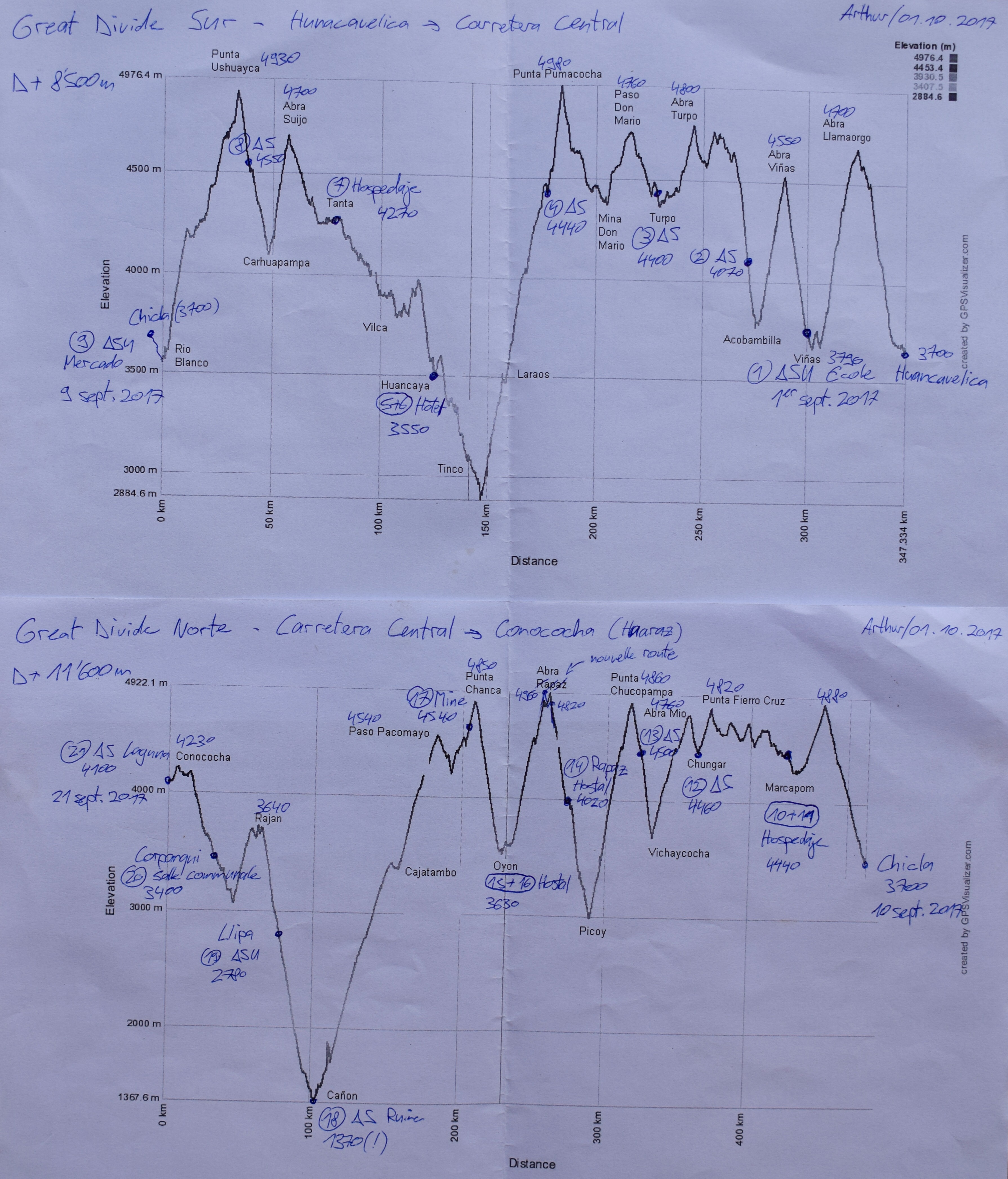 Pérou | Cusco – Huaraz | 17 août – 22 septembre 2017 | 1710 km (et 34’000m D+) en 31 jours de vélo (voir profils Great Divide ci-dessous)